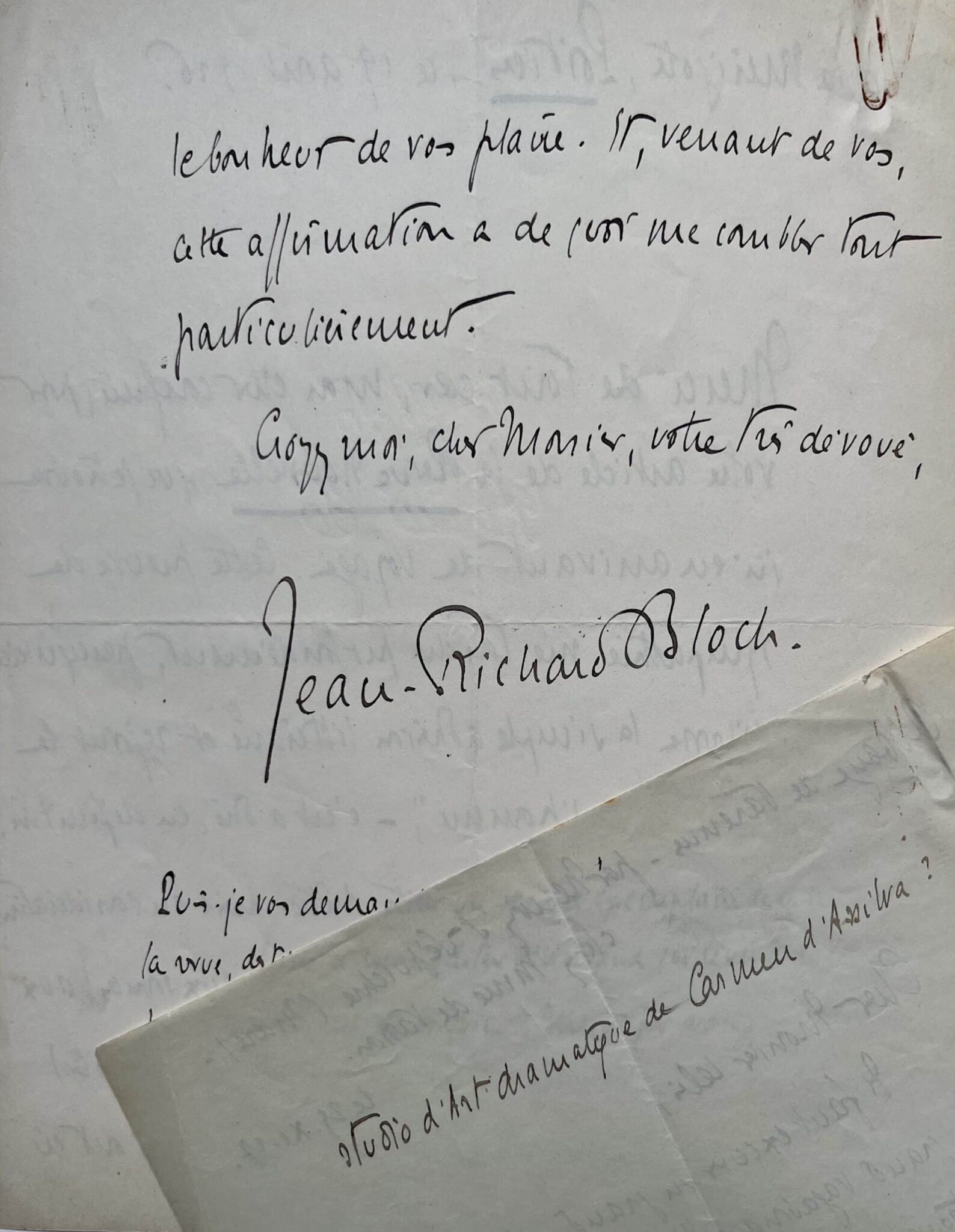 Jean Richard Bloch (Paris, 1884/1947)"Merci de tout cœur, mon cher Confrère, pour votre article de la Revue Nouvelle, que je trouve ici en arrivant de voyage. Cette preuve de sympathie me touche profondément, parce qu’elle dépasse la simple adhésion littéraire et rejoint le « système de l’homme », c’est-à-dire, en définitive, la seule chose qui mérite d’être prise en considération. Votre critique en effet remonte aux sources, aux causes, au système (j’ai envie de me répéter) organique d'où sont nées ces pages qui ont eu le bonheur de vous plaire. Et, venant de vous, cette affirmation a de quoi me combler tout particulièrement. [...] Puis-je vous demander un second exemplaire de ce numéro de la revue, destiné à mon éditeur allemand, qui réunit des témoignages pour le lancement du bouquin ? Merci par avance".