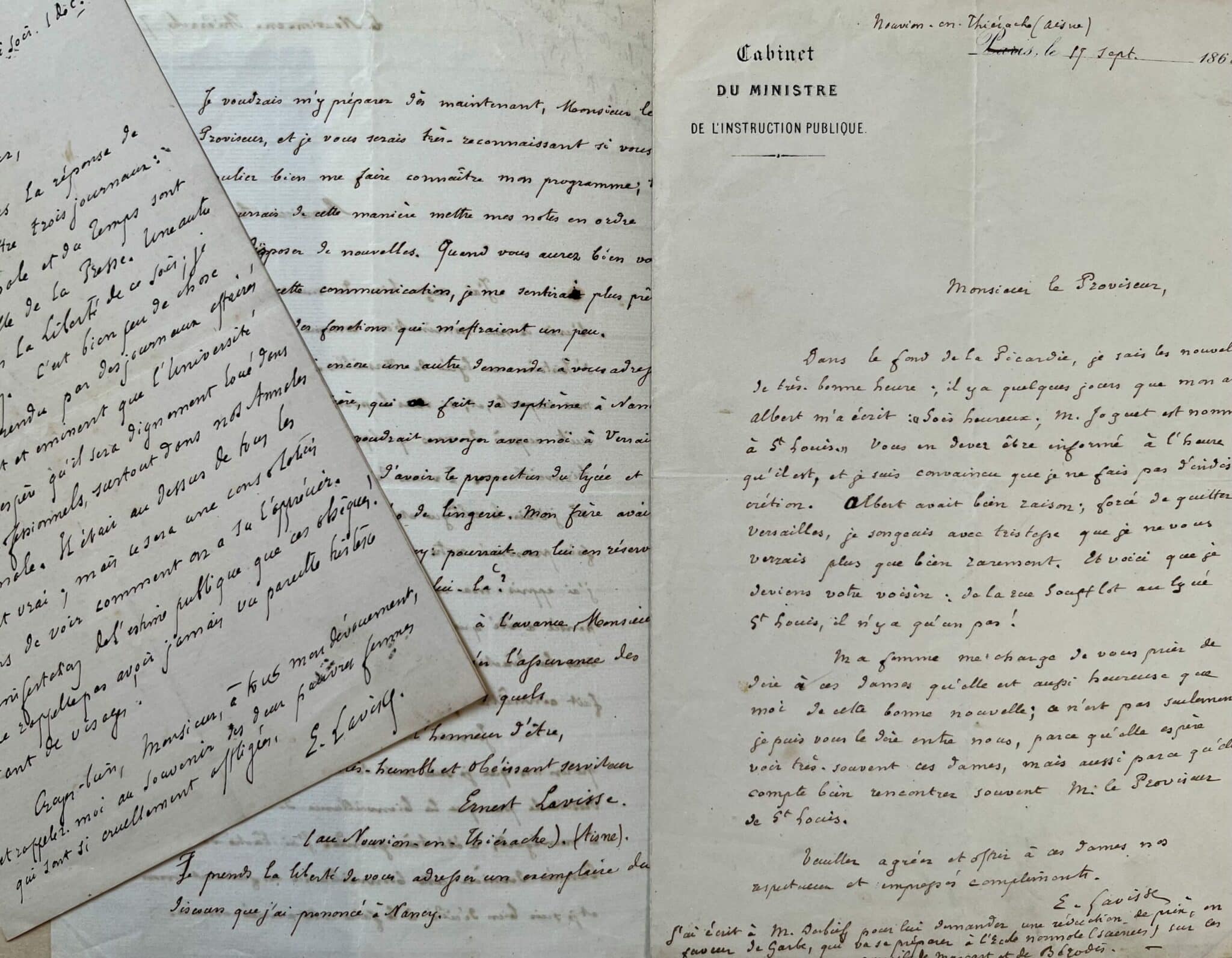 Deux lettres de l’historien Ernest Lavisse, alors jeune professeur, à son nouveau proviseur