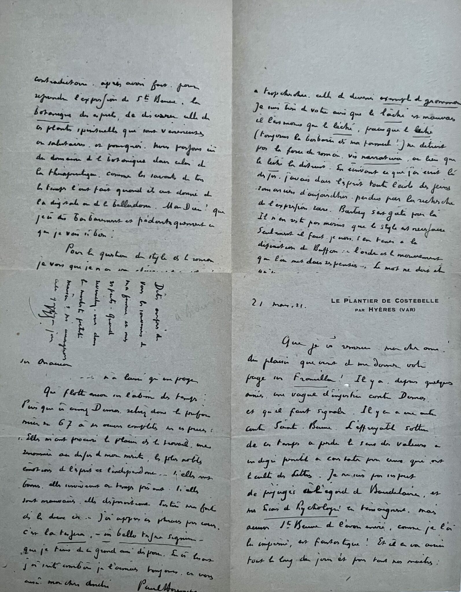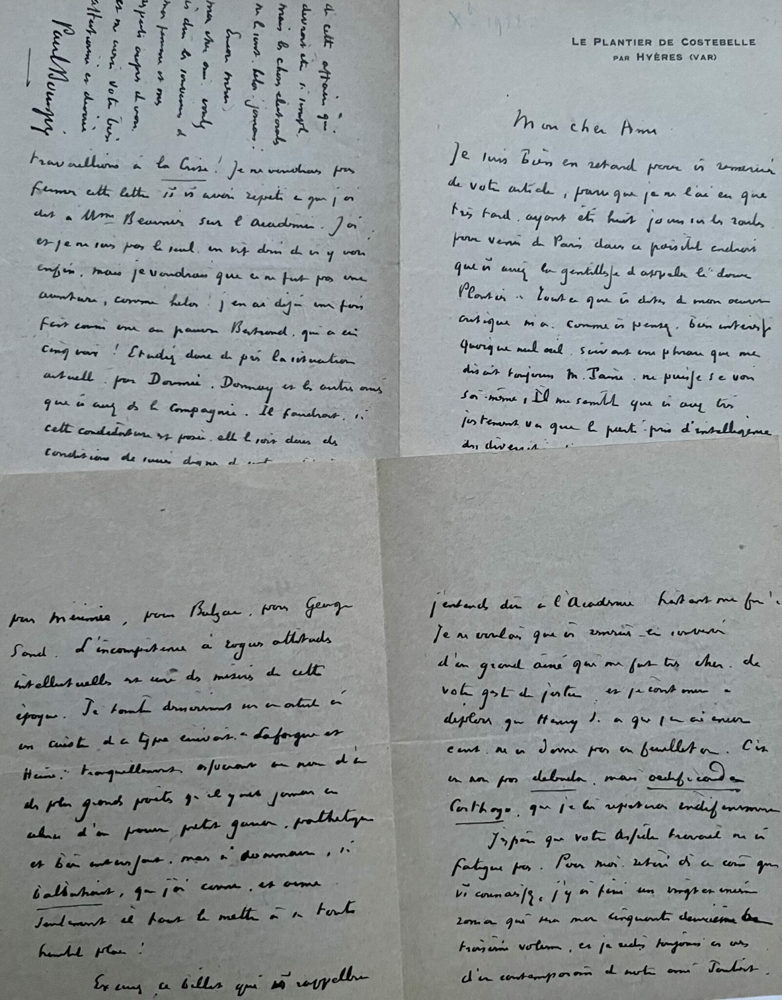 Dans une seconde lettre, il revient sur la question du style. "Pour la question du style dans le roman, je vois que je n'ai pas clairement expliqué ma pensée. Ce que j'ai voulu dire c'est qu'il faut fuir la qualité que Flaubert a trop cherchée, celle de devenir exemple de grammaire [...]. En écrivant ce que j'ai écrit là dessus, j'avais dans l'esprit toute l'école des jeunes romanciers d'aujourd'hui, perdus par la recherche de l'expression rare. Barbey s'est gâté par là. Il n'en reste pas moins que le style est nécessaire seulement il faut, je crois, s'en tenir à la définition de Buffon : "l'ordre et le mouvement que l'on met dans ses pensées". Le mot ne doit être qu'une notation exacte [...]". Il désire que son correspondant puisse, comme lui, rejoindre les bancs de l'Académie française, mais ne voudrait pas que sa candidature se transforme en une aventure amère. "Il faudrait, si cette candidature est posée, qu'elle le soit dans des conditions de succès dignes de votre noble travail de votre oeuvre déjà remarquable de critique et de romancier [...]".