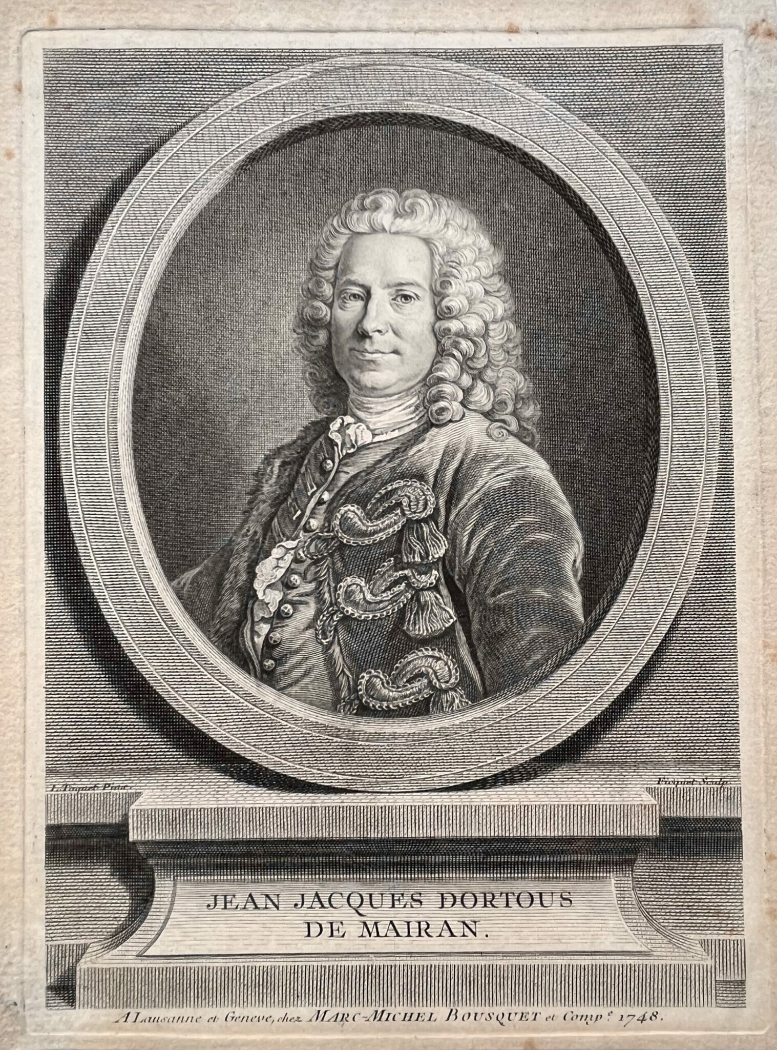 On joint un portrait gravé sur cuivre de Dortous de Mairan (publié à Lausanne et Genève en 1748). 24,6 x 18,6 cm.