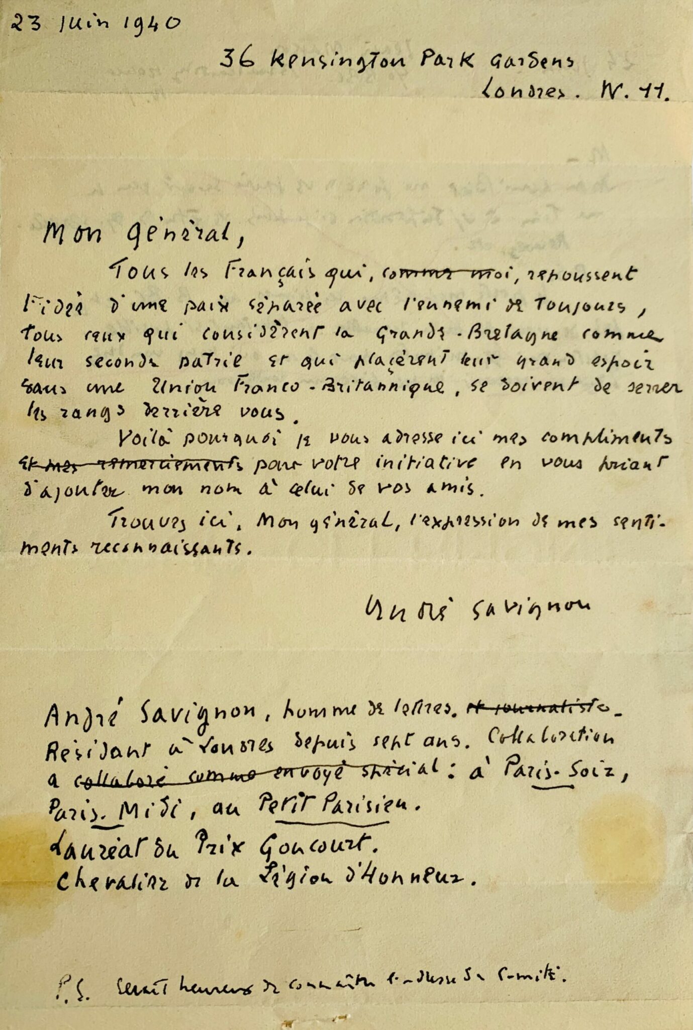 - Lettre autographe signée (brouillon) d'André Savignon au général de Gaulle (23 juin 1940, 1 p. in-8, pliures, trous d'agrafe et petites auréoles). Alors correspondant de Paris-Soir et Paris-Midi à Londres, il répond à l'appel du 18 juin. "Mon général, Tous les Français qui, comme moi, repoussent l'idée d'une paix séparée avec l'ennemi de toujours, tous ceux qui considèrent la Grande-Bretagne comme leur seconde patrie et qui placèrent leur grand espoir dans une Union Franco-Britannique, se doivent de serrer les rangs derrière vous. Voilà pourquoi je vous adresse ici mes compliments pour votre initiative en vous priant d'ajouter mon nom à celui de vos amis. Trouvez ici, mon général, l'expression de mes sentiments reconnaissants. André Savignon". Il précise, à la suite, ses qualités : "homme de lettres et journaliste, résident à Londres depuis sept ans. Collaboration à Paris-Soir, Paris-Midi, au Petit Parisien. Lauréat du Prix Goncourt. Chevalier de la Légion d'Honneur. P.S. serait heureux de connaître l'adresse du Comité".