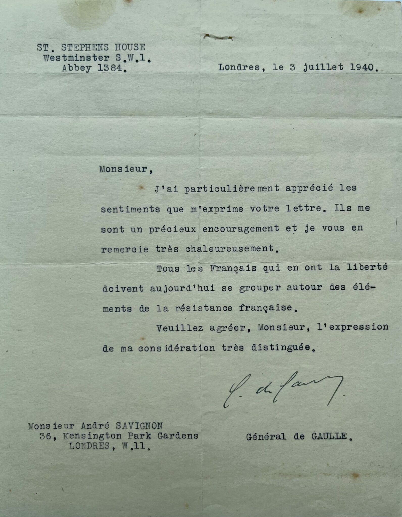 - De Gaulle lui répond le 3 juillet 1940 : "Monsieur. J'ai particulièrement apprécié les sentiments que m'exprime votre lettre. Ils me sont un précieux encouragement et je vous en remercie très chaleureusement. Tous les Français qui en ont la liberté doivent aujourd'hui se grouper autour des éléments de la résistance française. Veuillez agréer, Monsieur, l'expression de ma considération très distinguée. C. de Gaulle [...]".