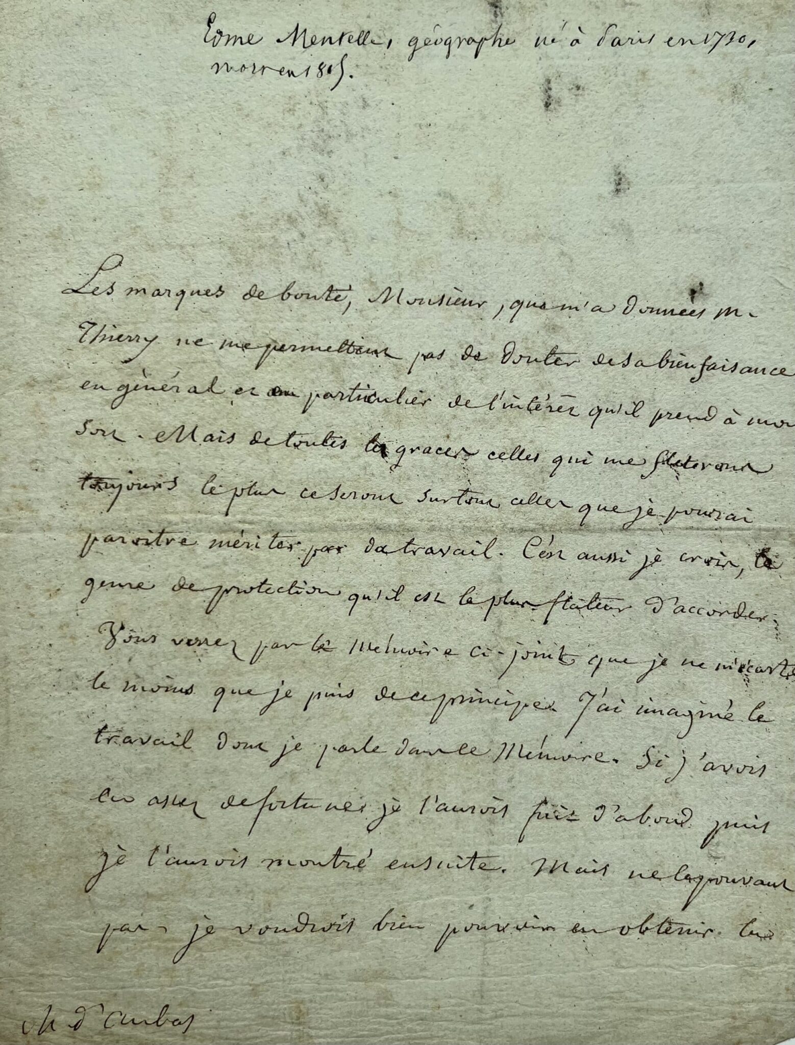'[...] J'ai imaginé le travail dont je parle dans le Mémoire. Si j'avois là assez de fortune je l'aurois fait d'abord puis je l'aurois montré ensuite. Mais ne le pouvant pas, je voudrois bien pouvoir en obtenir en possibilité. Le Roy aime la Géographie. Ne serait-il pas infiniment curieux pour S. M. de pouvoir se rendre compte à la simple vue de l'état ancien de la Géographie. Et ne serait-il pas digne de son amour pour les sciences d'en protéger la publication. Je ne sais pas ce que le Roi peut accorder chaque année à des travaux de ce genre [...]". Mentelle précise que l'argent ne serait pas pour lui, mais pour réaliser son œuvre, la vente des cartes par la suite lui procurera du profit.