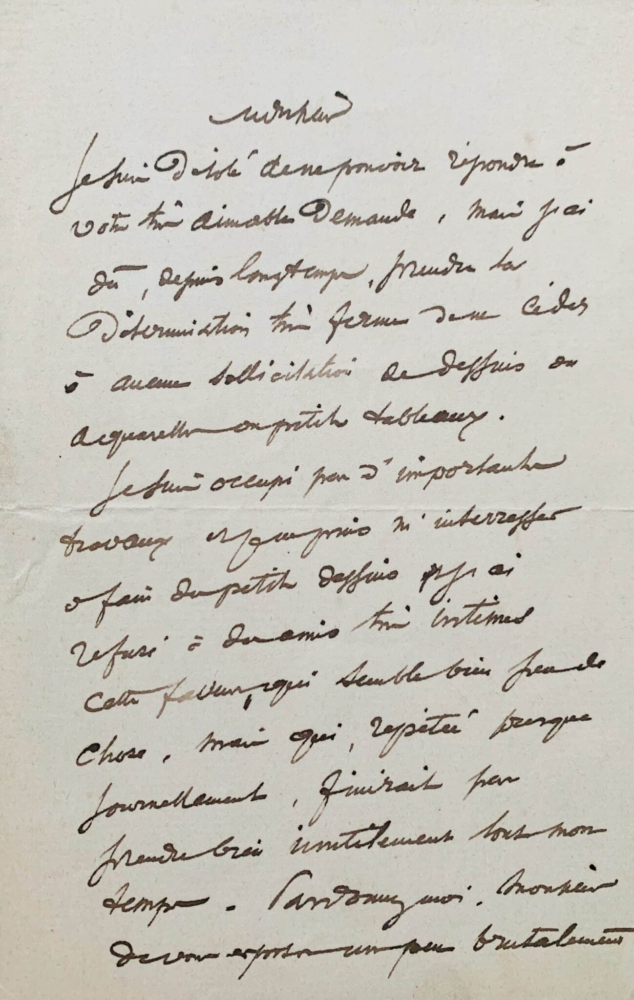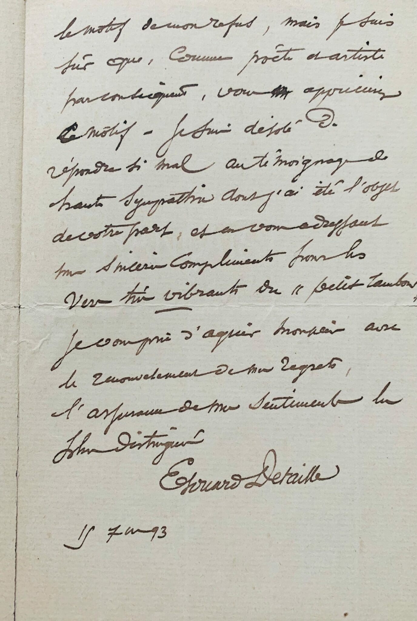 "J'ai dû, depuis longtemps, prendre la détermination ferme de ne céder à aucune sollicitation de dessins ou aquarelles ou petits tableaux. Je suis occupé par d'importants travaux et je ne puis m'intéresser à faire des petits dessins. J'ai refusé à des amis très intimes cette faveur, qui semble bien peu de chose, mais qui, répétée presque journellement, finirait par prendre bien inutilement tout mon temps. Pardonnez-moi, monsieur, de vous exposer un peu brutalement le motif de mon refus, mais je suis sûr que, comme poète et artiste par conséquent, vous apprécierez ce motif. Je suis désolé de répondre si mal au témoignage de haute sympathie dont j'ai été l'objet de votre part, et en vous adressant mes très sincères compliments pour les vers très vibrants du "petit tambour" [...]".