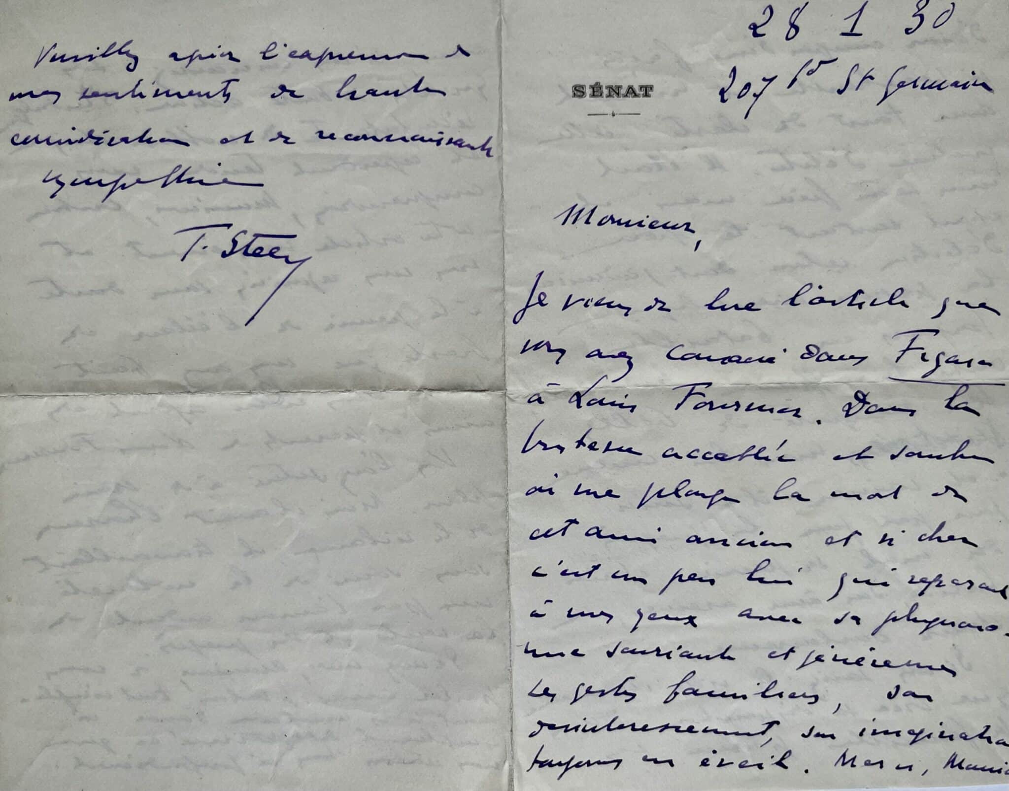 Théodore Steeg (Libourne, 1868/1950)Théodore Steeg vient de lire dans Le Figaro l'article de Maurice de Fleury consacré à feu son ami Louis Fournier (1867-1930), bactériologiste et syphiligraphe, chef de service à l'hôpital Cochin et fondateur de la collection "Bibliothèque du doctorat en médecine", chez Baillière. "C'est un peu lui qui reparait à mes yeux avec sa physionomie souriante et généreuse, ses gestes familiers, son désintéressement, son imagination toujours en éveil. Merci, Maurice, d'avoir compris d'une façon si pénétrante et traduit avec tant de clarté cette nature d'élite. Il était mon beau frère mais il était surtout le frère d'élection, celui dont j'admirais la passion scientifique toujours en bataille contre la souffrance humaine. Il a remporté de belles batailles [...]. Si vous saviez le vide immense que crée sa disparition [...]".