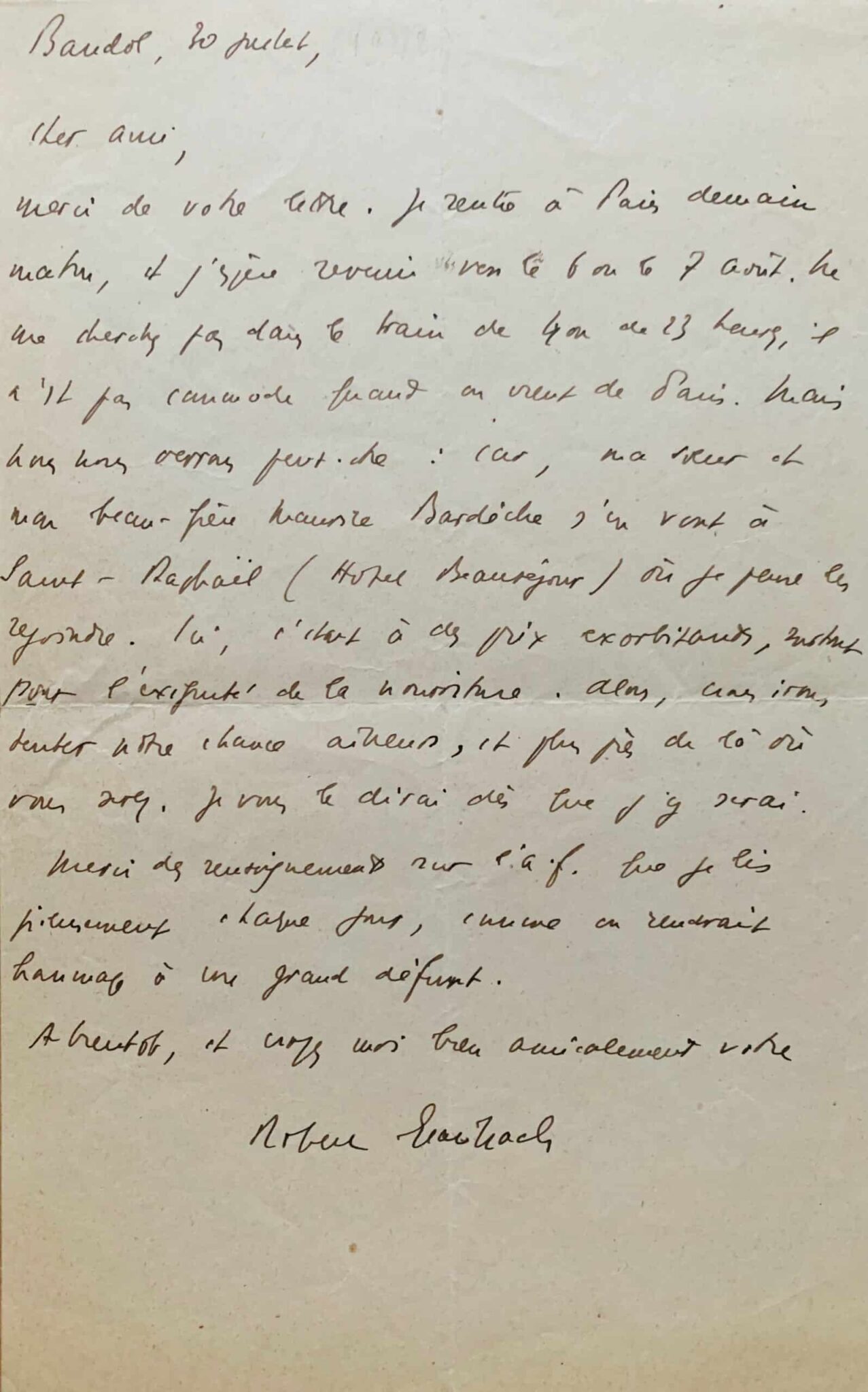"Je rentre à Paris demain matin, et j'espère revenir vers le 6 ou 7 août. Ne me cherchez pas dans le train de Lyon de 23 heures, il n'est pas commode quand on vient de Paris. Mais nous nous verrons peut-être car ma soeur et mon beau-frère Maurice Bardèche s'en vont à Saint-Raphaël (Hôtel Beauséjour) où je pense les rejoindre. Ici, c'était à des prix exorbitants, surtout pour l'exiguïté de la nourriture. Alors, nous irons tenter notre chance ailleurs, et plus près de là où vous serez. Je vous le dirai dès que j'y serai.
