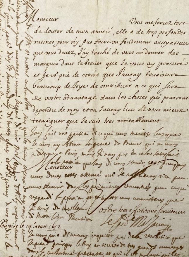 "Monsieur, vous me feriez tort de douter de mon amitié, elle a de trop profondes racines pour n'y pas faire un fondement aussy asseuré que vous devez, j'ay tasché de vous en donner des marques dans le brevet que je vous ay procuré, et je vous prie de croire que j'auray tousjours beaucoup de joye de contribuer a ce qui sera de vostre advantage dans les choses qui pourront dependre de moy et ou j'auray lieu de vous mieux tesmoigner que je suis trés véritablement, Monsieur, vostre trés affectionné serviteur".