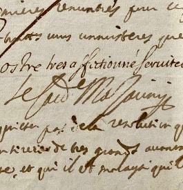 Mazarin signe et ajoute, de sa main : "J'ay fait une partie de ce que vous merités lorsque je vous ay obtenu la grace du brevet que on vous a donné a Paris, mais je n'ay pas en cela satisfait a la passion que j'ay de vous servir, c'est pourquoy vous devés estes asseuré que je n'oblieray rien pour vous servir dans les premieres rencontres pour ce qui resgarde la pension et en outre vous connoisterés que je suis du meilleur de mon cœur [...]. Je vous prie de ne vous inquieter pas de la resolution que je prend puisque le roy en tirera de trés grands avantages dans la conjonture presente, et qu'il est malaysé que les affaires de S[a] M[ajesté] se mettent en bon estat sans que les miens et ceux de mes amis n'en retirent un grand avantage. Comme j'espere de voir Mr l'esveque d'Alby [Gaspard de Daillon Du Lude, resté fidèle à la royauté durant la Fronde] auperavant que la Court parte d'isy, je l'entretiendray de touttes choses et lors le prieray de vous en dire le destail comme a une personne que je crois de mes meilleurs amis".