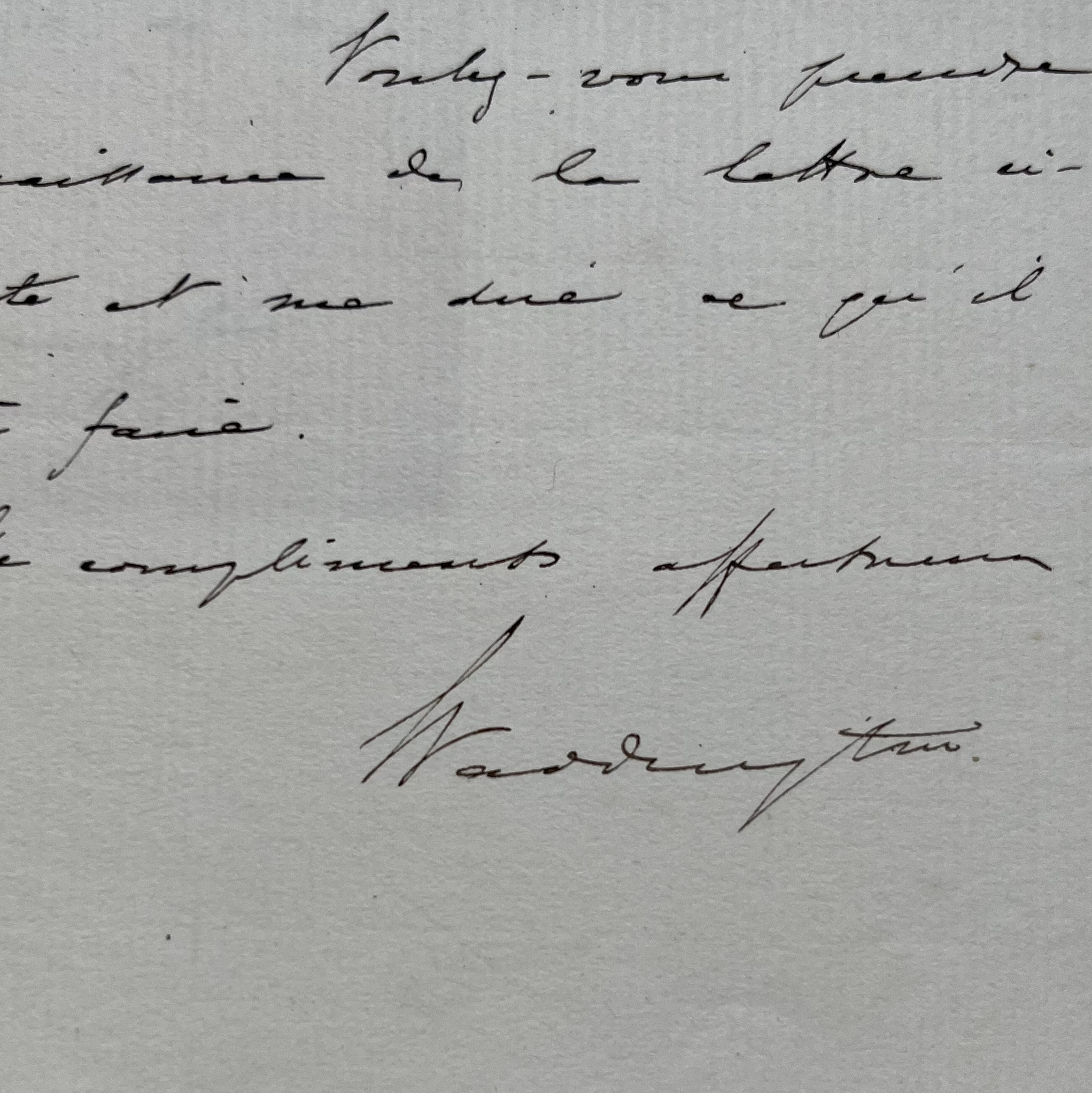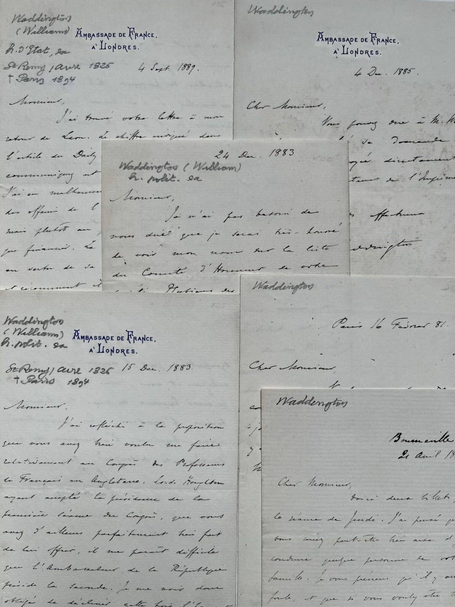 William Waddington (Saint-Rémy-sur-Avre, 1826 /1894 )Waddington accepte de faire partie d'un comité d'honneur, dont plusieurs de ses amis et confrères de l'Institut sont déjà membres ; il transmet un document à Wetzel, directeur de l'imprimerie nationale et décline la présidence de la deuxième séance du Congrès des Professeurs de français en Angleterre, après que la première ait été présidée par Lord Houghton [Richard Monckton Milnes (1809-1885)]. Dans un autre courrier, Waddington s'insurge contre le chiffre "ridicule" donné dans un article du Daily Telegraph et doit s'occuper "des affaires de l'Eglise française de Londres", etc.