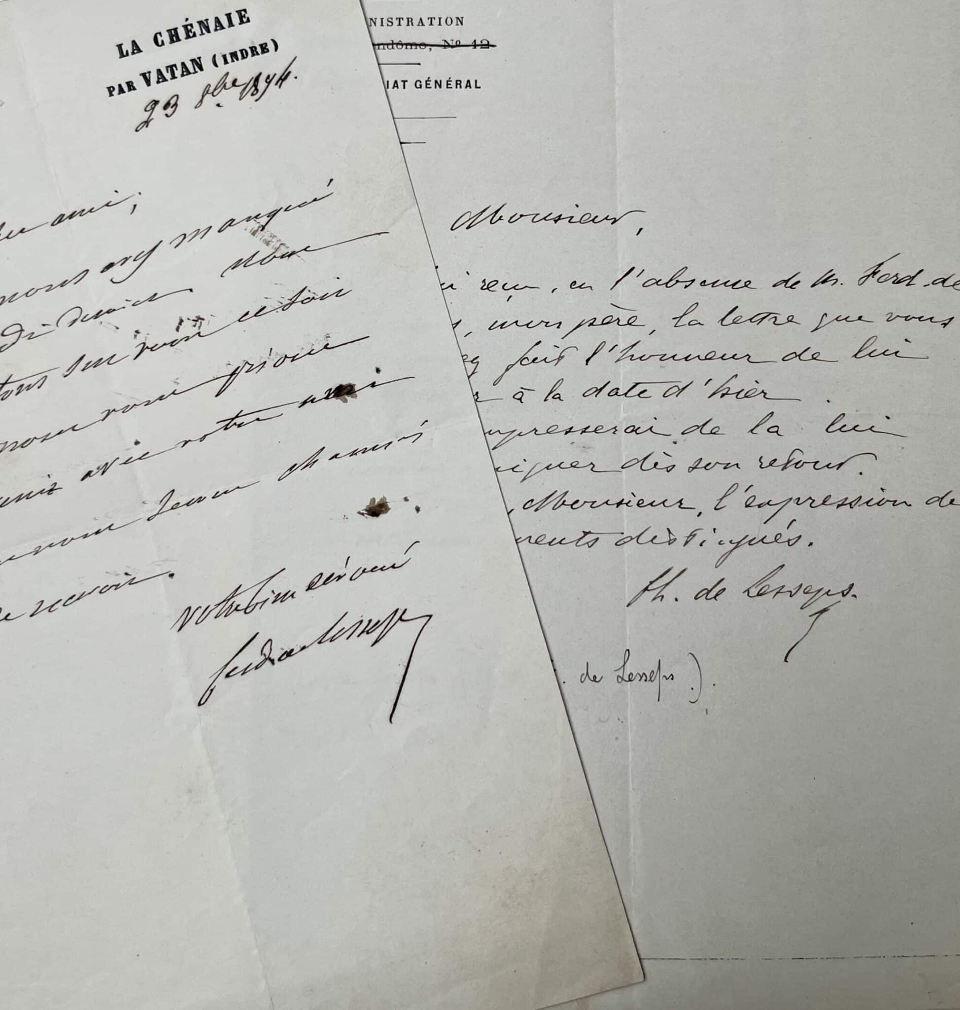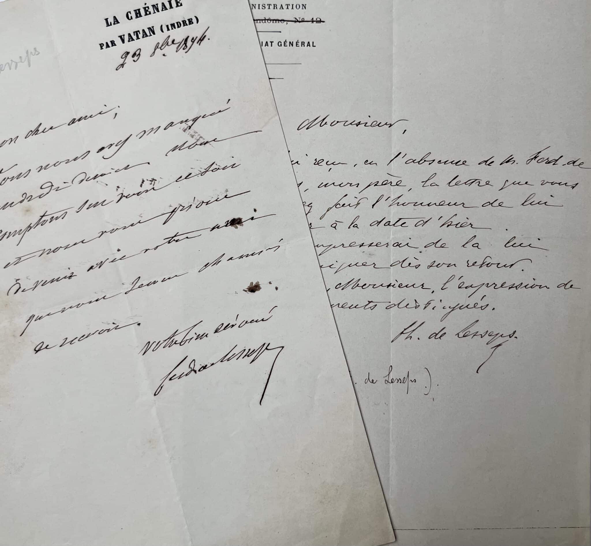 - Ferdinand de LESSEPS. L.A.S. 1 p. in-8. La Chênaie (Indre), 23 octobre 1894. Une des toutes dernières lettres de Ferdinand de Lesseps qui décèdera peu après (le 7 décembre). "Mon cher ami, vous nous avez manqué vendredi dernier. Nous comptons sur vous ce soir et nous vous prions de venir avec votre ami que nous serions charmé de recevoir. Votre bien dévoué Ferdinand de Lesseps". En-tête "La Chénaie par Vartan (Indre)".