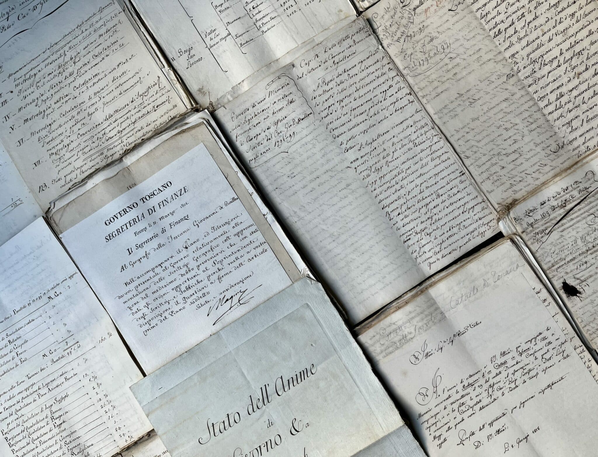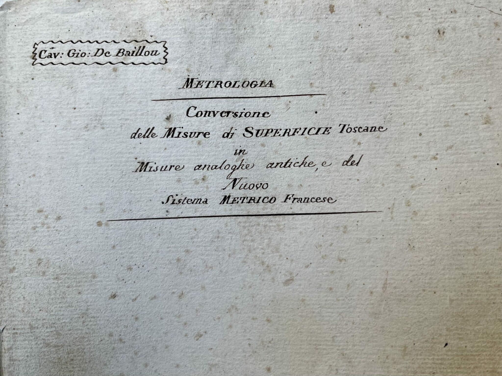 Il contient notamment : États de la population dans le royaume d’Étrurie (1803). Dossier relatif au découpage administratif et à la population des communes : Riquadratura delle Comunità della Toscana (1808). Conférence sur la géographie antique prononcée par Baillou à la Societa Colombaria de Florence (29 avril 1812). Mémoire sur la rédaction d’un cadastre en Toscane, avec lettre d’envoi de Baillou au vice-président de l’Académie des Georgofili (1818). Relevés géométriques et cadastraux (latitudes, hectares), de divers lieux dans les départements de l’Arno, de la Méditerranée et de l’Ombrone. Dossier relatif à la conversion de l’ancienne mesure de la superficie toscane, au nouveau système métrique français, etc. Affiches et affichettes donnant des tarifs officiels de monnaies, poids, alcool. Correspondance émise et reçue par Baillou, nominations au service géographique, etc.