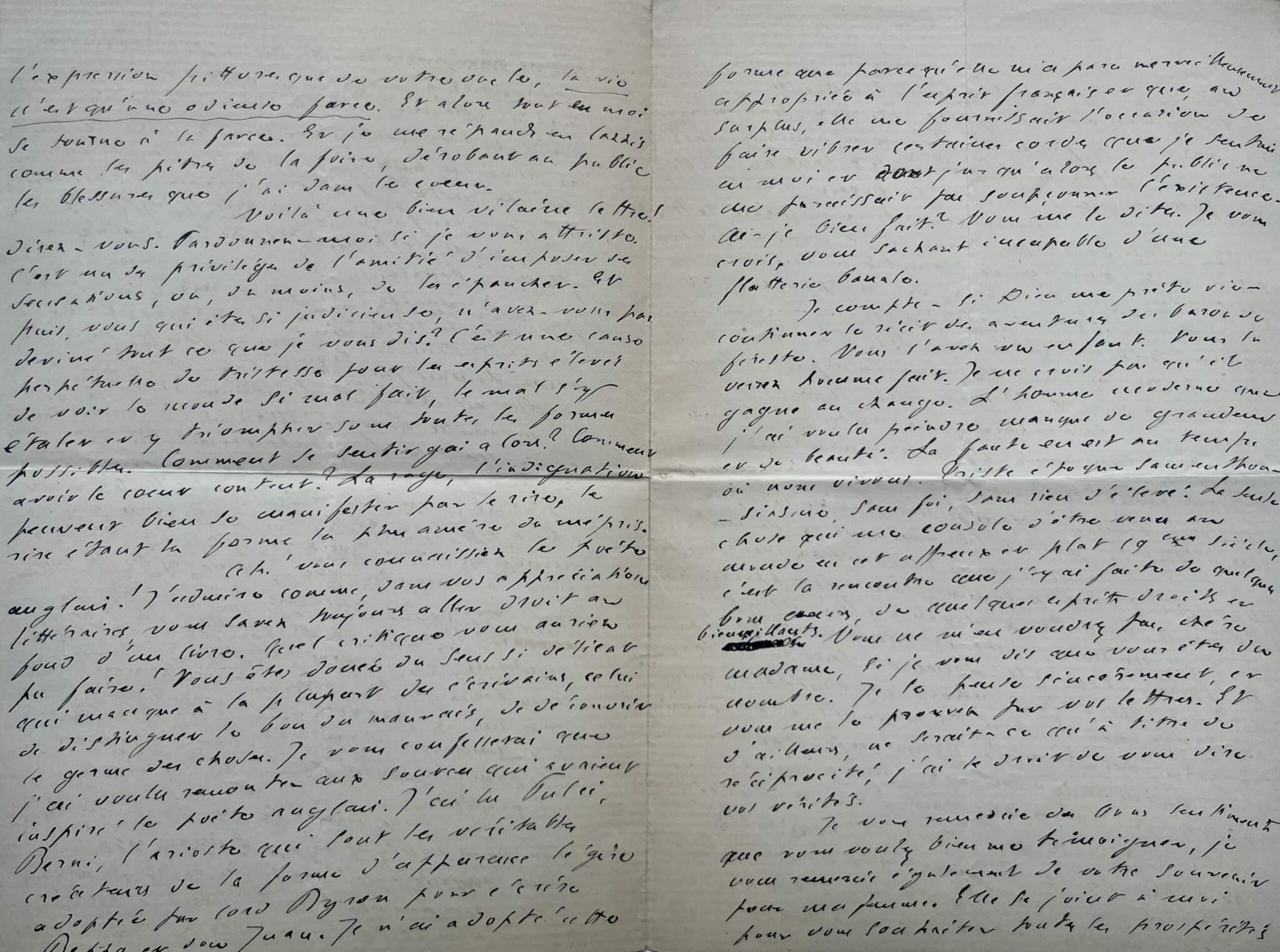 Le baron de Féreste vous a amusée. Franchement, cela ne m’étonne pas. Le récit de ses aventures renferme le condiment le plus indispensable pour plaire aux esprits réfléchis : la gaieté ! Merci, chère Madame, vous qui savez lire, n'avez-vous pas senti que cette gaîté était voulue, sinon forcée et que sous ma frivolité apparente, se dissimulait mal une tristesse noire ? C'est une chose singulière que les petits malheurs me mettent en colère et que le désespoir me fasse prendre les choses par le côté comique. Plus je vais, plus je souffre de maux immérités, plus je sens que [...] la vie n’est qu’une odieuse farce. [...] Voilà une bien vilaine lettre, direz-vous. Pardonnez-moi si je vous attriste. C’est un des privilèges de l’amitié, d’imposer, ses sensations, ou, du moins, de les épancher. Et puis, vous êtes si judicieuse, n’avez-vous pas deviné tout ce que je vous dis ? C’est une cause perpétuelle de tristesse pour les esprits élevés [...]. Ah! vous connaissiez le poète anglais! J'admire comme, sous vos appréciations littéraires, vous savez toujours aller droit au fond d'un livre. Quel critique vous auriez pu faire! Vous êtes douée au sens si délicat qui manque à la plupart des écrivains, celui de distinguer le bon du mauvais, de découvrir le germe des choses. Je vous confesserai que j'ai voulu remonter aux sources qui avaient inspiré le poète anglais. J'ai lu Pulci, Berni, l'Arioste qui sont les véritables créateurs de la forme d'apparence légère adoptée par lord Byron pour écrire Beppo et son Dom Juan. Je n'ai adopté cette forme que parce qu'elle m'a paru merveilleusement appropriée à l'esprit français et que, au surplus, elle me fournissait l'occasion de faire vibrer certaines cordes que je sentais en moi et dont jusqu'alors le public ne ma paraissait pas soupçonner l'existence [...]".