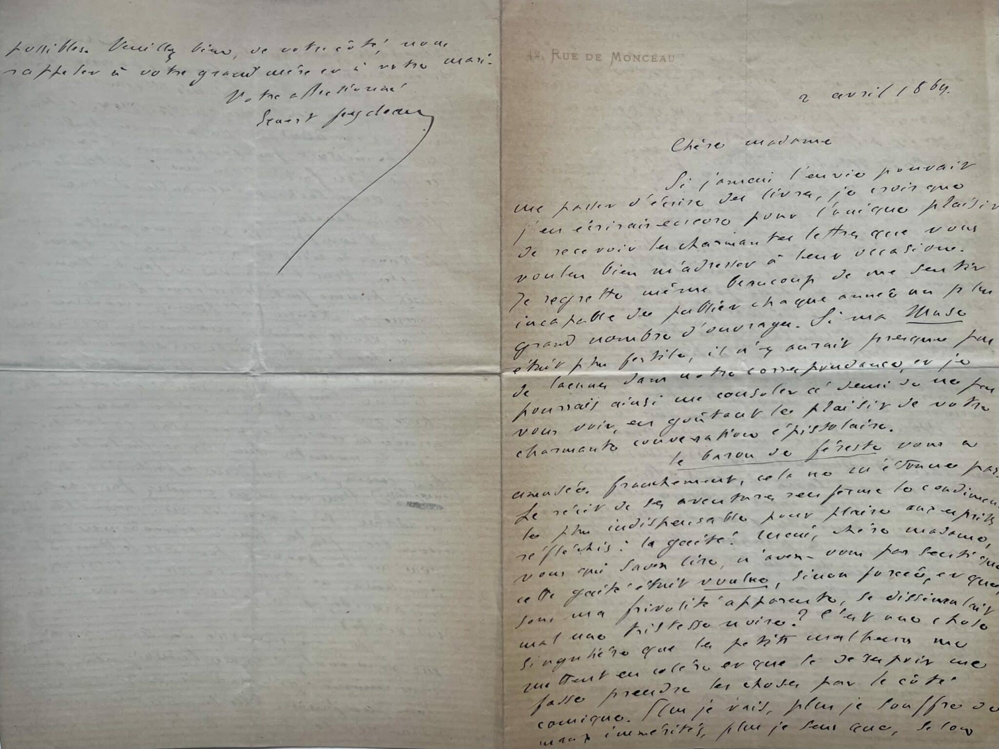 "Si jamais l’envie pouvait me passer d’écrire des livres, je crois que j’en écrirais encore pour l'unique plaisir de recevoir les charmantes lettres que vous voulez bien m’adresser à leur occasion. Je regrette même beaucoup de me sentir incapable de publier chaque année un plus grand nombre d’ouvrages. Si ma Muse était plus fertile, il n’y aurait presque pas de lacunes dans notre correspondance, et je pourrais ainsi me consoler à demi de ne pas vous voir, en goûtant le plaisir de votre charmante conversation épistolaire.