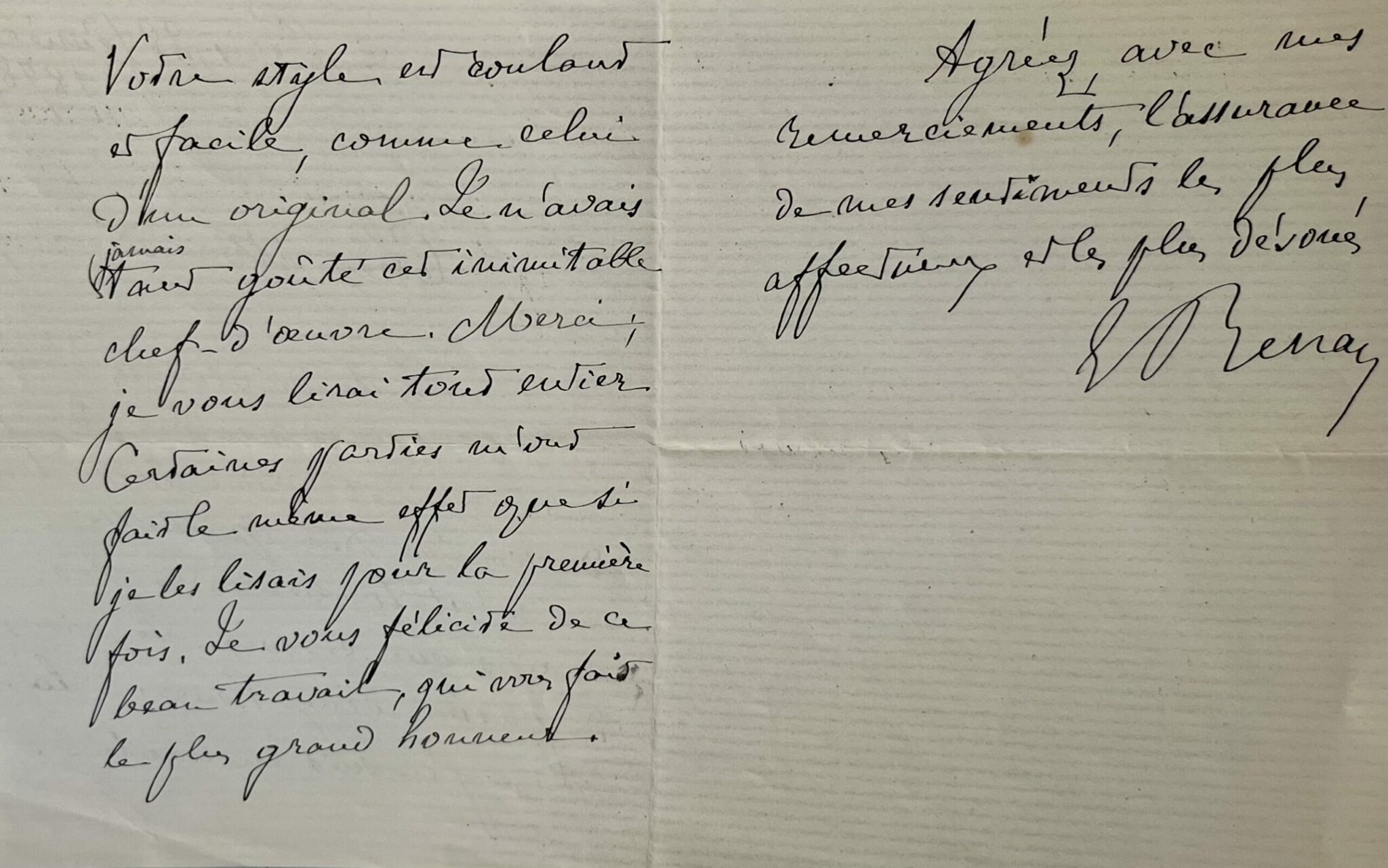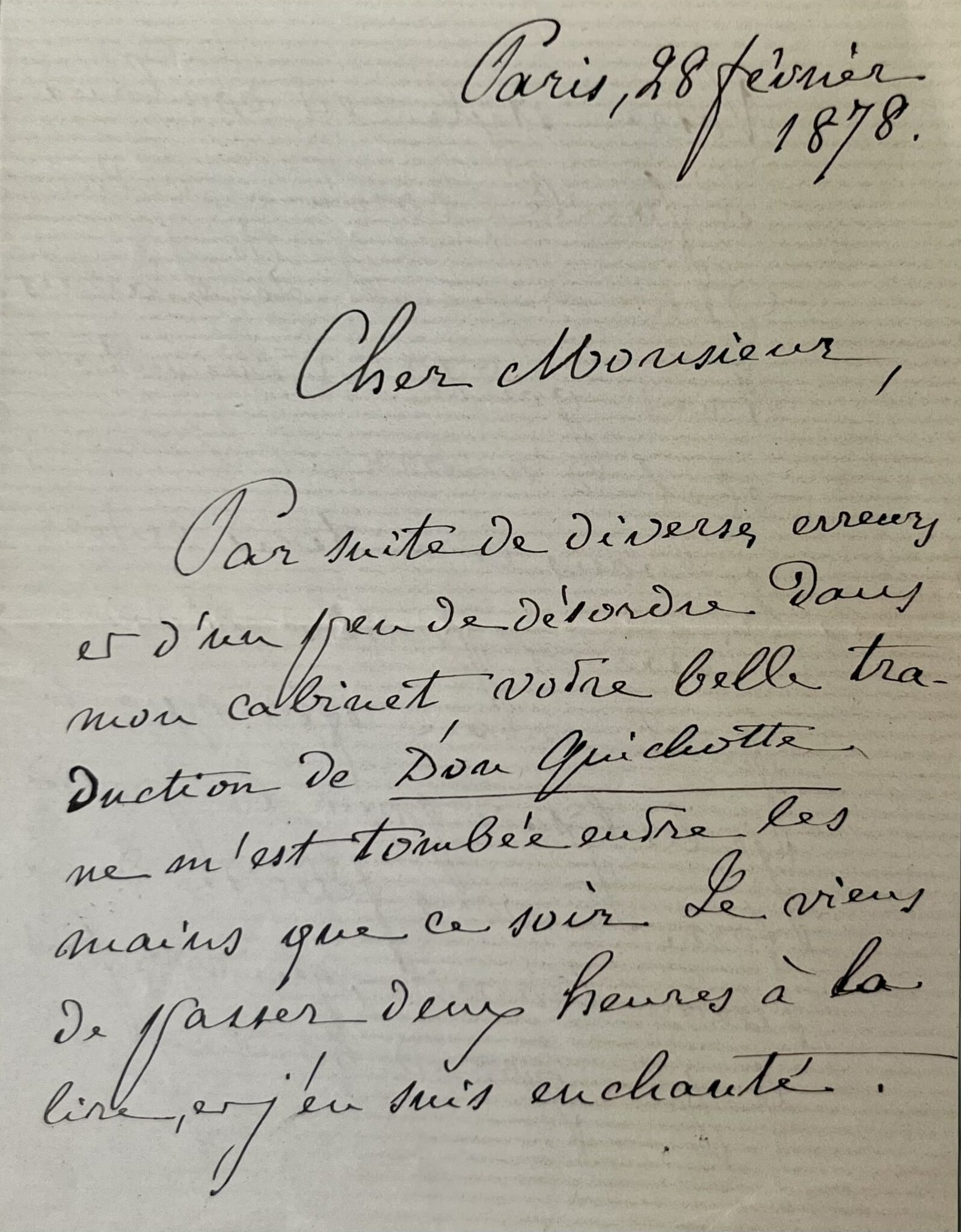 Ernest Renan (Tréguier, 1823/1892)"Cher Monsieur, par suite de diverses erreurs et d’un peu de désordre dans mon cabinet, votre belle traduction de Don Quichotte ne m’est tombée entre les mains que ce soir. Je viens de passer deux heures à la lire, et j’en suis enchanté. Votre style est coulant et facile, comme celui d’un original. Je n’avais jamais tant goûté cet inimitable chef-d’œuvre. Merci ; je vous lirai tout entier. Certaines parties m’ont fait le même effet que si je les lisais pour la première fois. Je vous félicite de ce beau travail, qui vous fait le plus grand honneur. Agréer, avec mes remerciements, l’assurance de mes sentiments les plus affectueux et les plus dévoués. E. Renan".