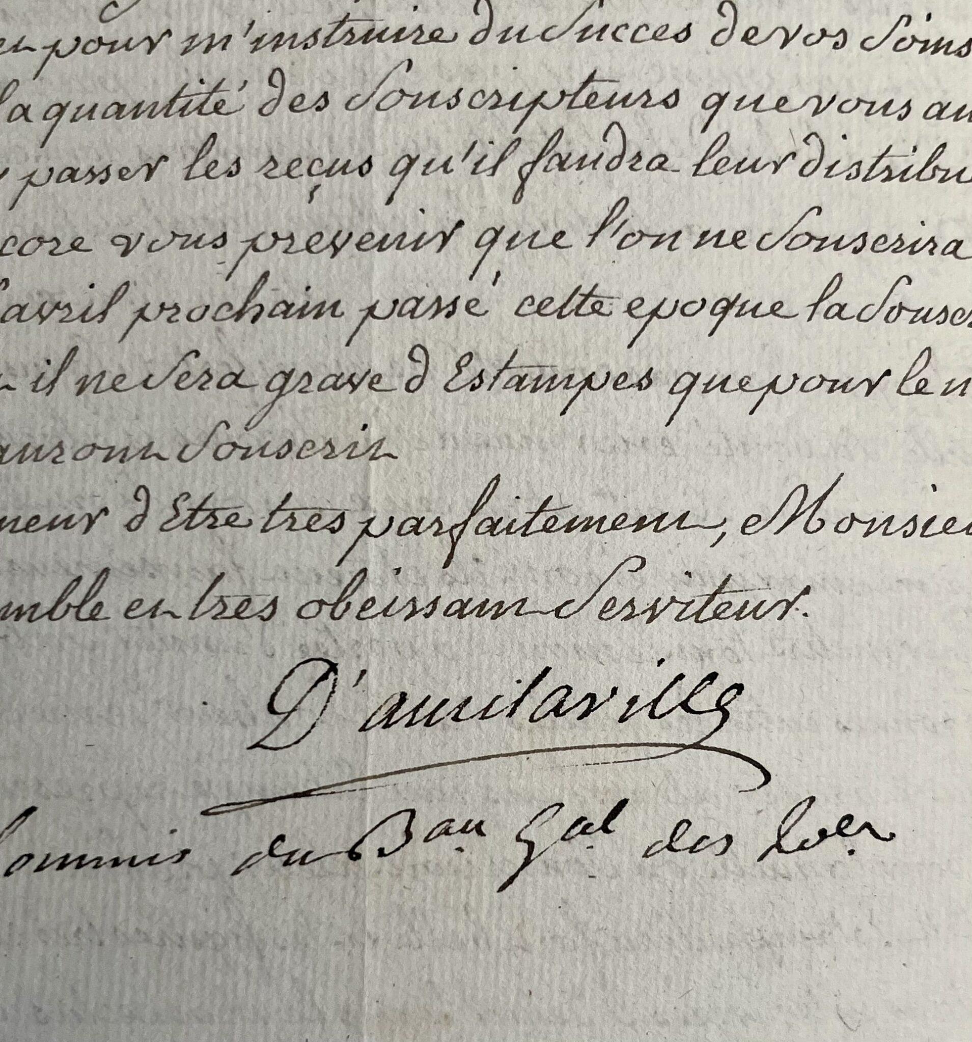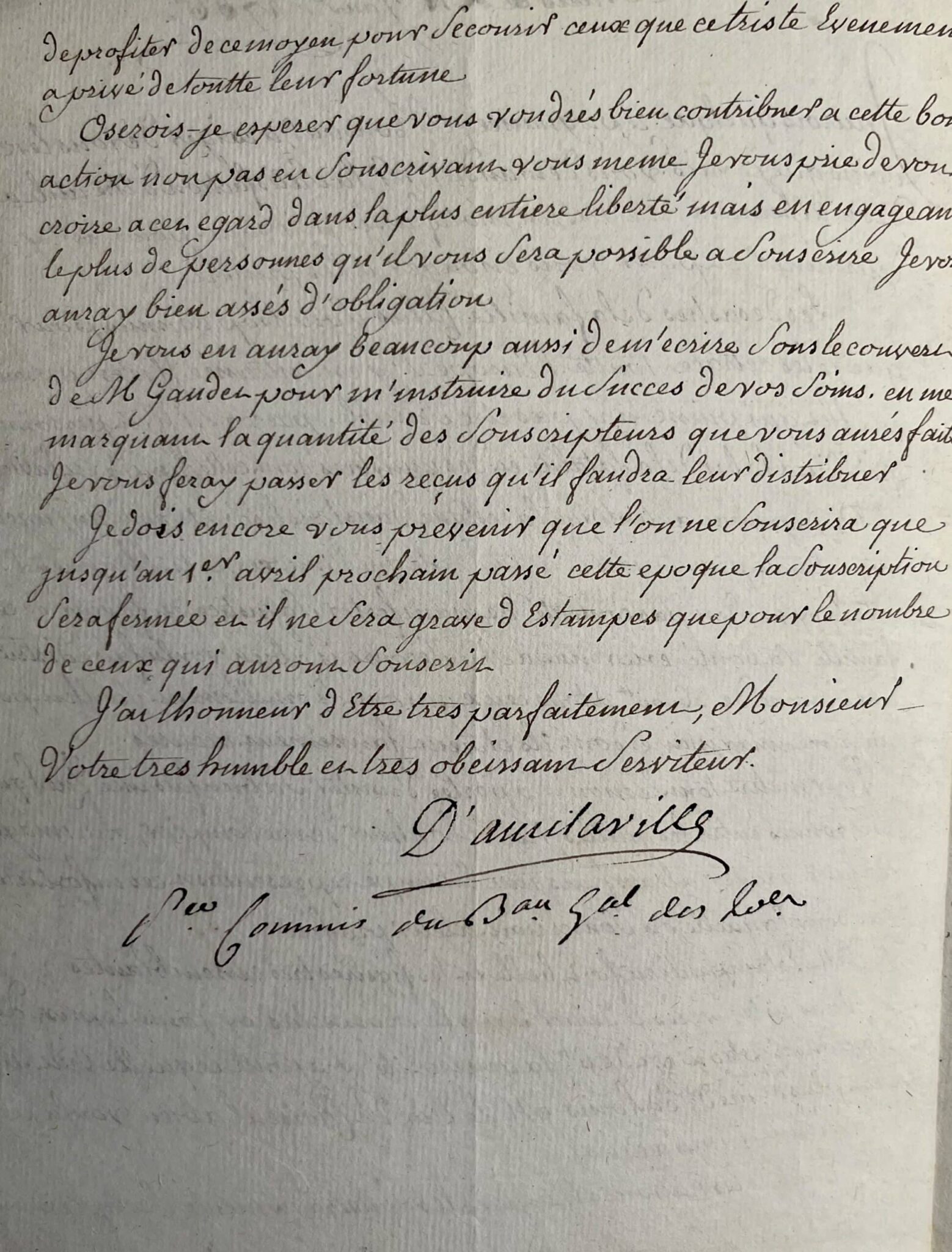 « […] Les désastres de la famille Calas sont trop connus pour que je les retrace […]. Pour mettre tout le monde à portée d'imiter sa bienfaisance, quelques personnes entre lesquelles j'ai le bonheur de me compter, ont imaginé de faire graver à leurs frais une estampe représentant ces infortunés et pour laquelle on souscriroit à leur profit. Cette estampe sera fort belle et les figures très ressemblantes […] ». Il sollicite une participation des destinataires de cette lettre. "Toutes les nations étrangères, les souverains même, s'empressent de profiter de ce moyen pour secourir ceux que ce triste événement a privé de toute leur fortune. Oserois-je espérer que vous voudrez bien contribuer à cette bonne action non pas en souscrivant vous même, je vous prie de vous croire à cet égard dans la plus entière liberté, mais en engageant le plus de personnes qui vous sera possible à souscrire. Je vous aurai bien assés d'obligation [...]".