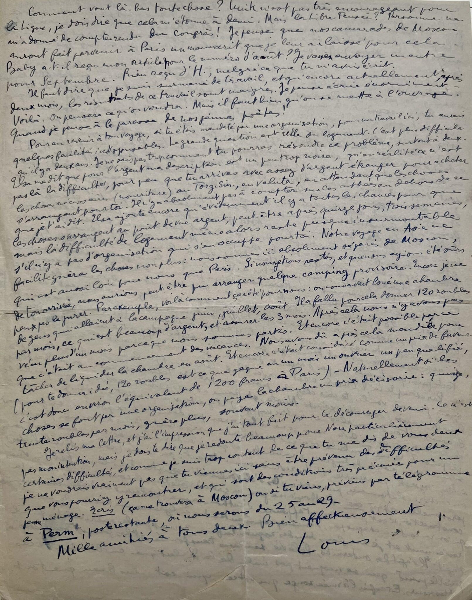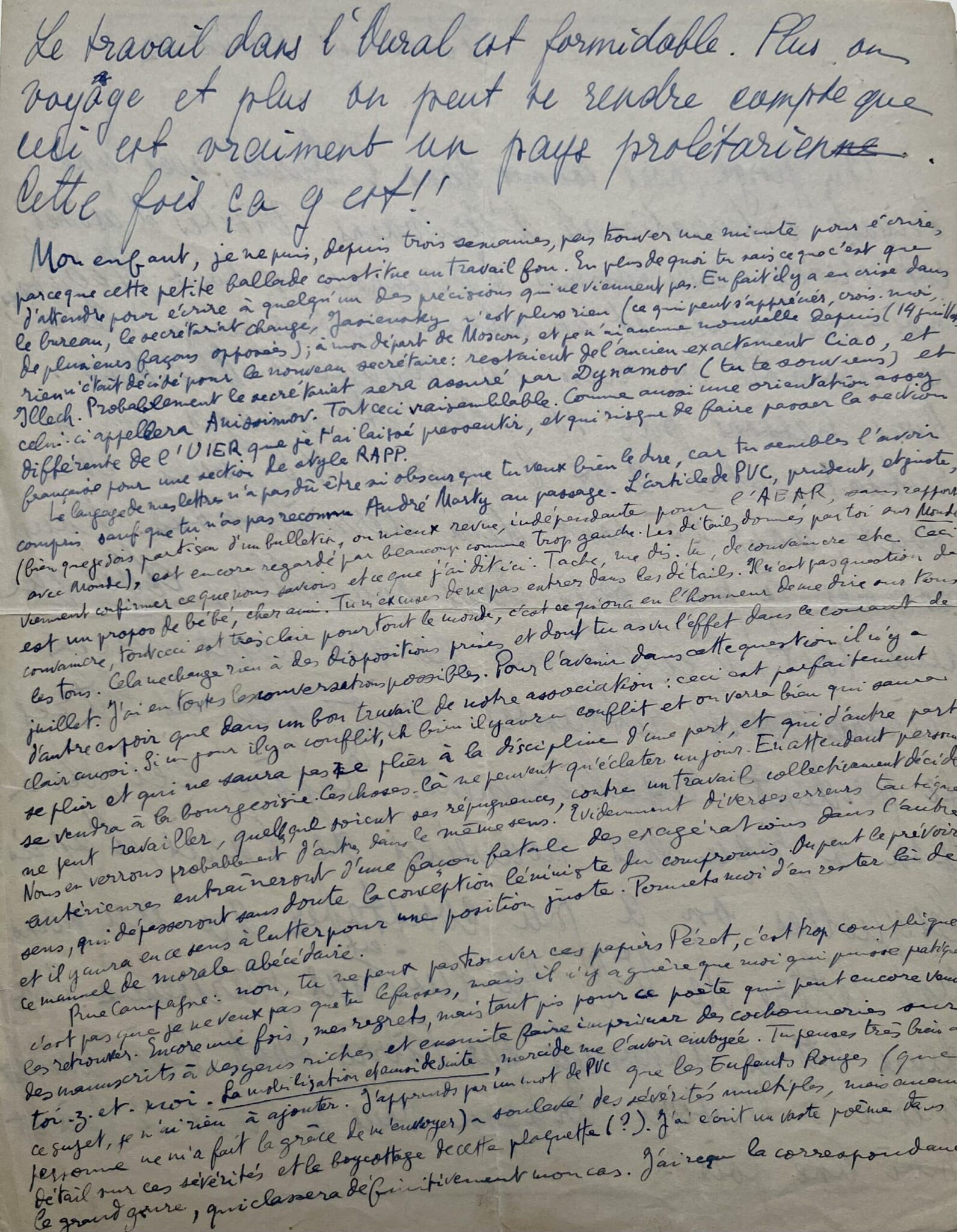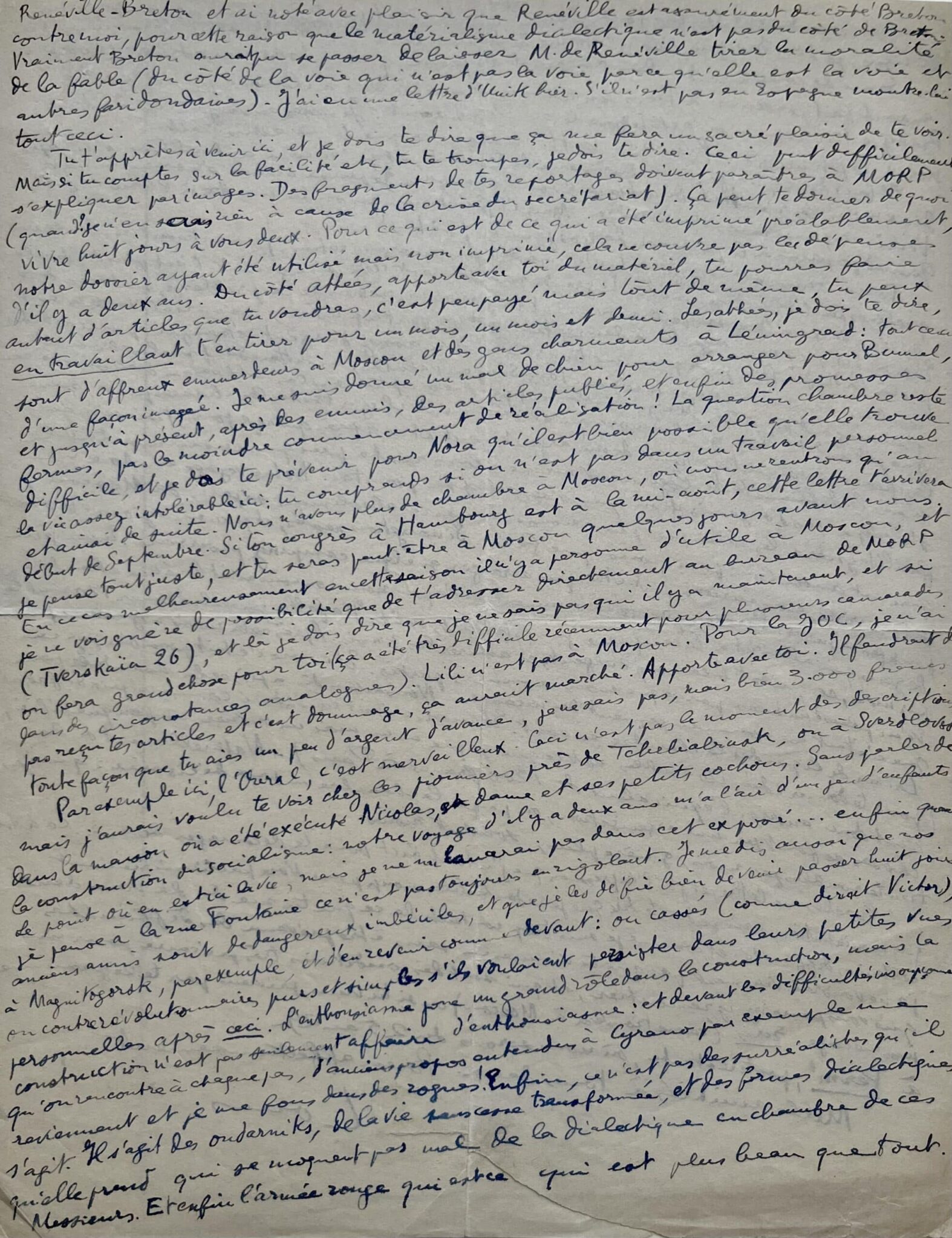 Louis Aragon prend le relais et, d'une fine écriture serrée, parle de l'Union Internationale des Écrivains Révolutionnaires (UIER) et sa branche française l'Association des Écrivains et Artistes Révolutionnaires (AEAR). Il évoque les dissensions survenues au sujet de la soumission au parti communiste et notamment la polémique élevée entre ce dernier, d'une part, et l'AEAR et la revue Monde d'Henri Barbusse, d'autre part. « [...] Pour l'avenir dans cette question, il n'y a d'autre espoir que dans un bon travail de notre association : ceci est parfaitement clair aussi. Si un jour il y a conflit, eh bien il y aura conflit et on verra bien qui saura se plier et qui ne saura pas se plier à la discipline d'une part, et qui d'autre part se vendra à la bourgeoisie. Ces choses là ne peuvent qu'éclater un jour. En attendant personne ne peut travailler, quelques soient ses répugnances, contre un travail collectivement décidé [...] ». Il fait aussi quelques remarques acides sur Benjamin Péret : « Rue Campagne[-Première, où Louis Aragon et Elsa Triolet vivent] : non, tu ne peux pas retrouver ces papiers Péret, c'est trop compliqué, c'est pas que je ne veux pas que tu le fasses, mais il n'y a guère que moi qui puisse pratiquement les retrouver. Encore une fois, mes regrets, mais tant pis pour ce poète qui peut encore vendre des manuscrits à des gens riches et ensuite faire imprimer des cochonneries sur toi-z-et-moi [...] » Il évoque ensuite le tract surréaliste La Mobilisation contre la paix n'est pas la guerre, par lequel le groupe demande à participer au congrès international contre la guerre, tout en critiquant Henri Barbusse et Romain Rolland. Il parle aussi de son propre tract Éclairez votre religion. Aux enfants rouges, catéchisme révolutionnaire qu'il avait fait imprimer peu avant en 1932 : « [...] J'apprends par un mot de PVC [Paul Vaillant-Couturier] que les Enfants rouges (que personne ne m'a fait la grâce de m'envoyer) a soulevé des sévérités multiples, mais aucun détail sur ces sévérités et le boycottage de cette plaquette (?). J'ai écrit un vaste poème dans le grand genre, qui classera définitivement mon cas [...] ». Il commente sa lecture de la correspondance entre André Breton et André Rolland de Renéville parue dans la Nrf du 1er juillet 1932 : « [...] [J']ai noté avec plaisir que Renéville est assurément du côté Breton contre moi, pour cette raison que le matérialisme dialectique n'est pas du côté de Breton. Vraiment Breton aurait pu se passer de laisser M. de Renéville tirer la moralité de la fable (du côté de la voie qui n'est pas la voie parce qu'elle est la voie et autres faridondaines) [...] ». Louis Aragon indique ensuite qu'il se réjouit de la venue annoncée de Georges Auric (et de son épouse russe, Nora Felter), mais le prévient que la vie ici est difficile et qu'il aura à écrire des articles mal payés pour subvenir à ses besoins. Enfin, il parle de cette U.R.S.S. qu'il visite : « [...] Ici, l'Oural, c'est merveilleux [...]. J'aurais voulu te voir chez les pionniers près de Tchéliabinsk, ou à Sverdlovsk [nom que portait alors Iekaterinbourg] dans la maison où a été exécuté Nicolas, sa dame et ses petits cochons. Sans parler de la construction du socialisme : notre voyage d'il y a deux ans m'a l'air d'un jeu d'enfants. Le point où en est ici la vie, mais je ne me lancerai pas dans cet exposé [...]. Enfin quand je pense à la rue Fontaine [adresse parisienne d'André Breton], ce n'est pas toujours en rigolant. Je me dis aussi que nos anciens amis sont de dangereux imbéciles, et que je les défie bien de venir passer huit jours à Magnitogorsk [à 300 km au sud de Tchéliabinsk, par exemple, et d'en revenir comme devant : ou cassés (comme disait Victor), ou contrerévolutionnaires purs et simples s'ils voulaient persister dans leurs petites vues personnelles après ceci [...]". Texte très dense.