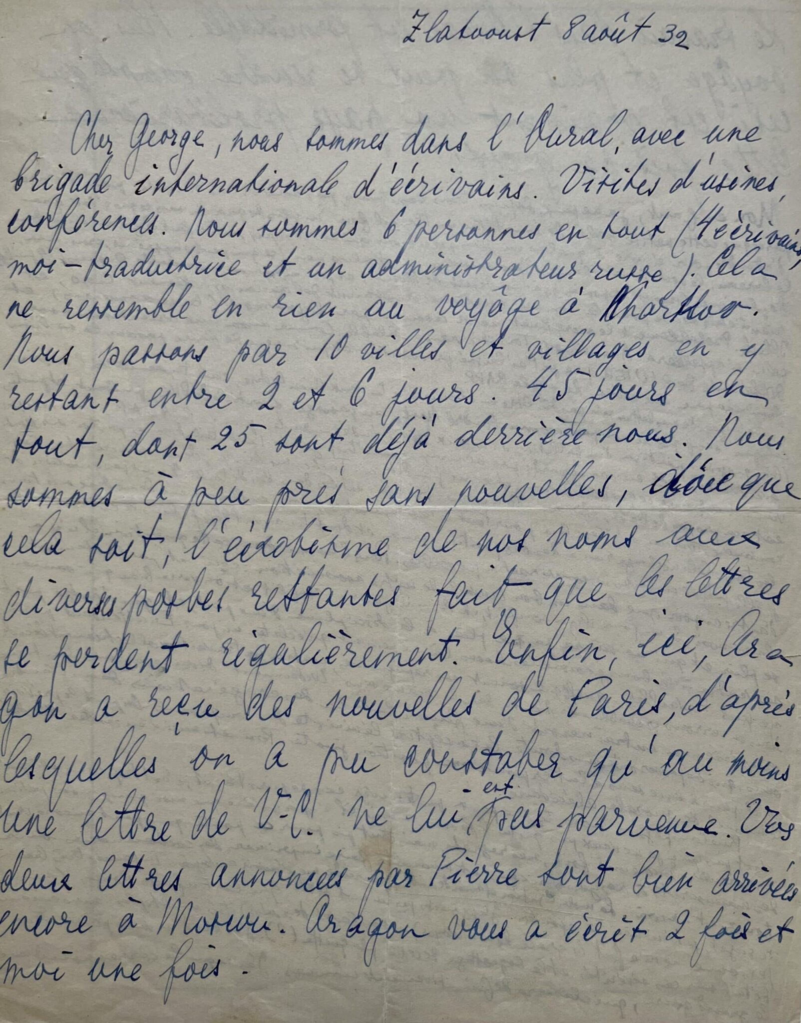 Elsa Triolet débute la lettre : « Cher George[s], nous sommes dans l'Oural, avec une brigade internationale d'écrivains. Visites d'usines, conférences. Nous sommes 6 personnes en tout (4 écrivains, moi – traductrice, et un administrateur russe). Cela ne ressemble en rien au voyage à Kharkov. Nous passons par 10 villes et villages en y restant entre 2 et 6 jours. 45 jours en tout, dont 25 sont déjà derrière nous. Nous sommes à peu près sans nouvelles, d'où que cela soit, l'exotisme de nos noms aux diverses postes restantes fait que les lettres se perdent régulièrement [...]. Le travail dans l'Oural est formidable. Plus on voyage et plus on peut se rendre compte que ceci est vraiment un pays prolétarien. Cette fois, ça y est !! ».