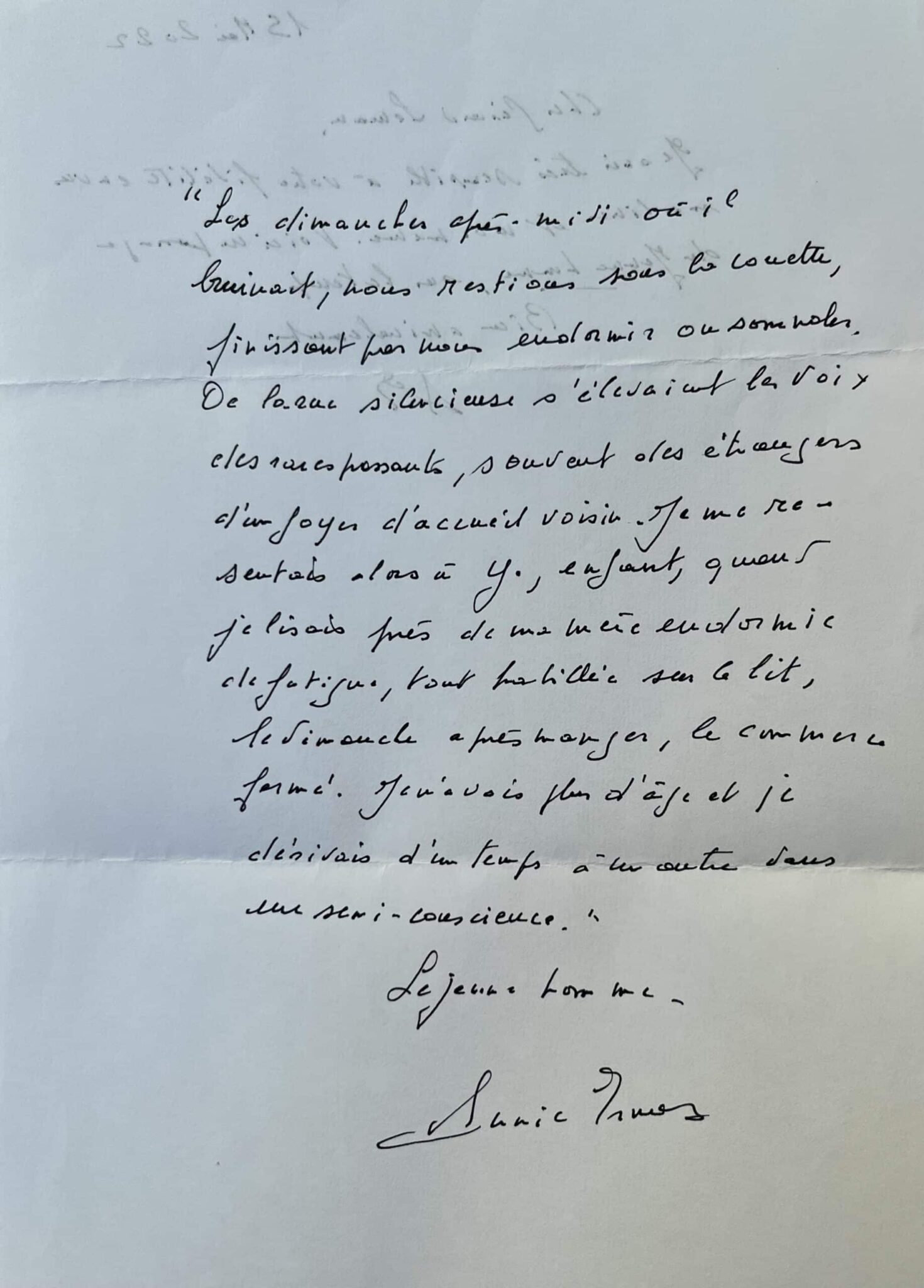 "Les dimanches après-midi où il bruinait, nous restions sous la couette, finissant par nous endormir ou somnoler. De la rue silencieuse s'élevait les voix des rares passants, souvent des étrangers d'un foyer d'accueil voisin. Je me re-sentais alors à Y., enfant, quand je lisais près de ma mère endormie de fatigue, tout habillée sur le lit, le dimanche après manger, le commerce fermé. Je n'avais plus d'âge et je dérivais d'un temps à un autre dans une semi-conscience [...]".
