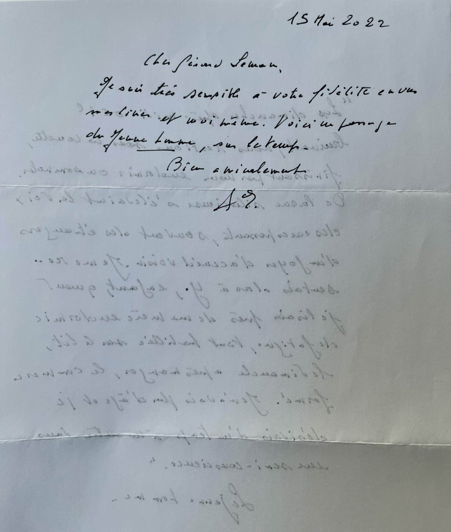 Au dos, un mot d'envoi : "Cher Gérard Leman, Je suis très sensible à votre fidélité envers mes livres et moi-même. Voici un passage du Jeune homme, sur le temps. Bien amicalement. A.E."