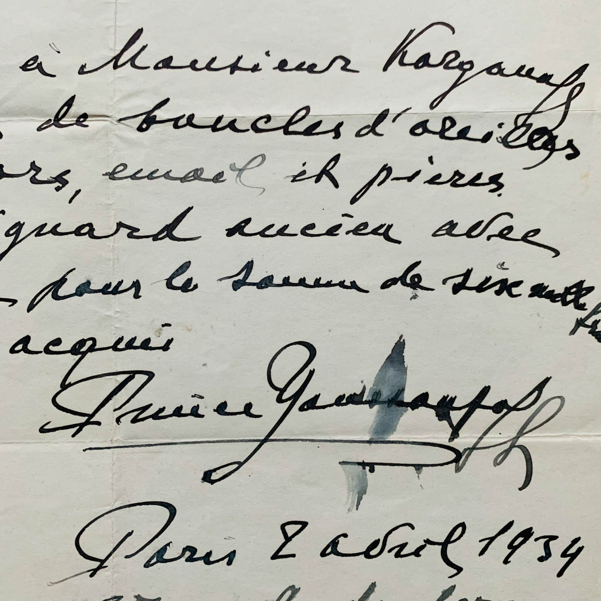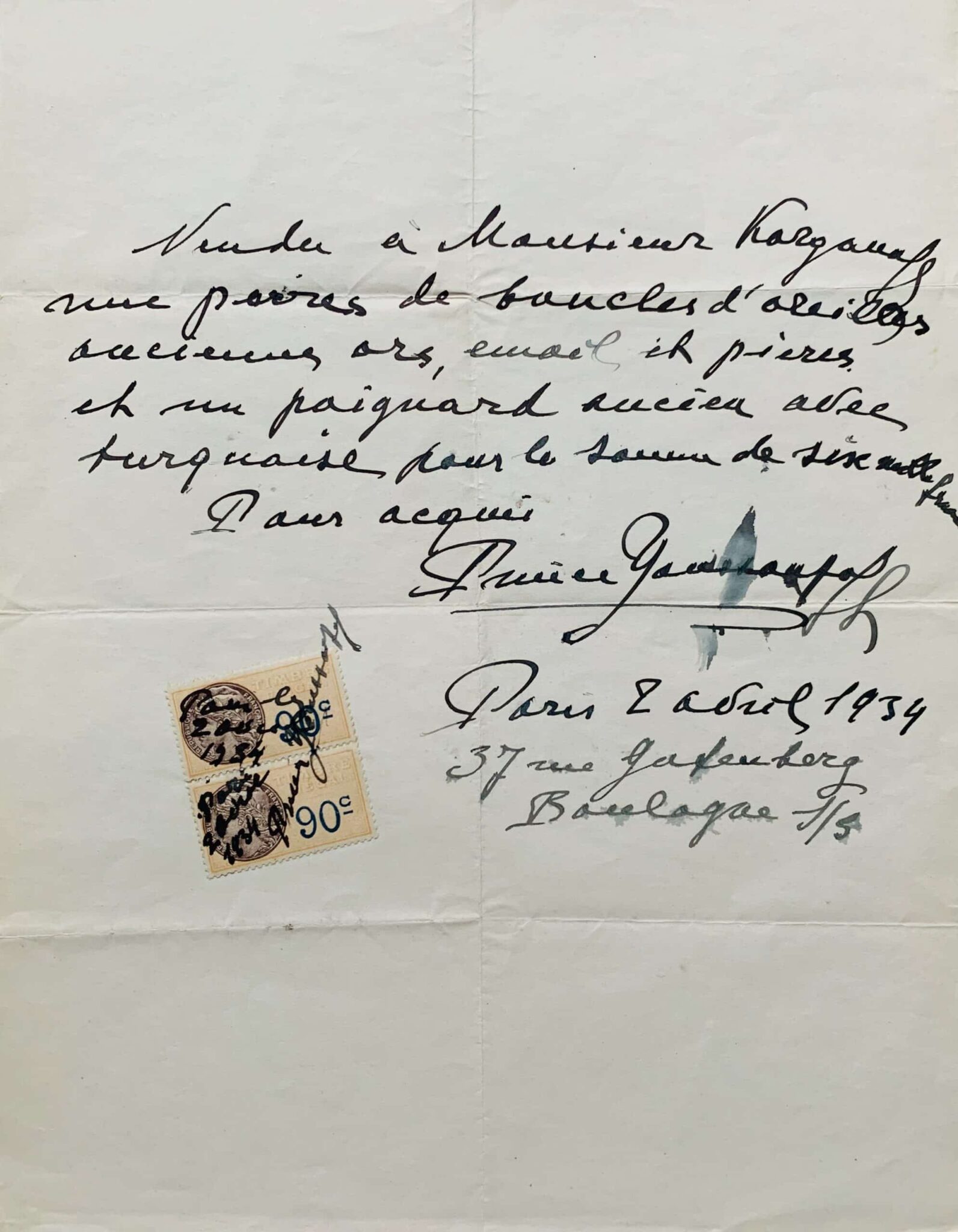 "Vendu à Monsieur Karganoff une paire de boucles d'oreilles anciennes ors, émail et pierres et un poignard ancien avec turquoise pour la somme de six mille francs. Pour acquis. Prince Youssoupoff". Il ajoute la des et son adresse à Boulogne. Sur le coté deux timbres fiscaux sur lesquels Youssoupoff a également apposé sa signature.
