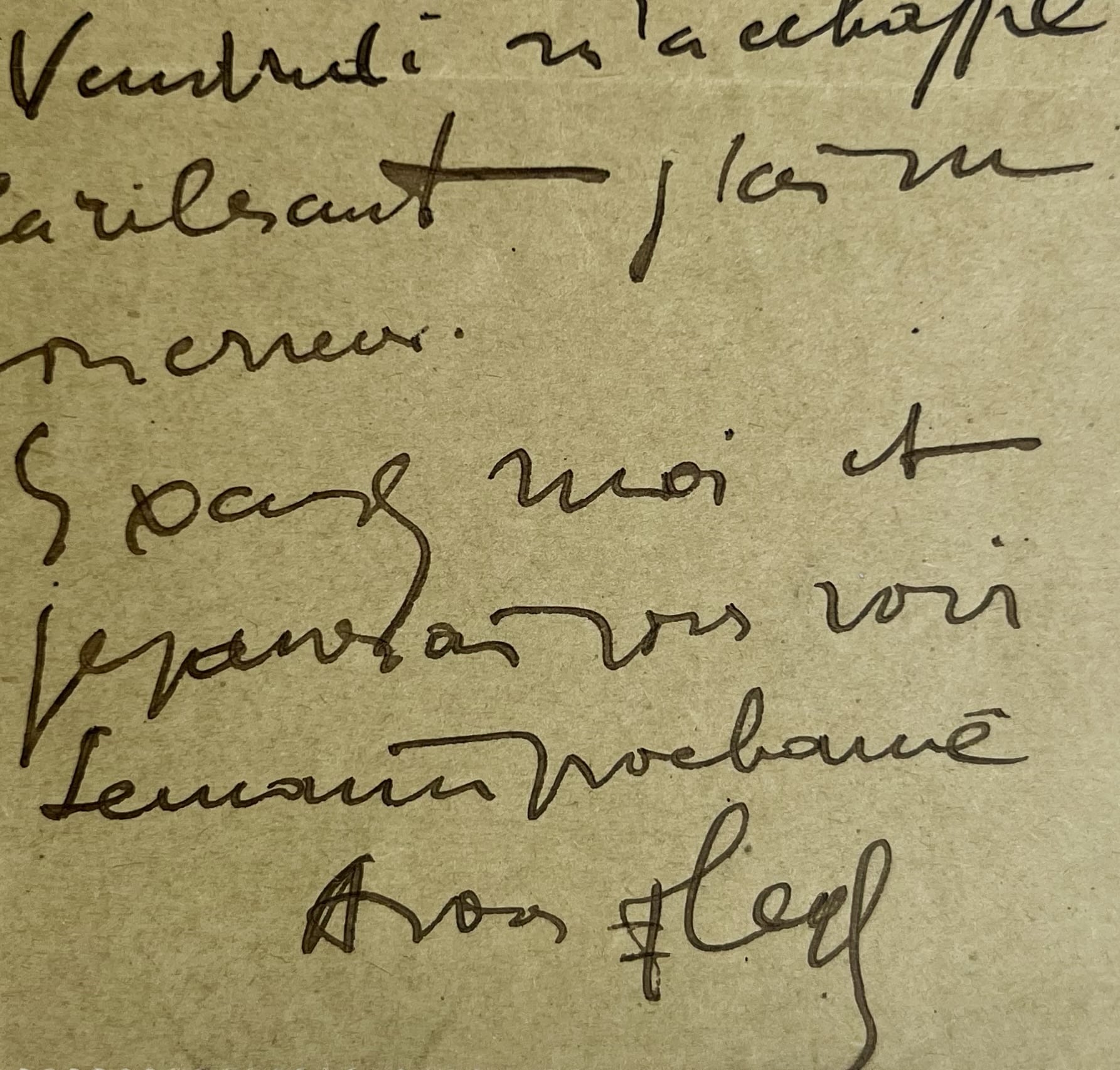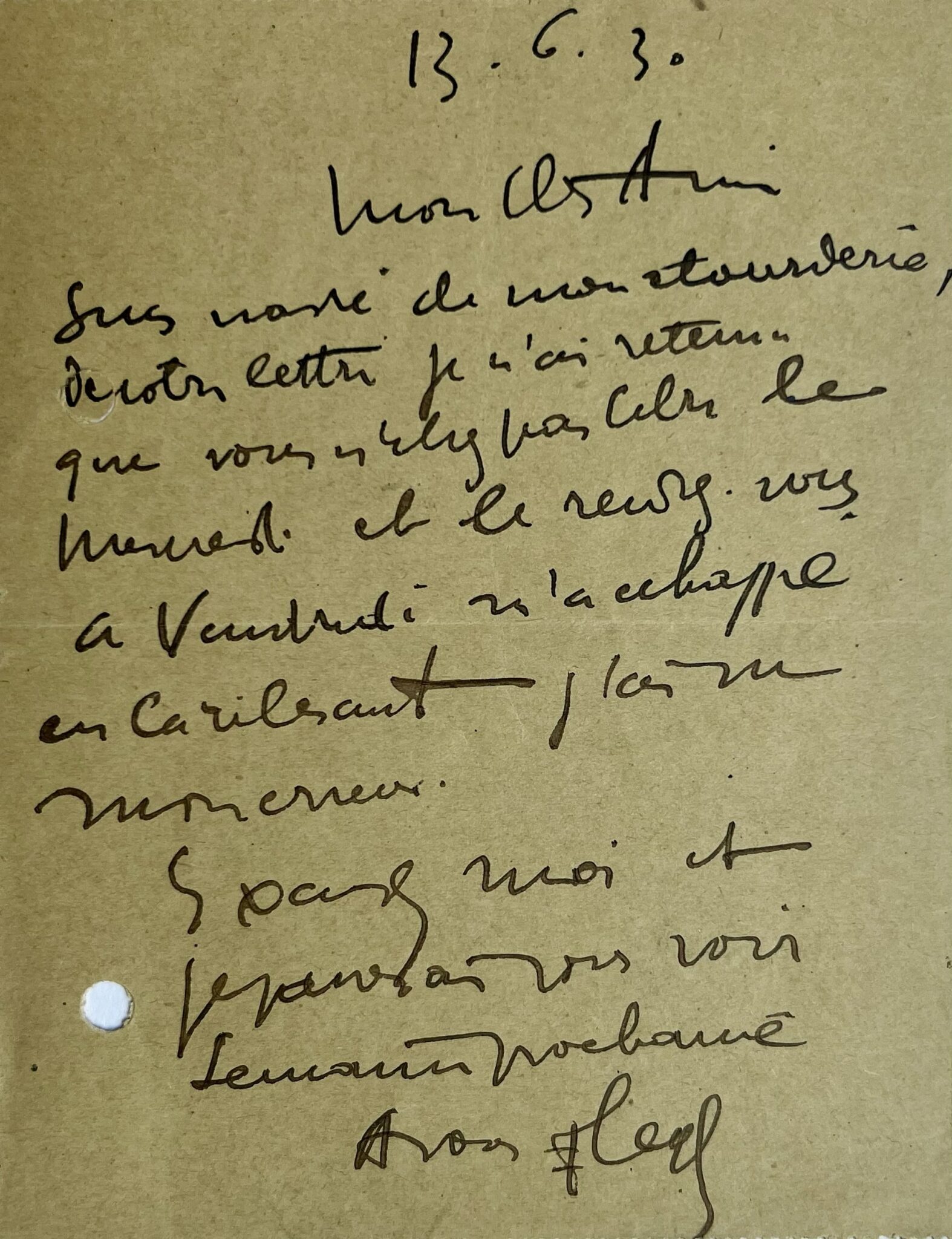 "Mon cher Ami. Suis navré de mon étourderie, de votre lettre je n'ai retenu que vous n'étiez pas libre le mercredi et le rendez-vous à vendredi m'a échappé. En la relisant j'ai vu mon erreur. Excusez-moi et je pourrai vous voir semaine prochaine. A vous. FLeger".