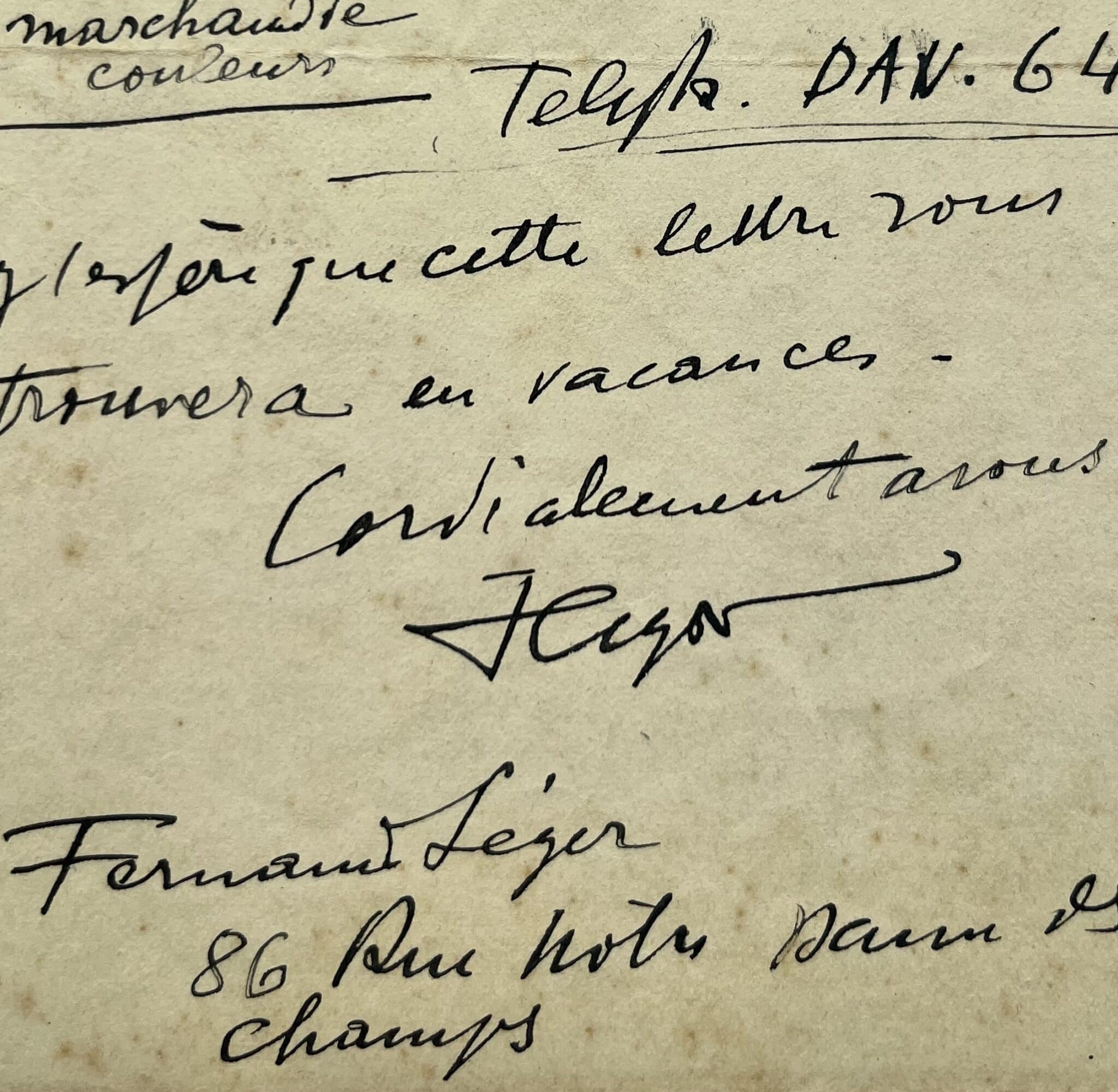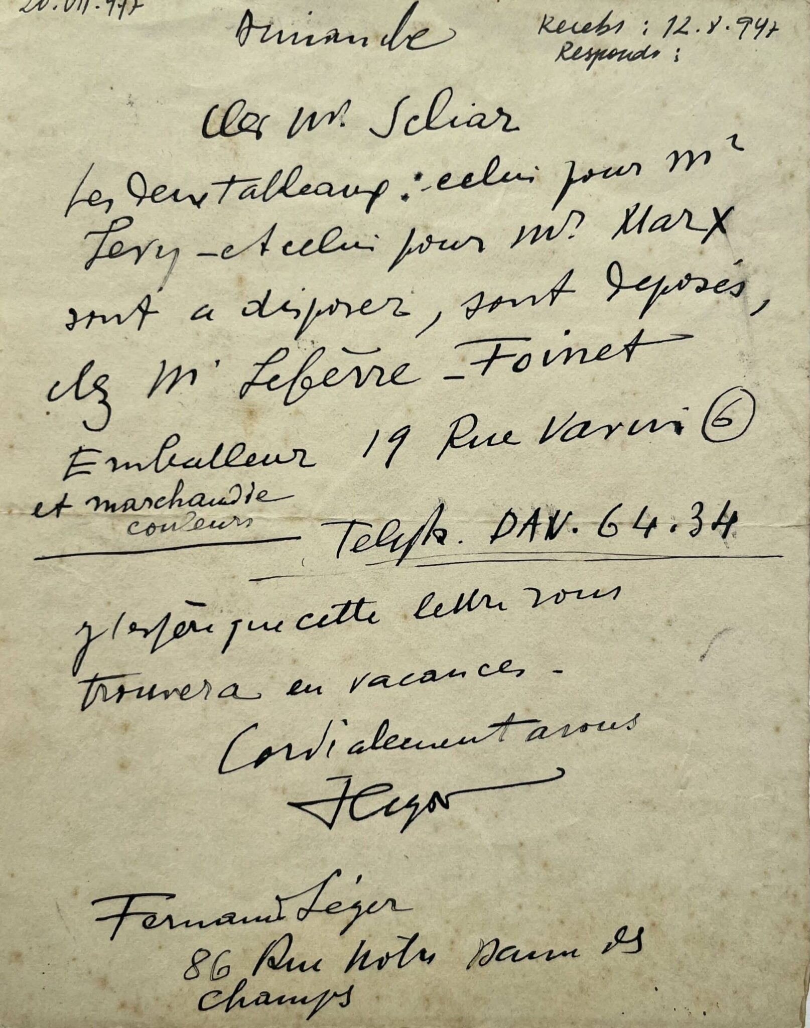 Fernand Léger avertit le peintre brésilien Carlos Scliar que « les deux tableaux : celui pour Mr Levy et celui pour Mr Marx [peut-être l'architecte Roberto Burle Marx (1909-1994)] sont à disposer, sont déposés, chez Mr Lefèvre-Foinet Emballeur et marchand de couleurs 19 rue Vavin. J'espère que cette lettre vous trouvera en vacances ». Il donne son adresse « Fernand Léger 86 Rue Notre Dame des Champs ».