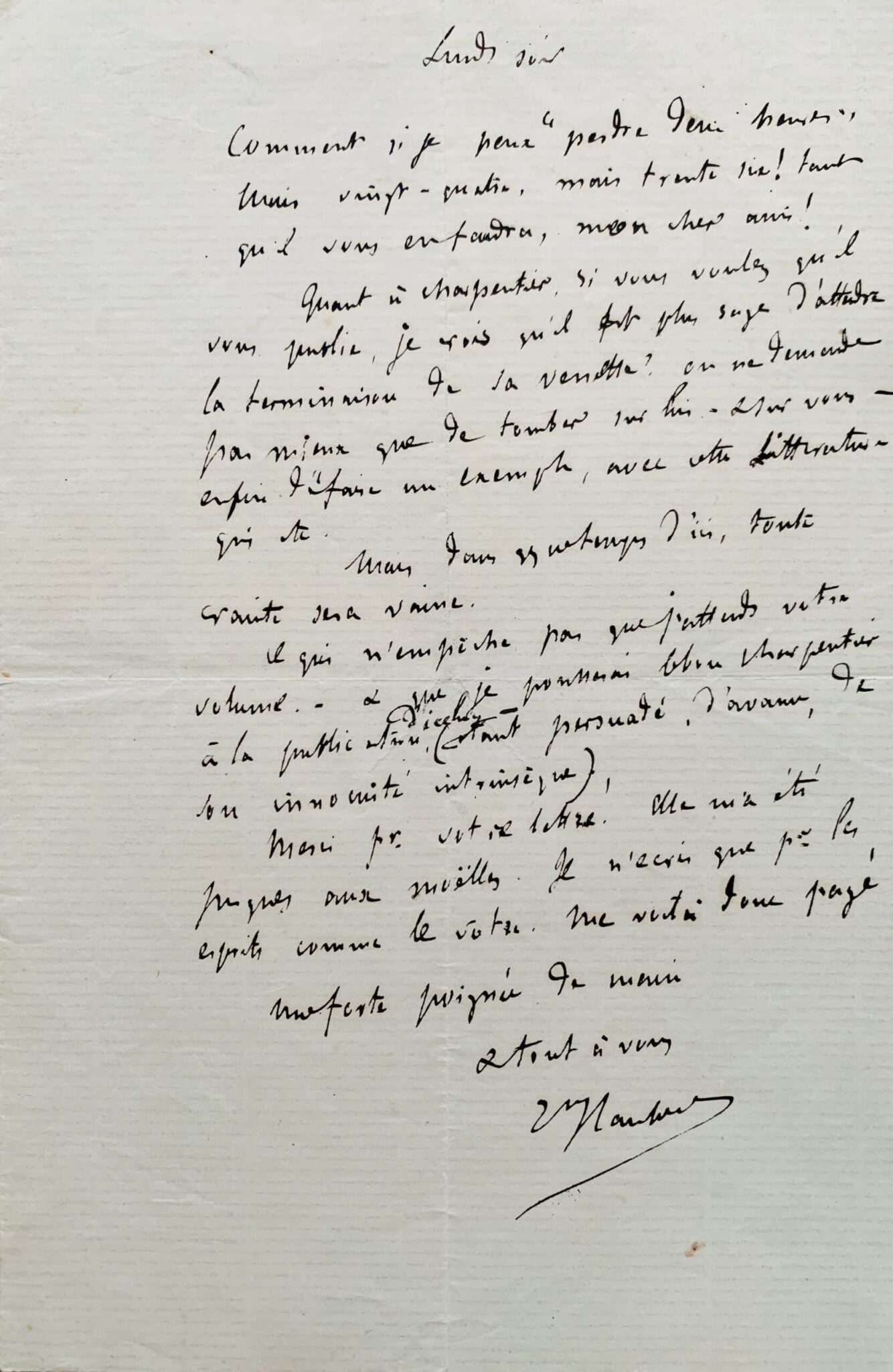 Ce qui n’empêche pas que j’attends votre volume. & que je pousserai le bon Charpentier à la publication d’icelui (étant persuadé, d’avance, de son innocuité intrinsèque).