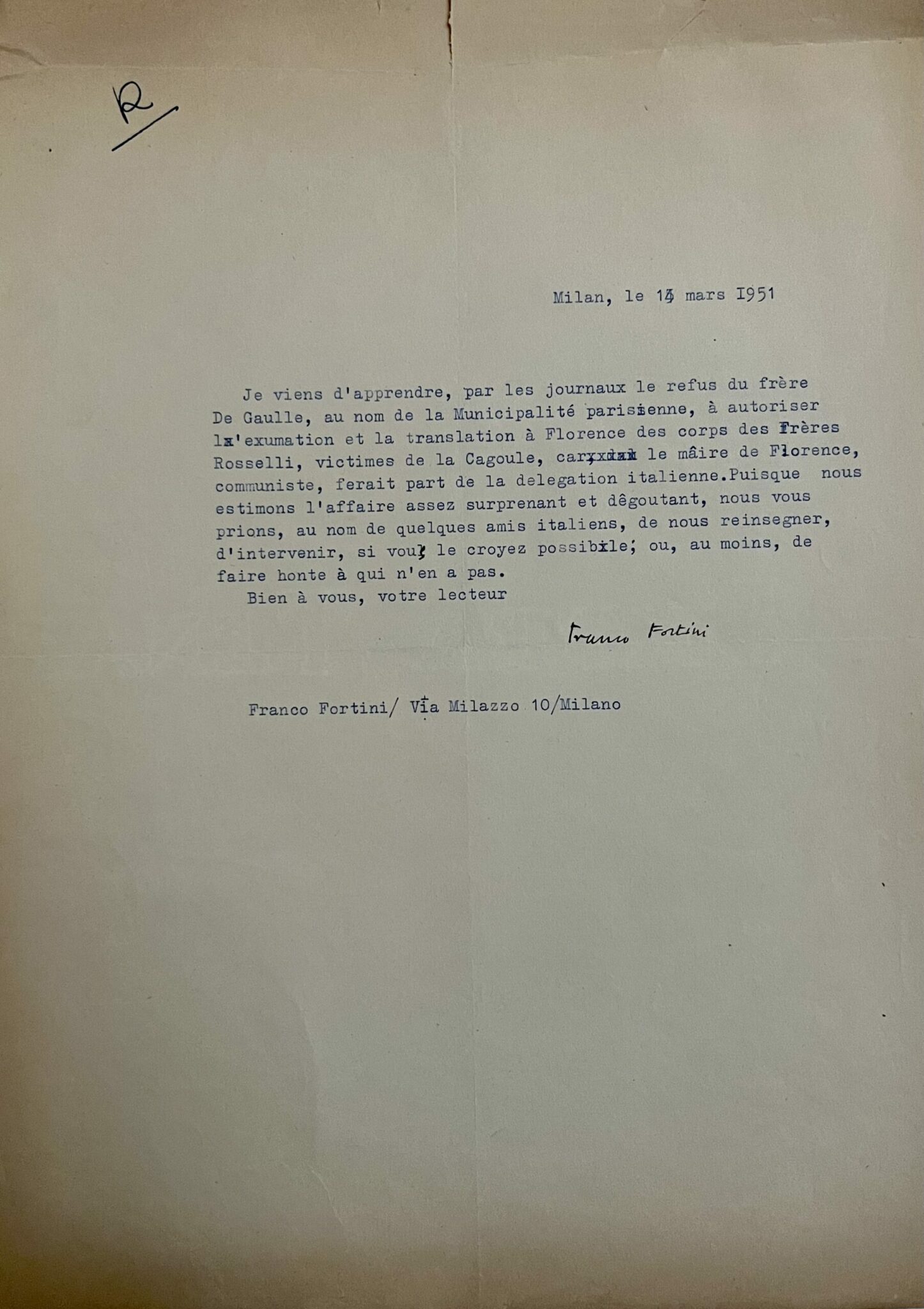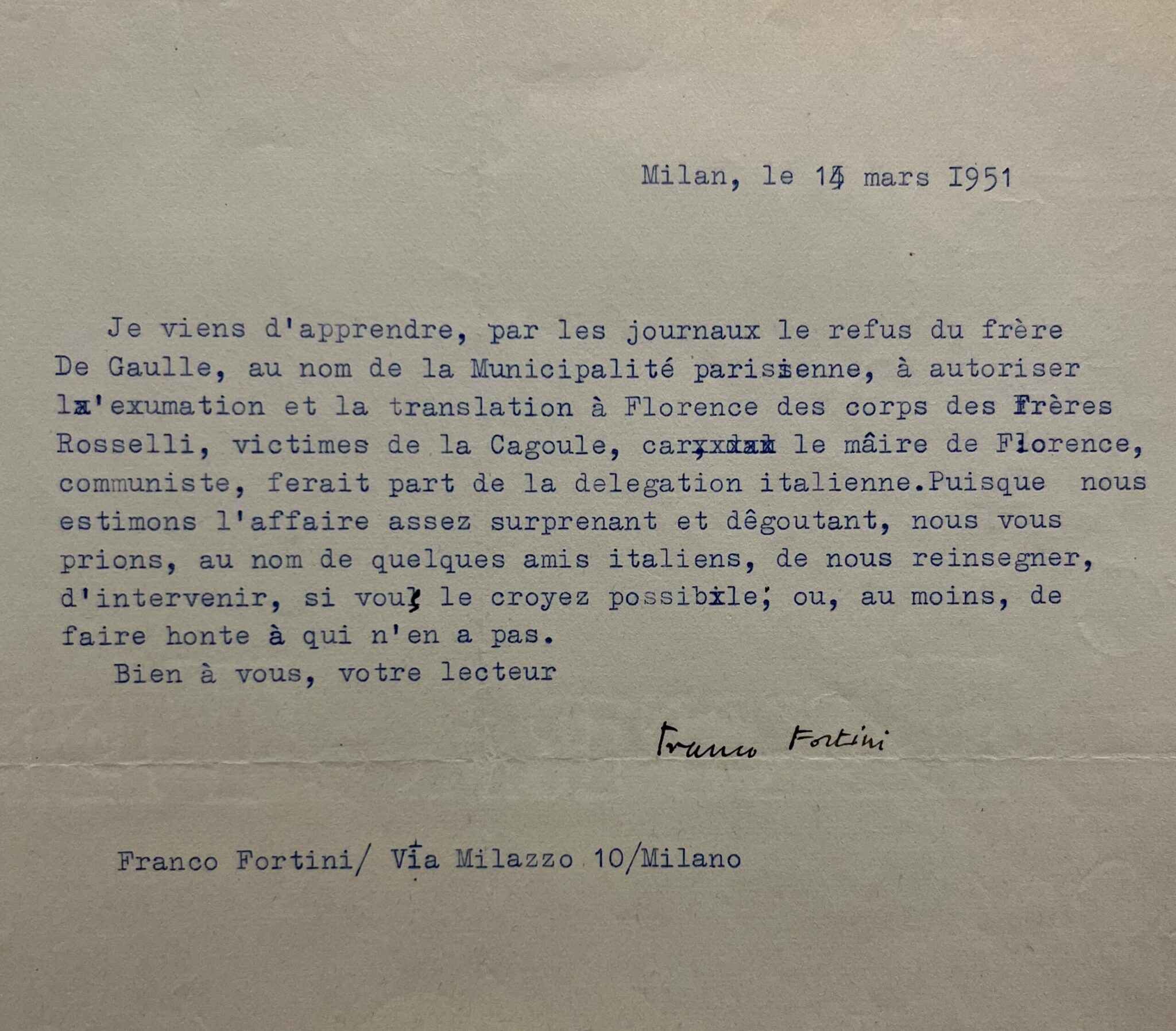 "Je viens d'apprendre, par les journaux le refus du frère De Gaulle, au nom de la Municipalité parisienne, à autoriser l'exumation et la translation à Florence des corps des Frères Rosselli, victimes de la Cagoule, car le maire de Florence, communiste, ferait part de la délégation italienne. Puisque nous estimons l'affaire assez surprenant et dêgoutant, nous vous prions, au nom de quelques amis italiens, de nous reinsegner, d'intervenir, si vous le croyez possible ; ou, au moins, de faire honte à qui n'en a pas".