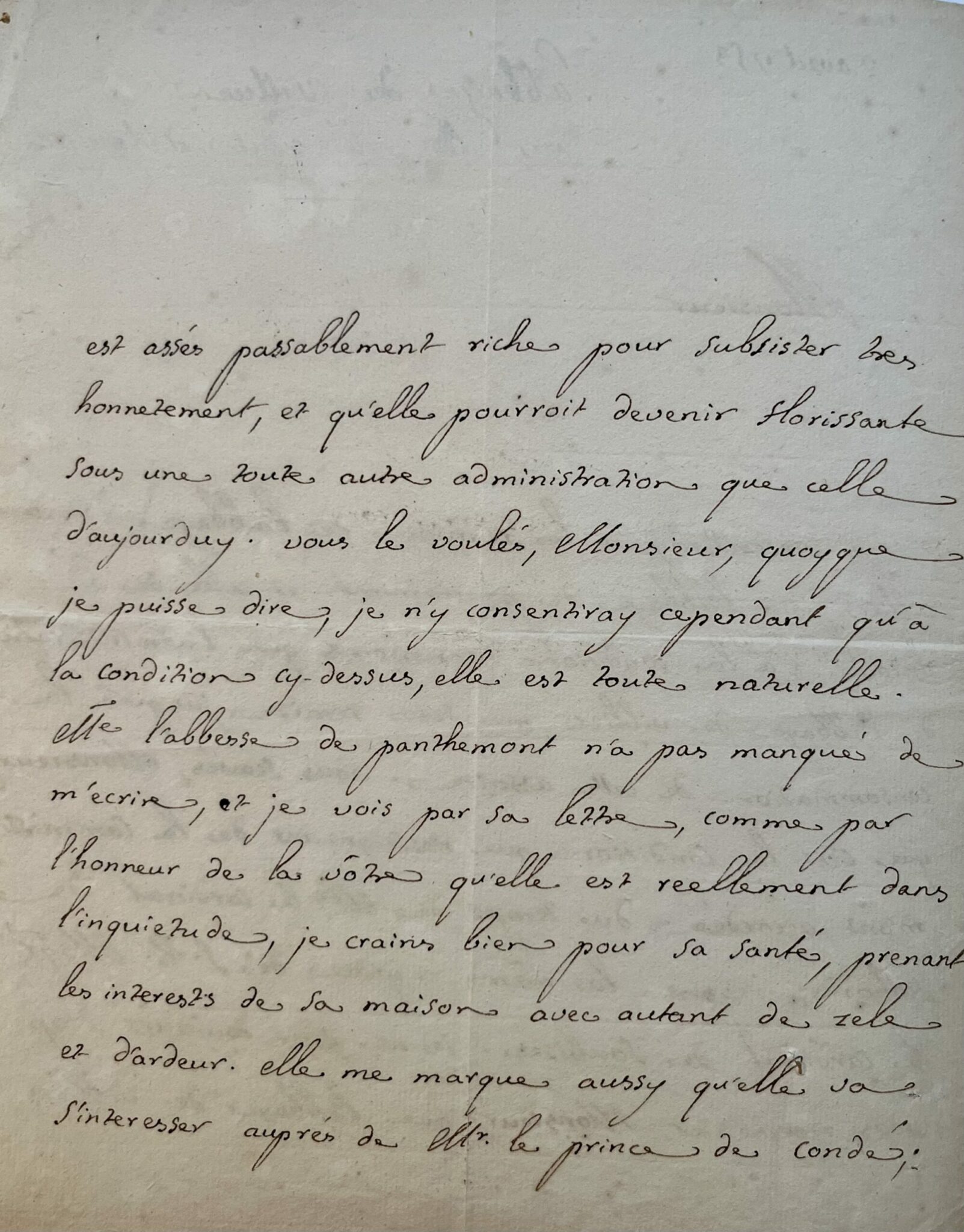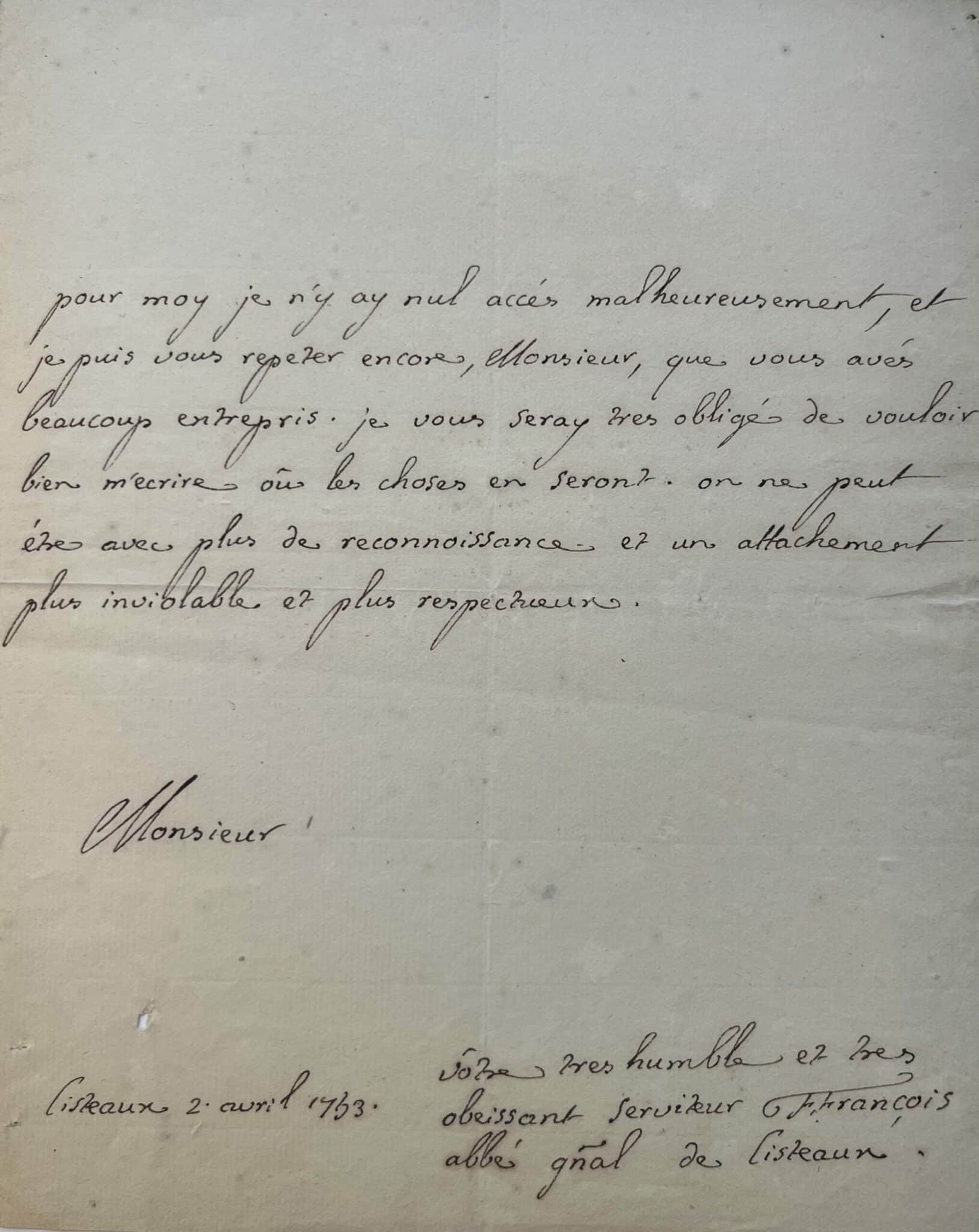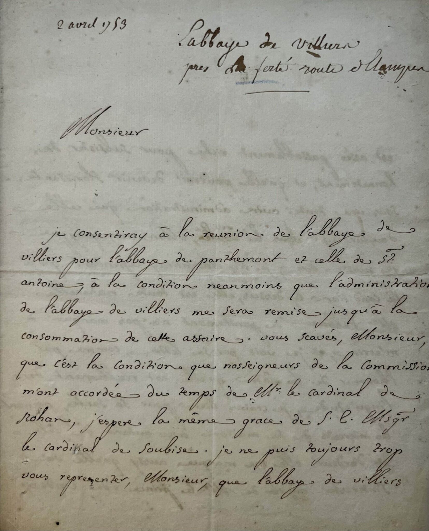 François Trouvé (Champagne-sur-Vingeanne, 1716/1797)"Je consentiray à la réunion de l'abbaye de Villiers pour l'abbaye de Panthemont et celle de St Antoine, à la condition néanmoins que l'administration de l'abbaye de Villiers me sera remise jusqu'à la consommation de cette affaire. Vous scavés, Monsieur, que c'est la condition que nosseigneurs de la commission m'ont accordée du temps de Mr le Cardinal de Rohan, j'espère la même grâce de S.E. Msgr le cardinal de Soubise. Je ne puis toujours trop vous représenter, Monsieur, que l'abbaye de Villiers est assés passablement riche pour subsister tres honnetement, et qu'elle pourroit devenir florissante sous une toute autre administration que celle d'aujourd'hui [...] je n'y consentiray cependant qu'à la condition cy-dessus, elle est toute naturelle. Me l'abbesse de Panthemont [Marie-Catherine de Béthizy de Mézières, abbesse de Penthemont depuis 1743] n'a pas manqué de m'écrire, et je vois par sa lettre, comme par l'honneur de la vôtre qu'elle est réellement dans l'inquiétude, je crains bien pour sa santé, prenant les intérests de sa maison avec autant de zèle et d'ardeur. Elle me marque aussy qu'elle va s'intéresser aurpès de Mr le prince de Condé [...]". signée "F François abbé gnal de Cisteaux".