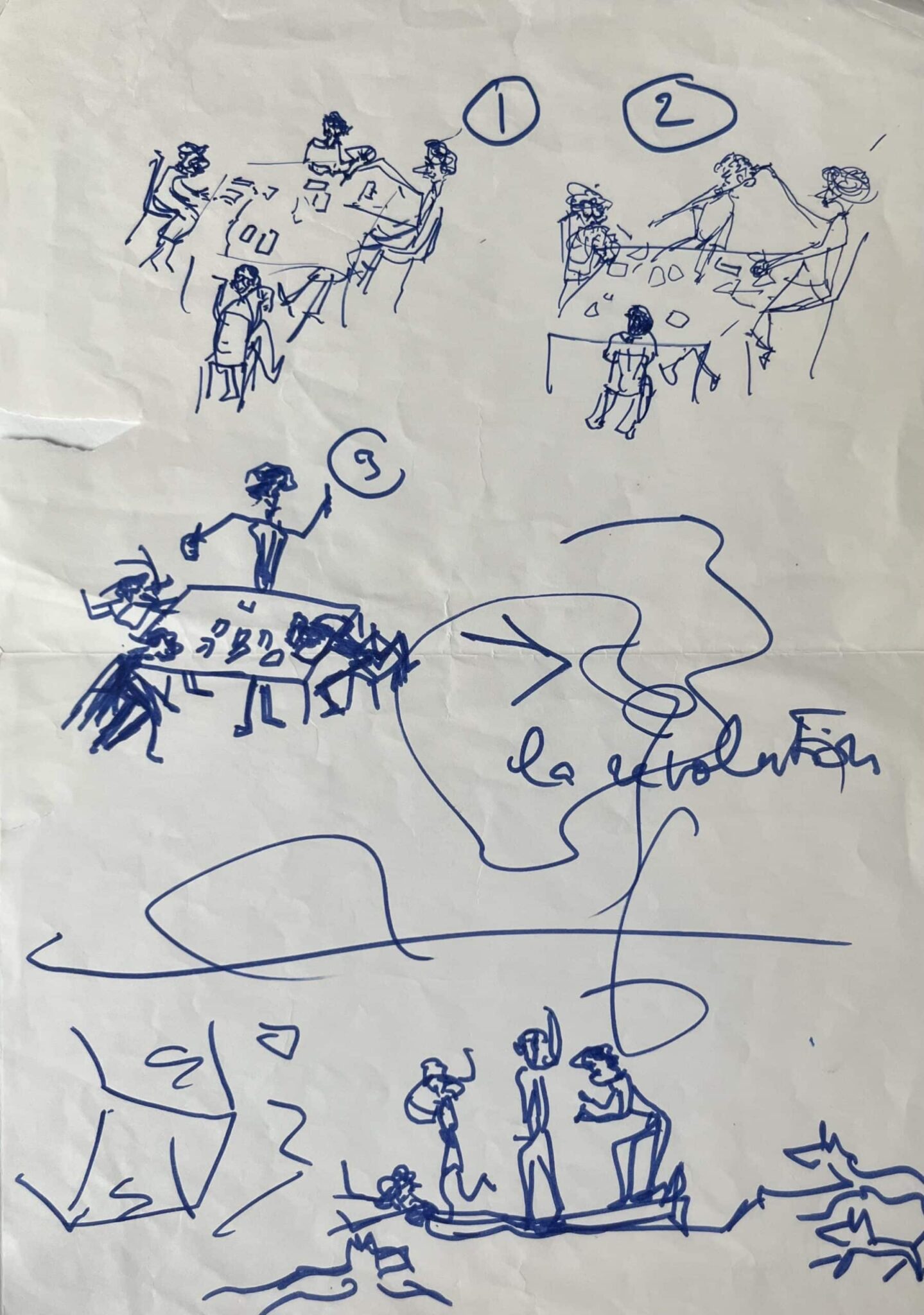 Sur une feuille, François Sagan a esquissé, sous forme de bande dessinée en 4 scènes, une réunion qui dégénère en révolution.