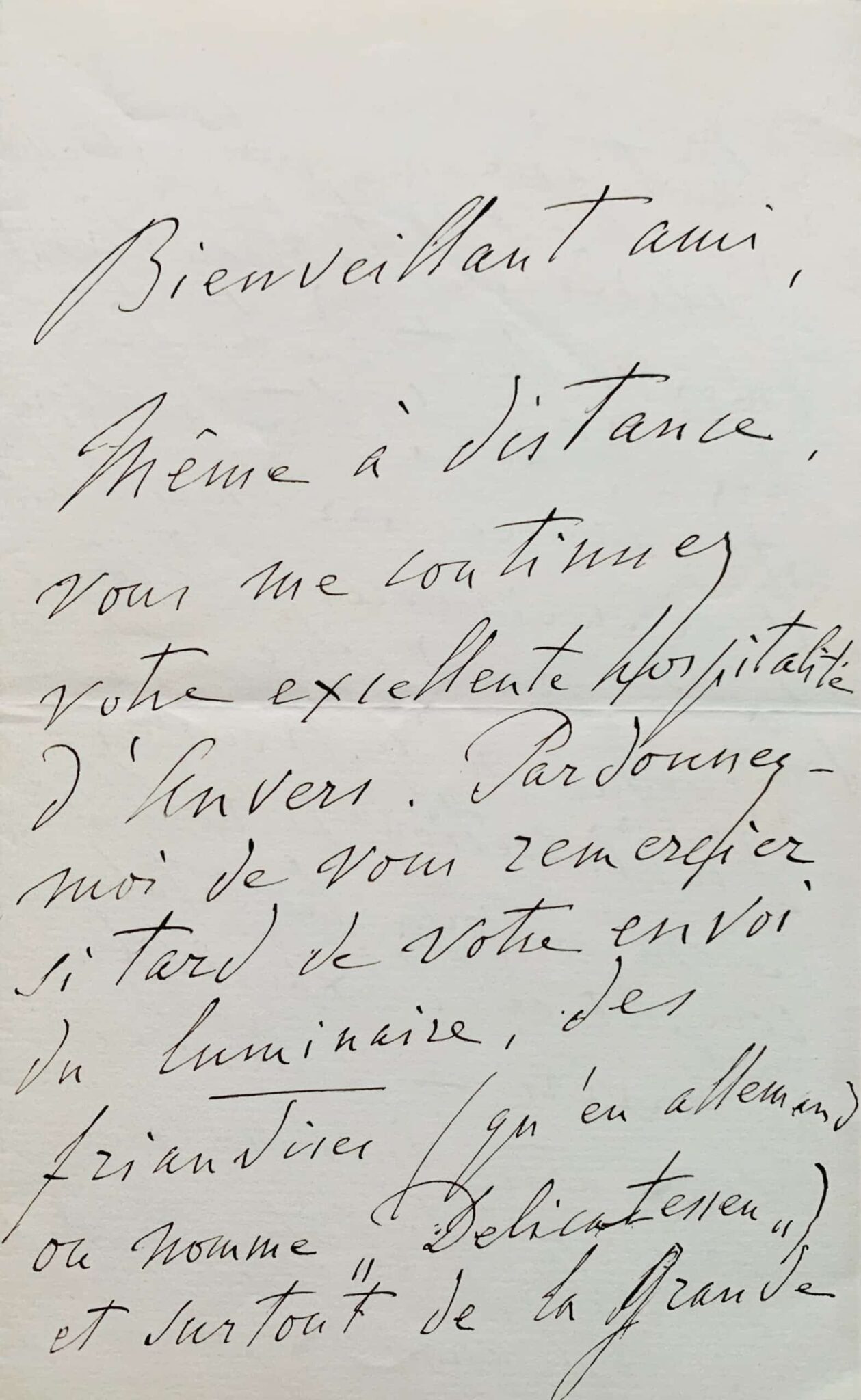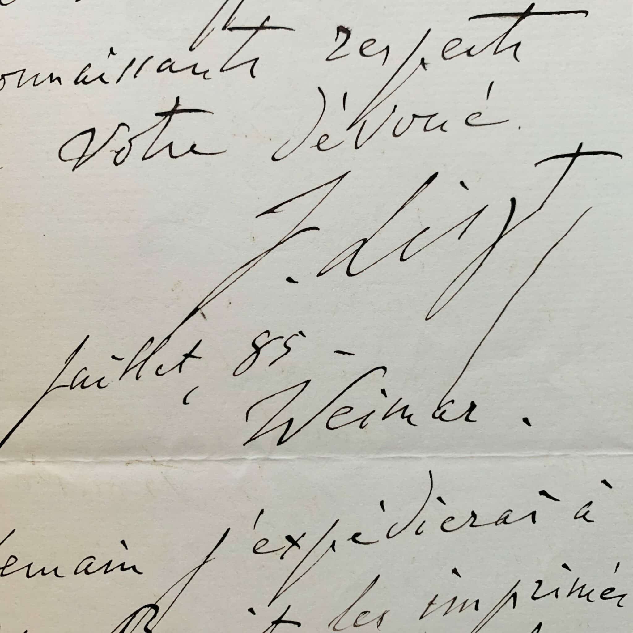 Franz Liszt (Raiding, 1811/1886)Jolie lettre de Franz Liszt, âgé, écrite après son séjour lors de l'exposition Universelle d'Anvers de 1885. Il en était l'invité d'honneur, et supervisa une série de concerts (certains dirigés par le chef d'orchestre Franz Servais) donnés dans le cadre du Congrès Musical International d'Anvers (intégré à l'Exposition Universelle). Il reçut un accueil triomphal. On le présenta à la reine des Belges ; le 8 juin, en l'église Saint-Joseph, il assista à l'exécution de sa Messe pour voix et orgue sous la direction de Peter Benoit. Victor Lynen et son épouse Marie, donnèrent pour l'occasion de grandes réceptions mondaines.