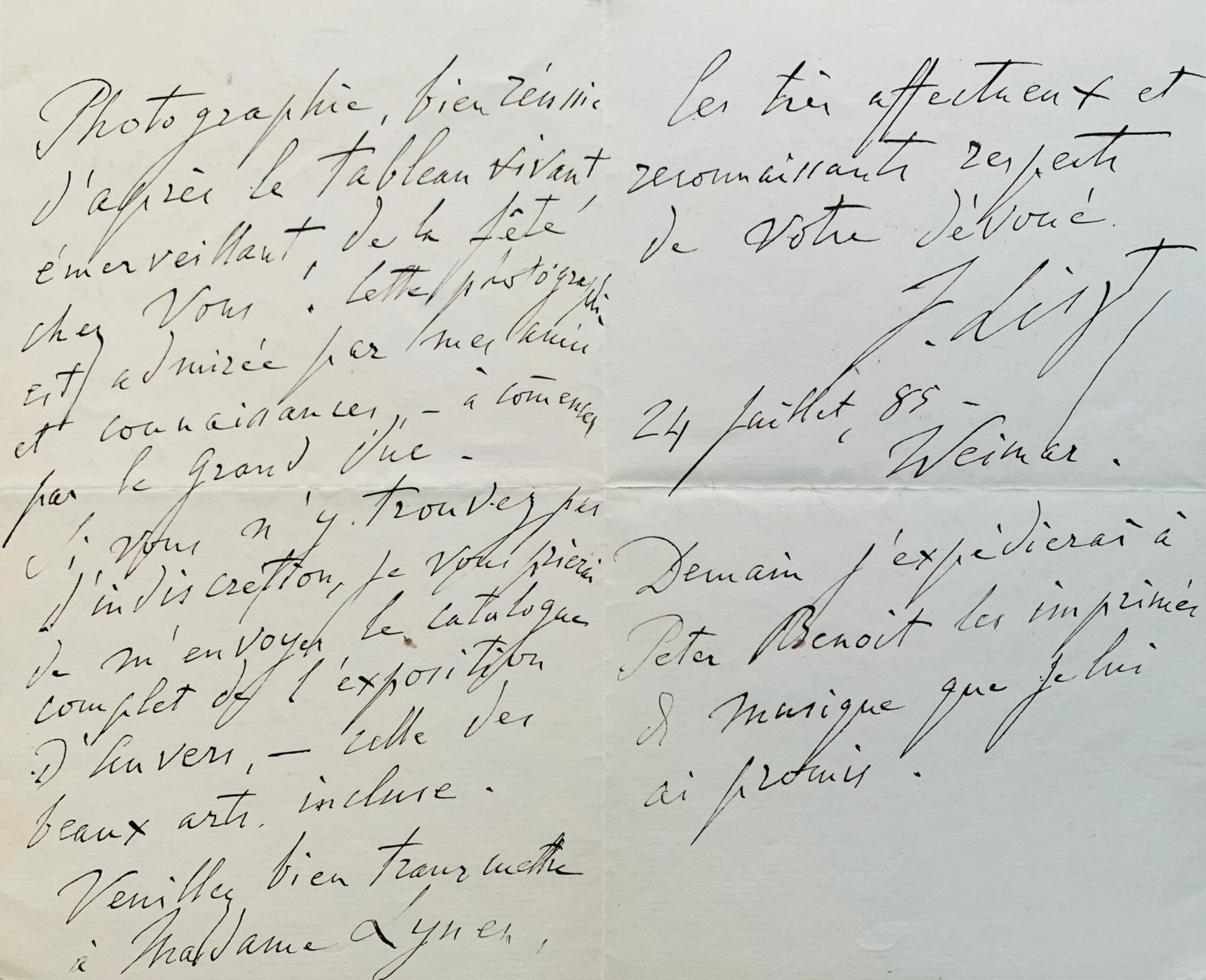 "Bienveillant ami, même à distance, vous me continuez votre excellente hospitalité d'Anvers. Pardonnez-moi de vous remercier si tard de votre envoi du Luminaire, des friandises (qu'en allemand on nomme "Delicatessen") et surtout de la grande photographie, bien réussie d'après la tableau vivant, émerveillant, de la fête chez vous. Cette photographie est admirée par mes amis et connaissances - à commencer par le Grand Duc. Si vous n'y trouvez pas d'indiscrétion, je vous prierai de m'envoyer le catalogue complet de l'exposition d'Anvers - celle des beaux-arts incluse. Veuillez bien transmettre à madame Lynen les très affectueux et reconnaissants respects de votre dévoué F. Liszt". Il ajoute en postscriptum : "Demain j'expédierai à Peter Benoit les imprimés de musique que je lui ai promis" [Peter Benoit (1834-1901), compositeur belge].