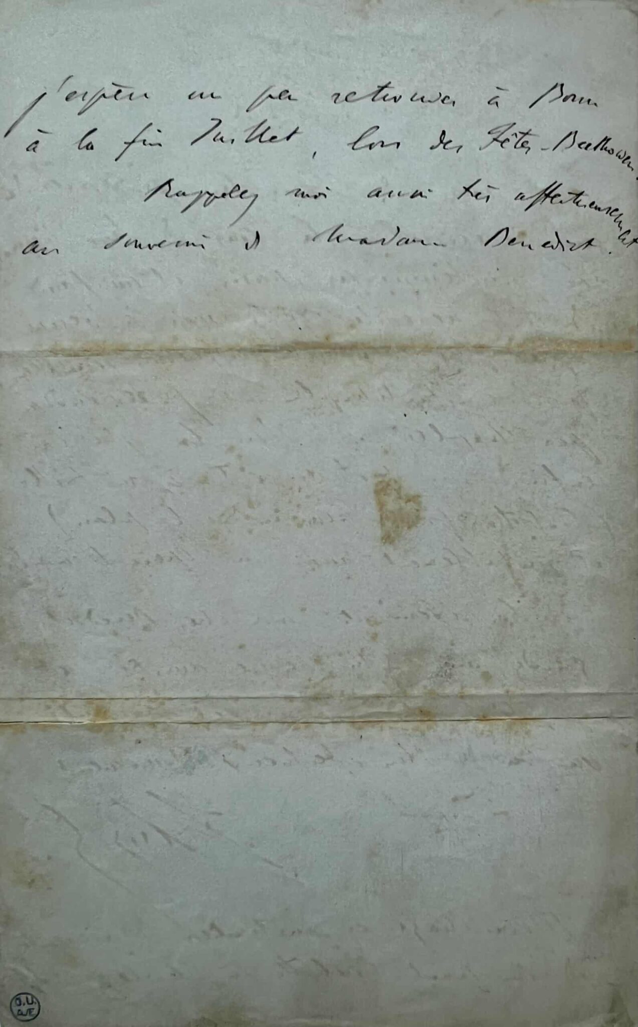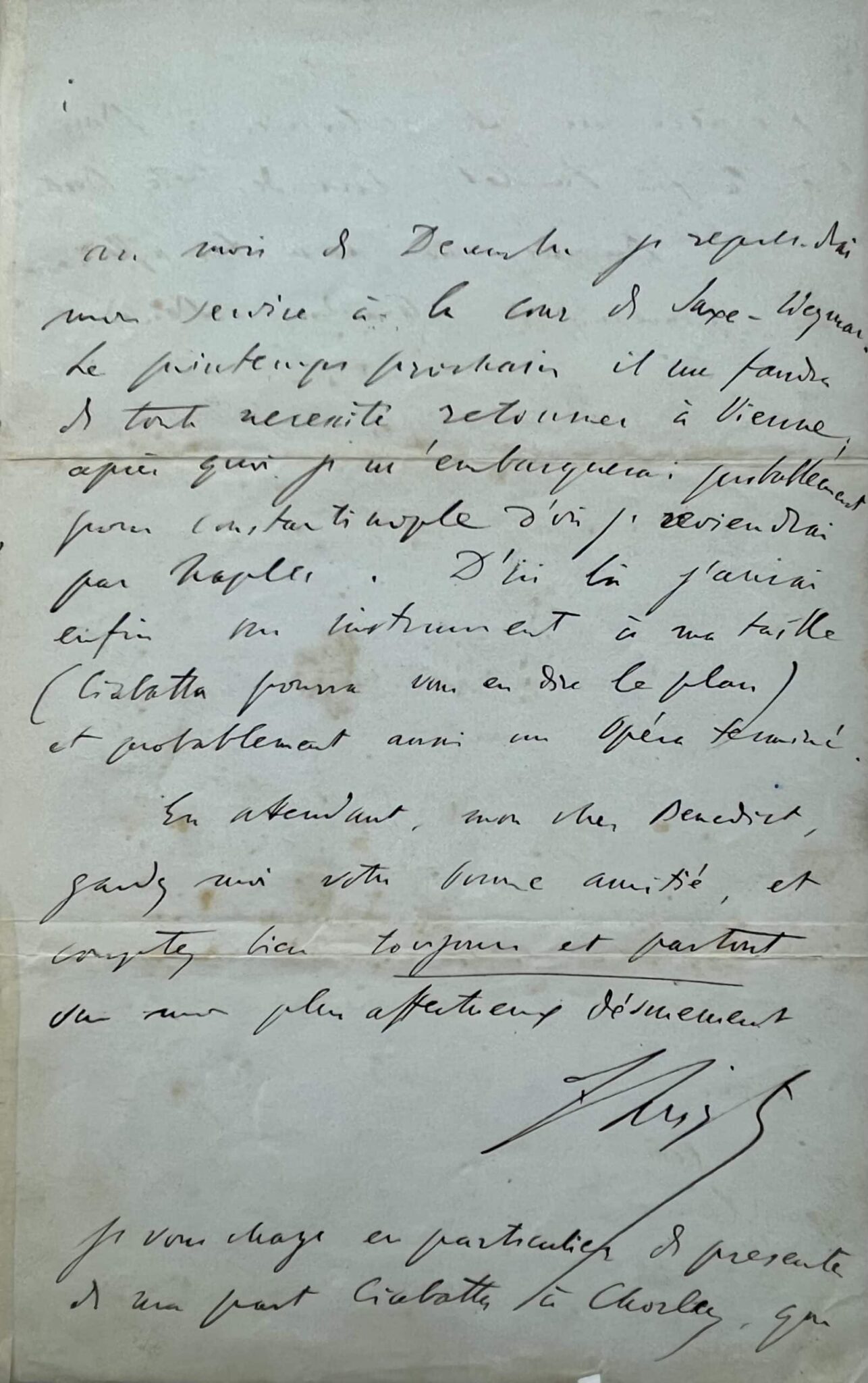 " En chargeant Mr Ciabatta de vous remettre ces lignes, ce n'est pas une simple recommandation d'obligeance que je viens vous faire, c'est un véritable service d'ami à ami que je réclame de vous. Ainsi que je viens de l'écrire à d'Orsay, Ciabatta est à la fois un charmant et fashionable artiste, chantant avec une méthode parfaite, excellent musicien et un bon pianiste, – et un garçon d’une éducation brillante, parfaitement délicat et comme il faut, très au courant des façons de la bonne compagnie de Rome, Paris et St Petersbourg, où il a passé un an demeurant chez le Prince Grégoire Wolkonsky". Il a accompagné Liszt pendant sa tournée en Espagne et au Portugal, où il a reçu bon accueil. Liszt espère que, grâce à Benedict, "les brouillards de Londres se résolveront en pluie bienfaisante dans sa bourse". Liszt, quant à lui, n’a pas "le courage de revenir à Londres", bien que "les Canards de plusieurs journaux de musique" le disent invité "par je ne sais quel Congrès ! de pianistes". "Au mois de juillet [1845], j'irai à Bonn pour l’inauguration du monument de Beethoven, et au mois de décembre je reprendrai mon service à la cour de Saxe-Weymar. Le printemps prochain, il me faudra de toute nécessité retourner à Vienne, après quoi je m’embarquerai probablement pour Constantinople, d’où je reviendrai par Naples. D’ici là, j’aurai enfin, un instrument à ma taille (Ciabatta pourra vous en dire le plan) et probablement un opéra terminé [...]. En attendant, mon cher Benedict, gardez-moi votre bonne amitié [...]. J'espère un peu retourner à Bonn à la fin de juillet, lors des Fêtes-Beethoven [...]". Signature « F. Liszt ».