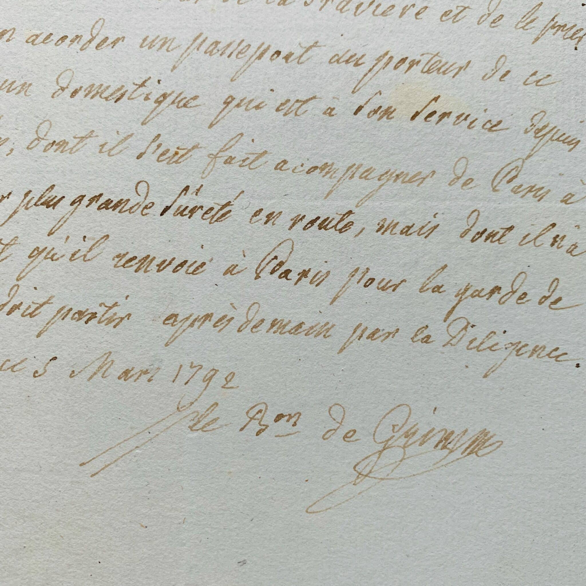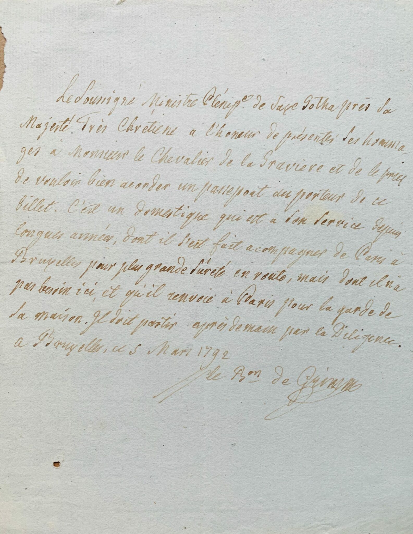 "Le soussigné ministre plénip[otentiaire] de Saxe Gotha près Sa Majesté Très Chrétienne a l'honneur de présenter ses hommages à monsieur le Chevalier de La Gravière [résident de France à Bruxelles] et de le prier de vouloir bien accorder un passeport au porteur de ce billet. C'est un domestique qui est à son service depuis [de] longues années, dont il s'est fait accompagner de Paris à Bruxelles pour plus de sûreté en route, mais dont il n'a pas besoin ici, et qu'il renvoie à Paris pour la garde de sa maison. Il doit partir après-demain par la diligence".