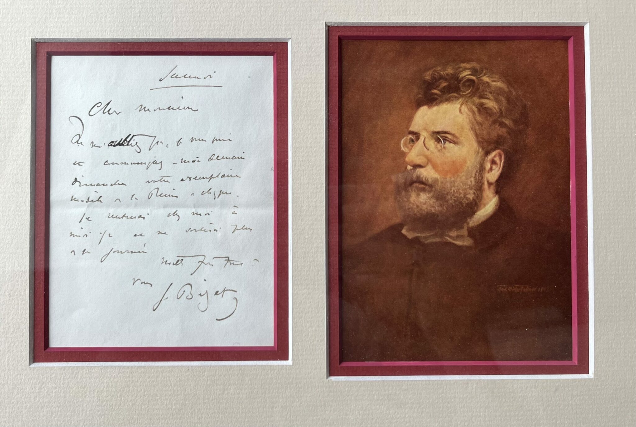 Georges Bizet (Paris, 1838/1875)Charmante lettre de Georges Bizet, encadrée avec un portrait en regard. Environ 27 x 35,5 cm.