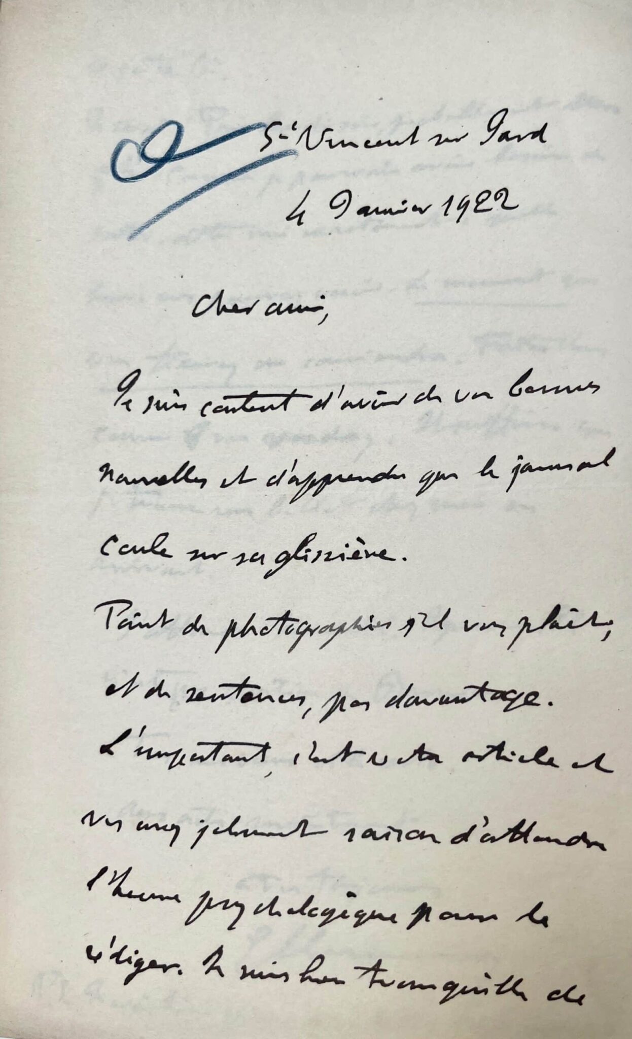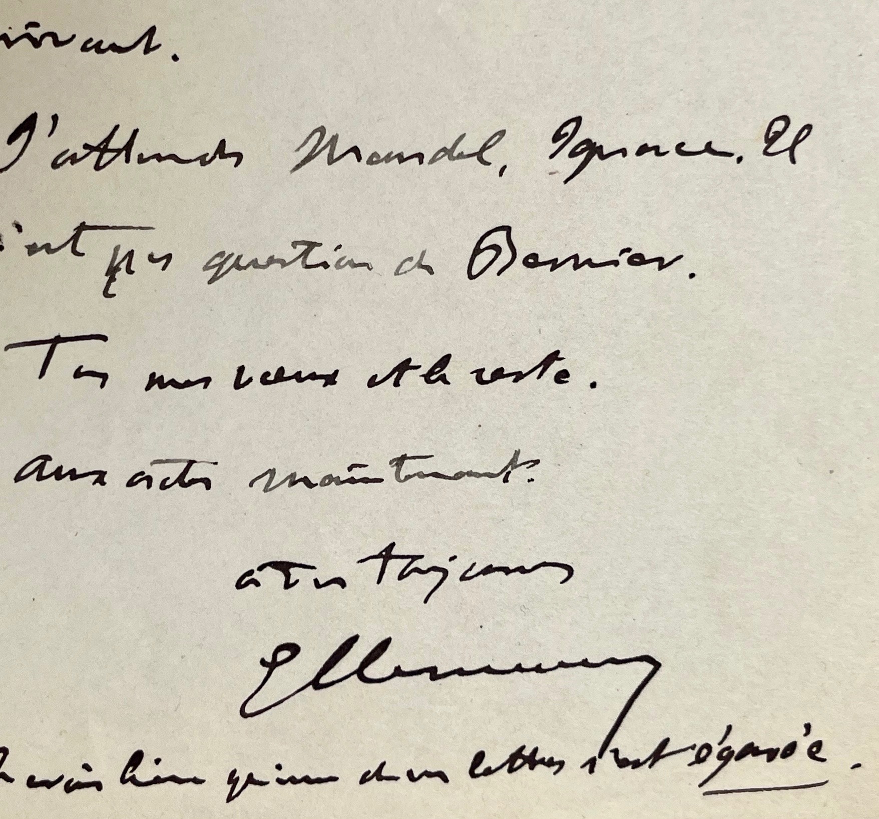 Georges Clemenceau (Mouilleron-en-Pareds, 1841/1929)"Cher ami, je suis content d'avoir de vos bonnes nouvelles et d'apprendre que le journal coule sur ses glissières. Point de photographies s'il vous plaît ; et de sentences, pas d'avantage. L'important c'est votre article et vous avez pleinement raison d'attendre l'heure psychologique pour le rédiger. Je suis bien tranquille de ce côté là".