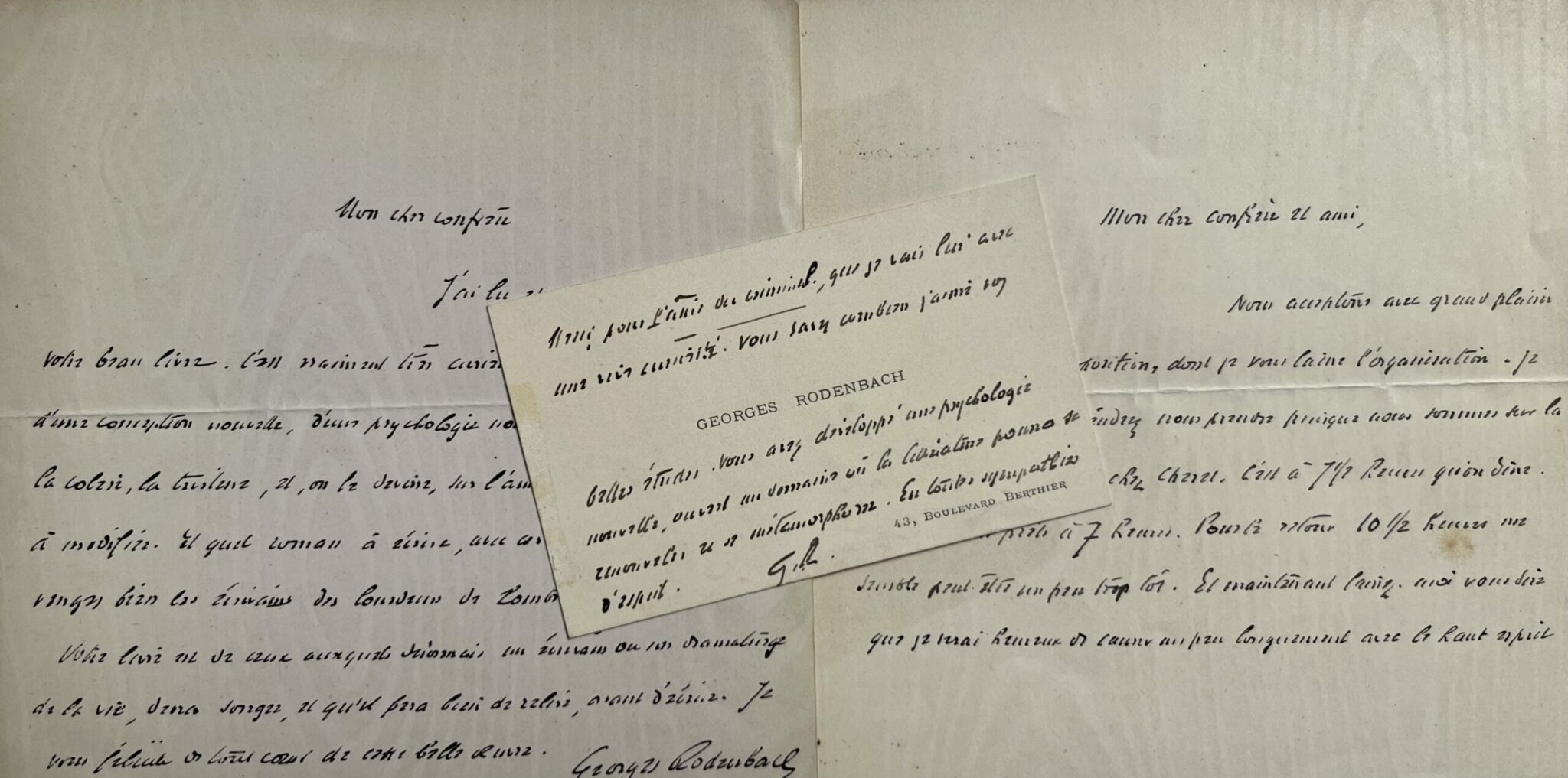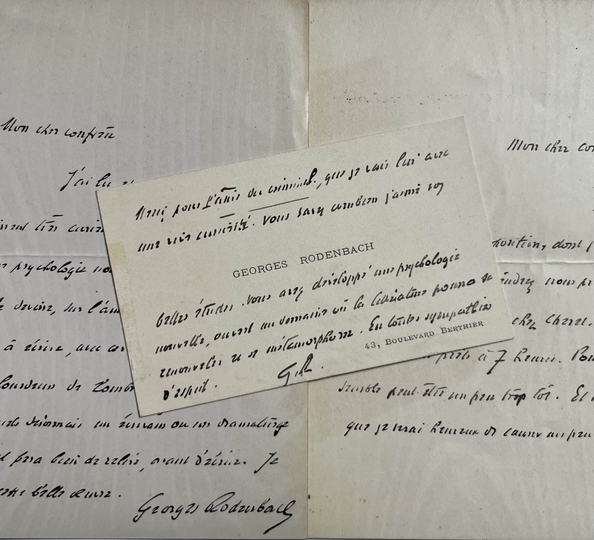 Il est joint une carte de visite A.S., au même. Rodenbach remercie Maurice de Fleury pour son ouvrage "L'âme du criminel" qu'il a lu avec curiosité. "Vous savez combien j'aime vos belles études. Vous avez développé une psychologie nouvelle, ouvert un domaine où la littérature pourra se renouveler et se métamorphoser [...]".