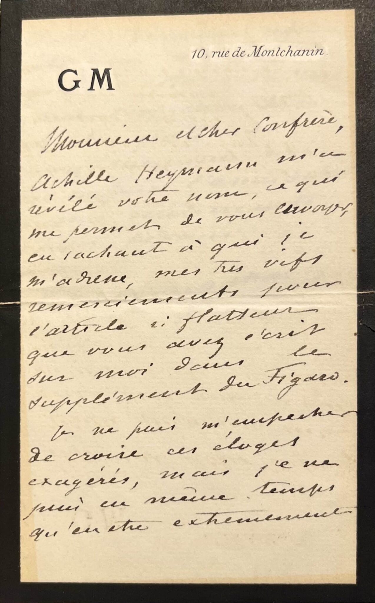 "Achille Heymann [le libraire éditeur] m'a révélé votre nom, ce qui me permet de vous envoyer, en sachant à qui je m'adresse, mes très vifs remerciements pour l'article si flatteur que vous avez écrit sur moi dans le supplément du Figaro. Je ne puis m'empécher de croire ces éloges exagérés, mais je ne puis en même temps qu'en être extrêmement flatté, car aucune relation entre nous n'avait pu agir sur votre opinion. Avec l'expression de ma profonde gratitude, recevez, Monsieur et cher confrère, l'assurance de mes sentiments dévoués".