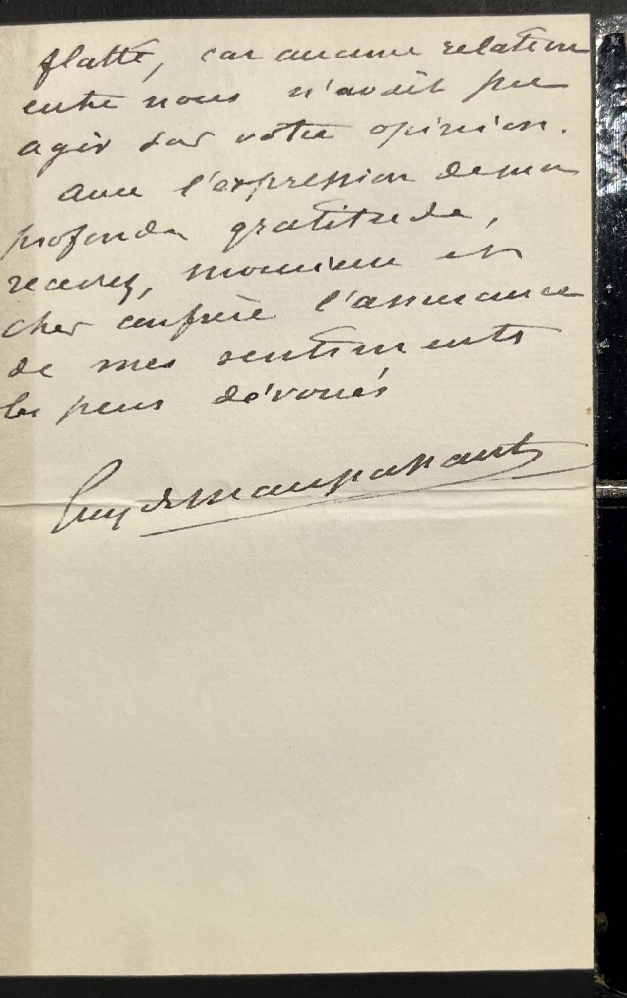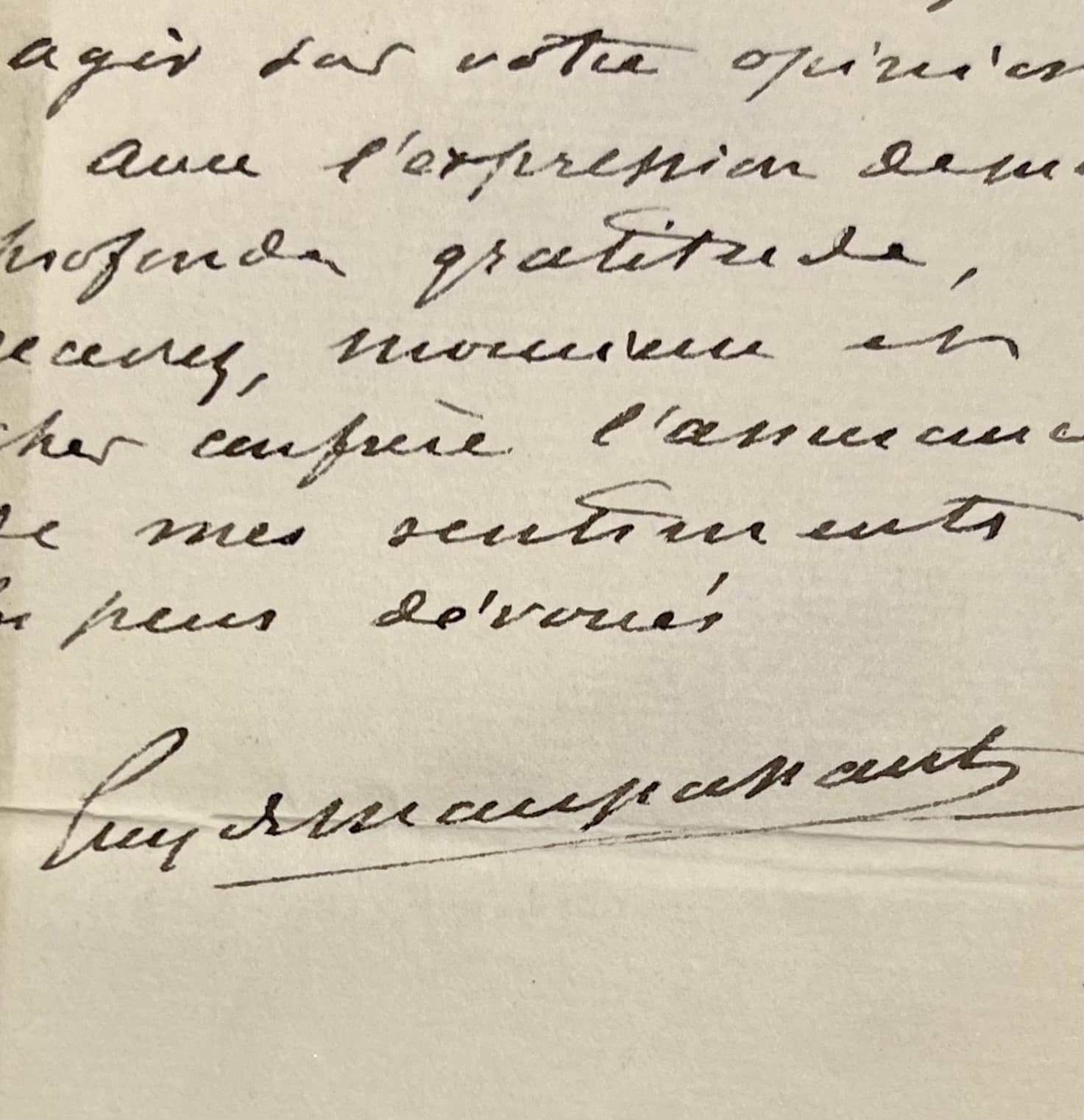 Guy Maupassant (de) (Tourville-sur-Arques, 1850/1893)Maupassant remercie un confrère pour l'article très flatteur paru dans le Figaro.