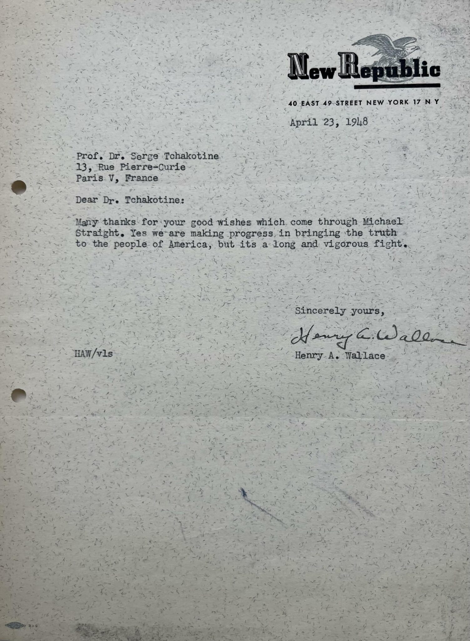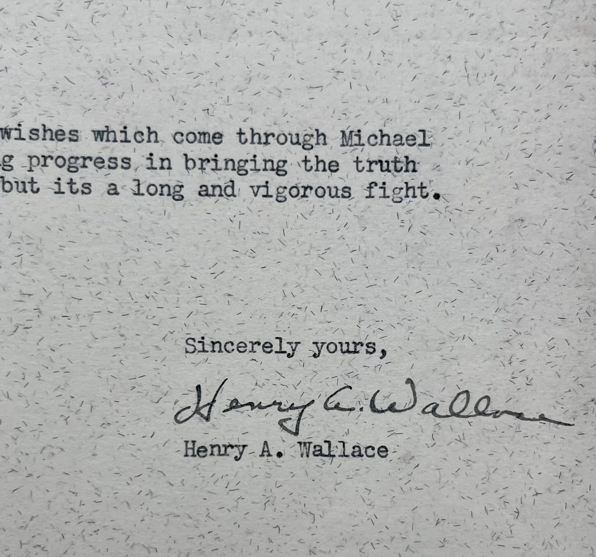 Transcription : "Many thanks for your good wishes which come through Michael Straight. Yes we are making progress, in bringing the truth to the people of America, but its a long and vigorous fight".