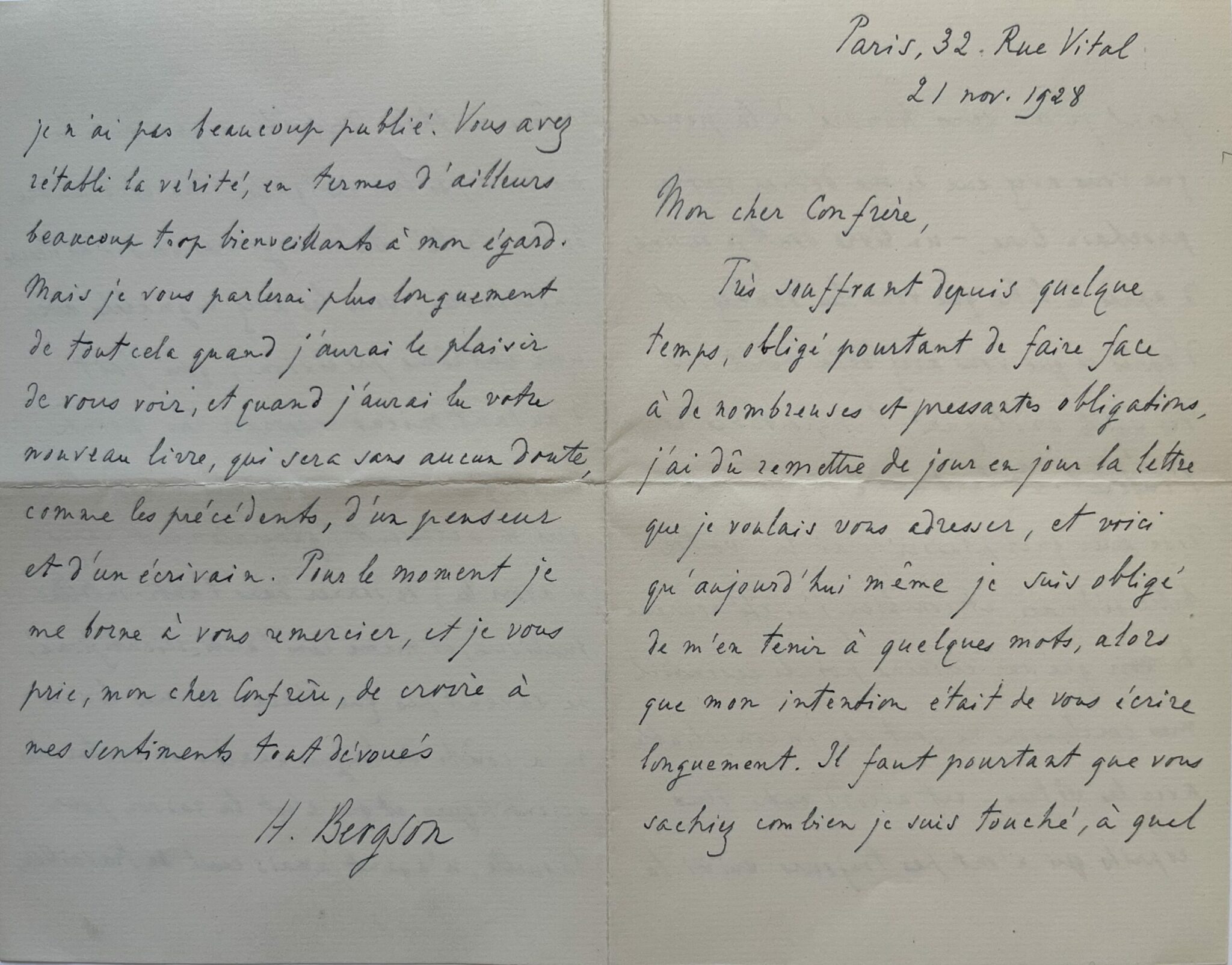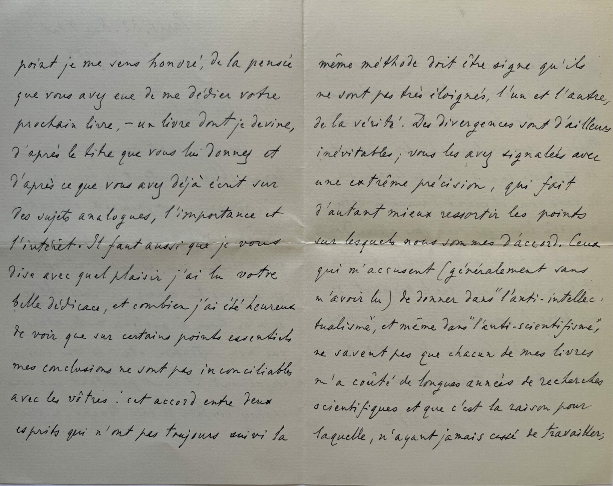 "Très souffrant depuis quelques temps, obligé pourtant de faire face à de nombreuses et pressantes obligations, j’ai dû remettre de jour en jour la lettre que je voulais vous adresser, et voici qu’aujourd’hui même je suis obligé de m’en tenir à quelques mots, alors que mon intention était de vous écrire longuement. Il faut pourtant que vous sachiez combien je suis touché, à quel point je me sens honoré, de la pensée que vous avez eu de me dédié votre prochain livre, - un livre dont je devine, d’après le titre que vous lui donnez et d’après ce que vous avez déjà écrit sur des sujets analogues, l’importance et l’intérêt. Il faut aussi que je vous dise avec quel plaisir, j’ai lu votre belle dédicace, et combien j’ai été heureux de voir que sur certains points essentiels, mes conclusions ne sont pas inconciliables avec les vôtres ! Cet accord entre deux esprits qui n’ont pas toujours suivi la même méthode doit être signe qu'ils ne sont pas très éloignés, l’un et l’autre, de la vérité. Des divergences sont d’ailleurs inévitables ; vous les avez signalées avec une extrême précision, qui fait d’autant mieux ressortir les points sur lesquels nous sommes d’accord. Ceux qui m’accusent (généralement sans m'avoir lu) de donner dans « l’anti-intellectualisme », et même dans « l’anti-scientifisme », ne savent pas que chacun de mes livres m’a coûté de longues années de recherches scientifiques, et que c’est la raison pour laquelle, n’ayant jamais cessé de travailler, je n’ai pas beaucoup publié. Vous avez rétabli la vérité, en termes d’ailleurs beaucoup trop bienveillants à mon égard. Mais je vous parlerai plus longuement de tout cela quand j’aurai le plaisir de vous voir, et quand j’aurai lu votre nouveau livre, qui sera sans aucun doute, comme les précédents, d’un penseur et d’un écrivain [...]".