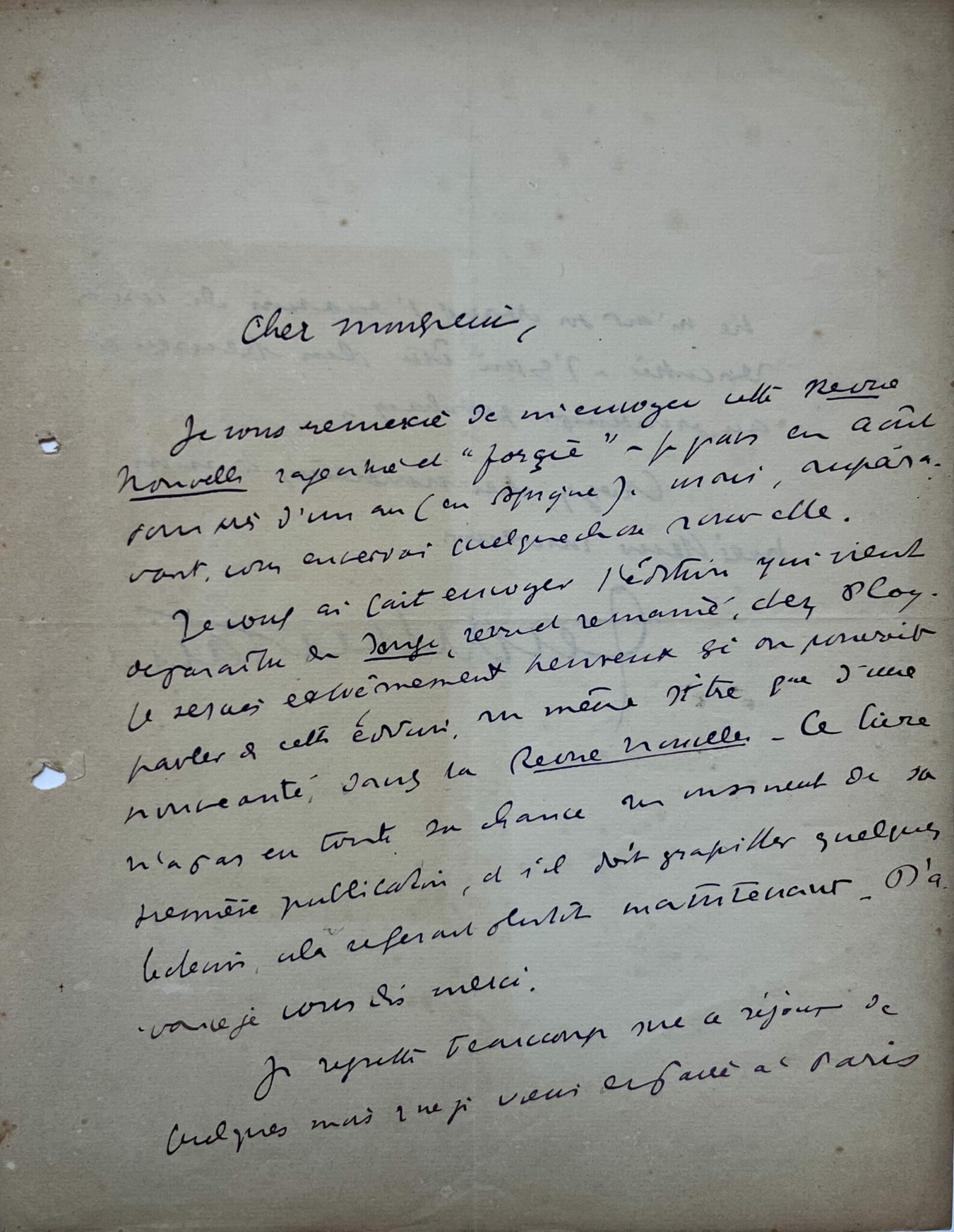 Henry Montherlant (de) (Paris, 1896/1972)"Cher Monsieur, je vous remercie de m’envoyer cette Revue Nouvelle rajeunit et "forçie". Je pars en août pour près d’un an (en Afrique) [il ira surtout en Algérie]. Mais, auparavant, vous enverrai quelque chose pour elle. Je vous ai fait envoyer l'édition qui vient de paraître du Songe, revu et remanié, chez Plon [1930]. Je serais extrêmement heureux si on pouvait parler de cette édition, au même titre que d’une nouveauté dans la Revue Nouvelle. Ce livre n’a pas eu toute sa chance au moment de sa première publication [...]". Il regrette de ne pas avoir le rencontrer lors de son séjour parisien qui s'achève.