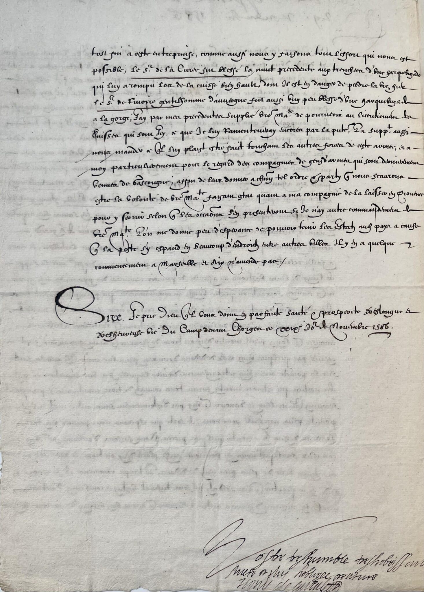 Quant à lestat de ce siege la place est tellement composée et garnie de si grand nombre d’hommes que nous ny avons encore guère peu avancé avec l’artillerie, et nous a fallu resouldre de les approcher par tranchées pour nous rendre maistres avec la sappe de lung de leurs bastions ou a faulte de pouvoir recouvrer des pyonnières n’en ayant eu qu’environ soixante ou quatre vingts au commencement qui peu à peu se sont tous desrobbéz, chacun de ceste armée a mis la main de sorte que nous sommes logés sur le bord de leur fossé au droict de l’ung de leurs bastions que l’artillerie a tellement émoussé que l’on peult monter deux ou trois de front et que aiant hier au soir faict essaier par quelques ungz ceulx de dedans donnèrent feu à une mine quilz avoient faicte sur la poincte aiant un retranchement derrière laquelle feu une ouverture ou ceulx des nostres qui estoient montez furent tous couvertz de terre, neantmoins si promptement secouruz quil ne leur en demeure que ung peu d’estonnement sans autre mal et ladicte poincte plus accessible pour nous, de sorte que esperons nous pouvoir bien tost loger au dessus et y monter quelques pièces. Nous faisons d’ailleurs faire ung cavalier sur lequel nous en pourrons aussy placer deux ou trois, et avec ces avantages veoir de plus près ceulx de dedans. Le temps commence de se rendre si rude en ce quartier que les soldatz qui sont tres mal vestuz et combattuz d’autres necessitez, meurent d’heure à autre, tellement que avons bon besoing de mettre bien tost fin a ceste entreprinse, comme aussy nous y faisons tout l’esfort qui nous est possible, le sieur de La Curée fust blessé la nuict précédente aux tranchées d’une arquebuzade qui luy a rompu l’os de la cuisse bien hault dont il est en danger de perdre la vie, hier le Sr de Rivoire gentilhomme d’auvergne fut aussi ung peu blessé d’une arquebuzade à la gorge. J’ay par mes précédentes supplié vostre majesté de pourvoir au licentiement des Suisses qui sont icy, ce que je luy ramenteneray encore par la présente, la suppliant aussy nous mander ce qu’il luy plaist estre faict touchant les autres forces de ceste armée, et à moy particulièrement pour le regard des compagnies des gens d’armes qui sont dernièrement venues en Gascoigne, affin de leur donner tel ordre et party que nous scaurons estre la volonté de vostre majesté faisant estat quant à ma compagnie de la laisser en Provence pour y servir selon que les occasions se présenteront si je n’ay autre commandement de vostre Majesté l’on me donne peu d’espérance de pouvoir tenir les estatz audit pays à cause que la peste s’y respand en beaucoup d’endroictz entre autres villes il y en a quelque commencement à Marseille et Aix n’amende pas. Sire, je prie dieu quil vous (?) en parfaicte santé et prospérité de tres longue et tres heureuse vie. Du camp devant Chorges ce xxixe jour de novembre 1586".
