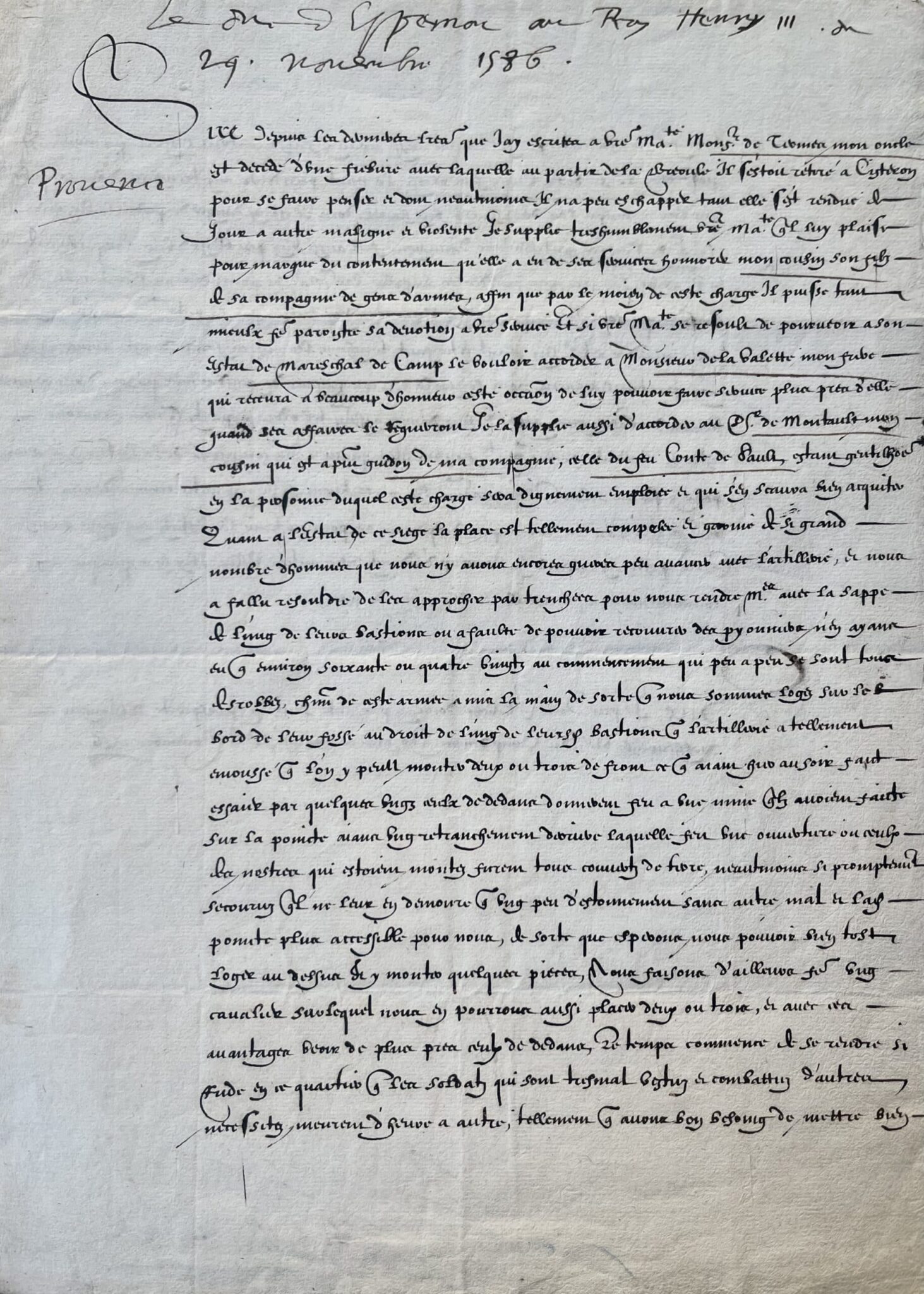 "Sire, depuis les dernières lettres que jay escriptes à vostre Majesté, mon. de Termes mon oncle est décédé d’une fiebvre avec laquelle au partir de la Breoule [La Breole, Alpes-de-Haute-Provence ; en octobre 1586, le duc d’Epernon fit le siège du château défendu par les Protestant de Lesdiguières] il sestoit retiré à Cisteron [Sisteron] pour se faire penser et dont neantmoins il n’a peu eschapper tant elle est rendue de jour à autre maligne et violente. Je supplie tres humblement vostre majesté quil luy plaise pour marque du contentement quelle a eu de ses services honorer mon cousin son filz de sa compagnie de gens darmes afin que par le moien  de ceste charge il puisse tant mieulx faire paroistre sa dévotion à vostre service et si vostre majesté se resoult de pourvoir à son estat de mareschal de camp le vouloir accorder à monsieur de La Valette mon frere [Bernard de Nogaret] qui recevra a beaucoup d’honneur ceste occasion de luy pouvoir faire service plus près d’elle quand ses affaires le requeront. Je la supplie d’accorder aussy au Sieur de Montault mon cousin qui est à présent guidon de ma compagnie, celle du feu comte de Sault, estant gentilhomme en la personne duquel ceste charge sera dignement emploiée et s’en scaura bien dignement acquiter.