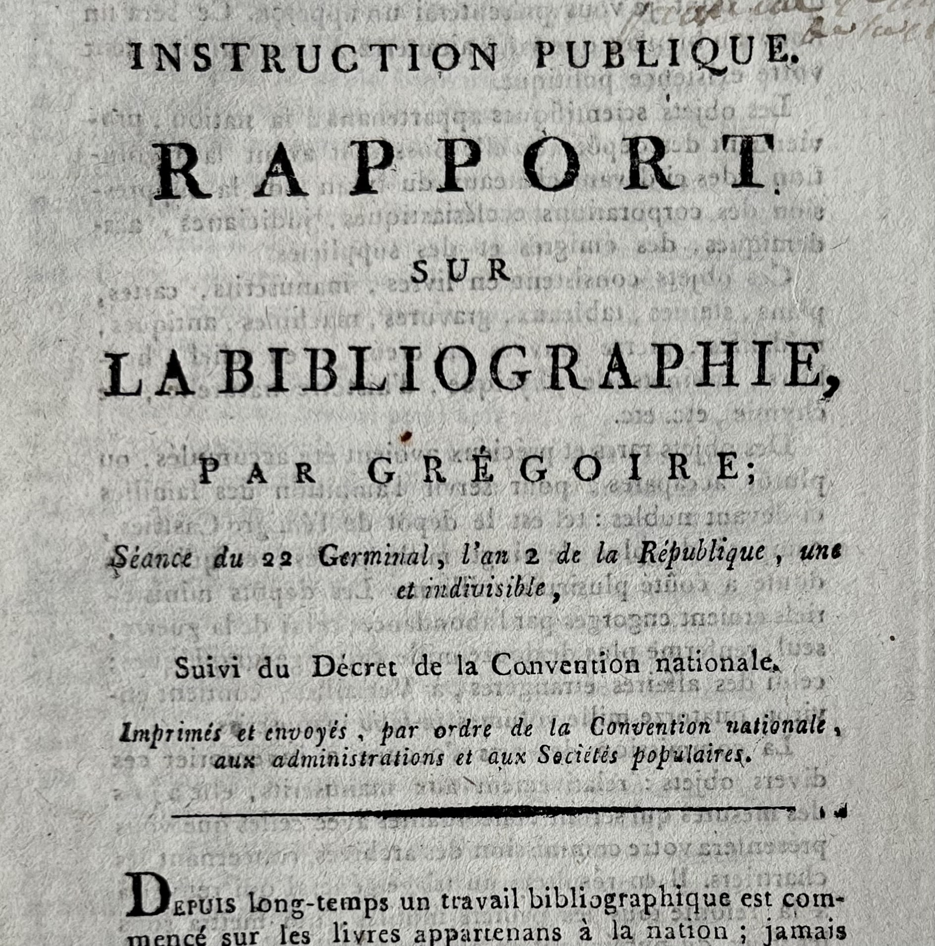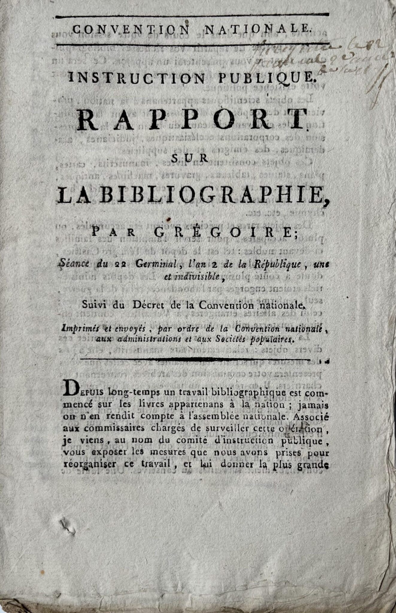 Imprimé de l’abbé Grégoire intitulé « Rapport sur la bibliographie », du 22 germinal an 2 (1794)