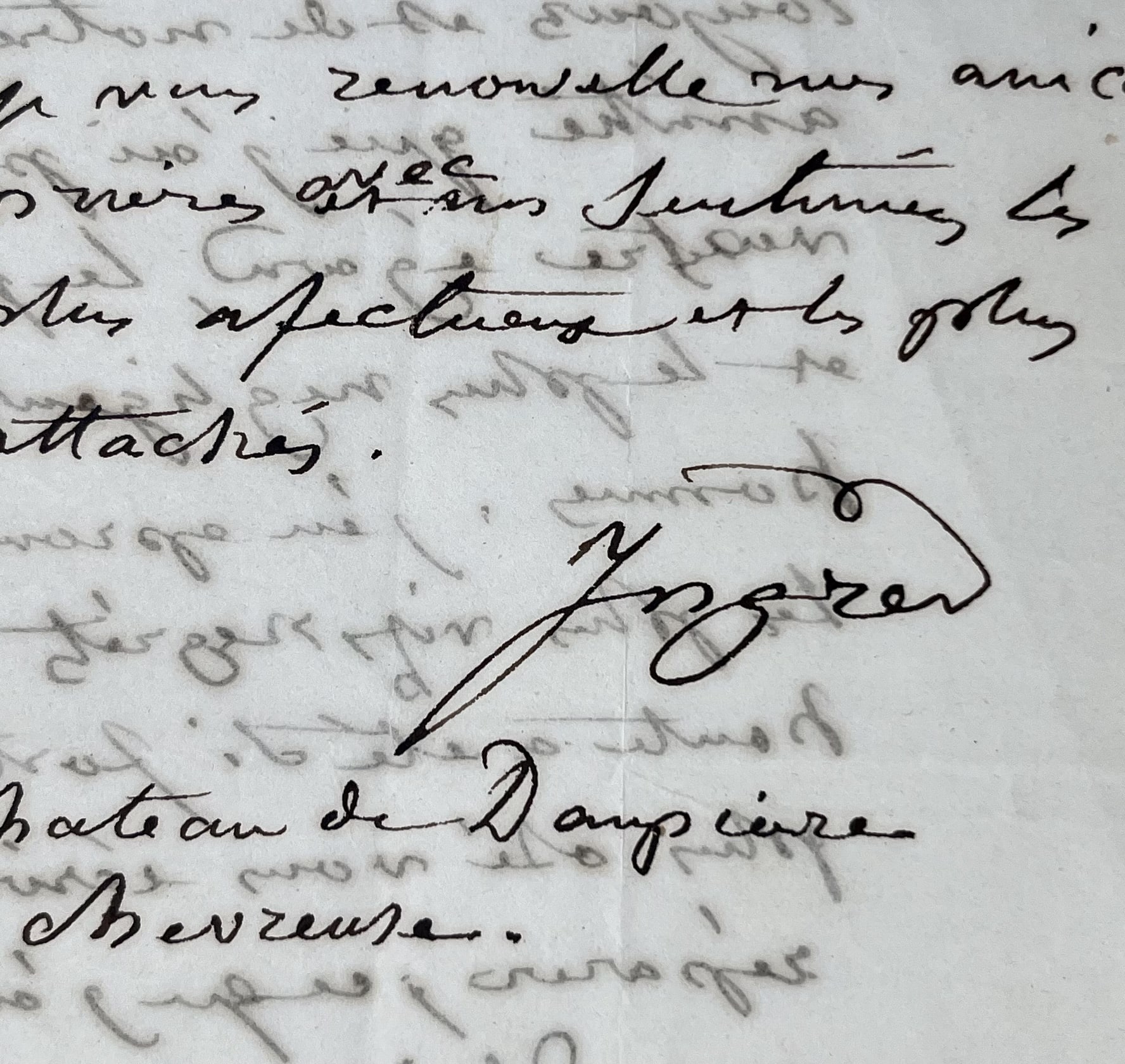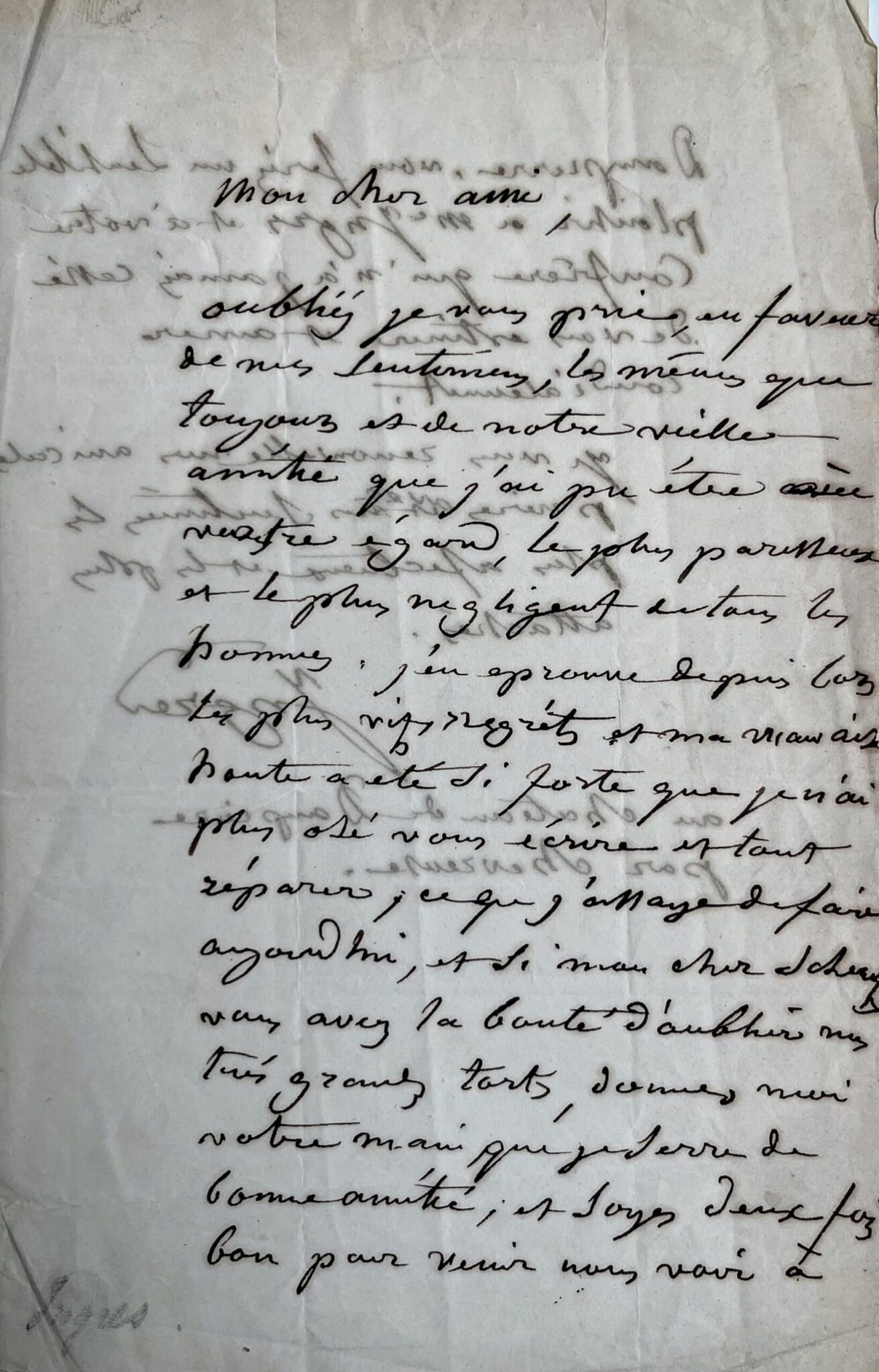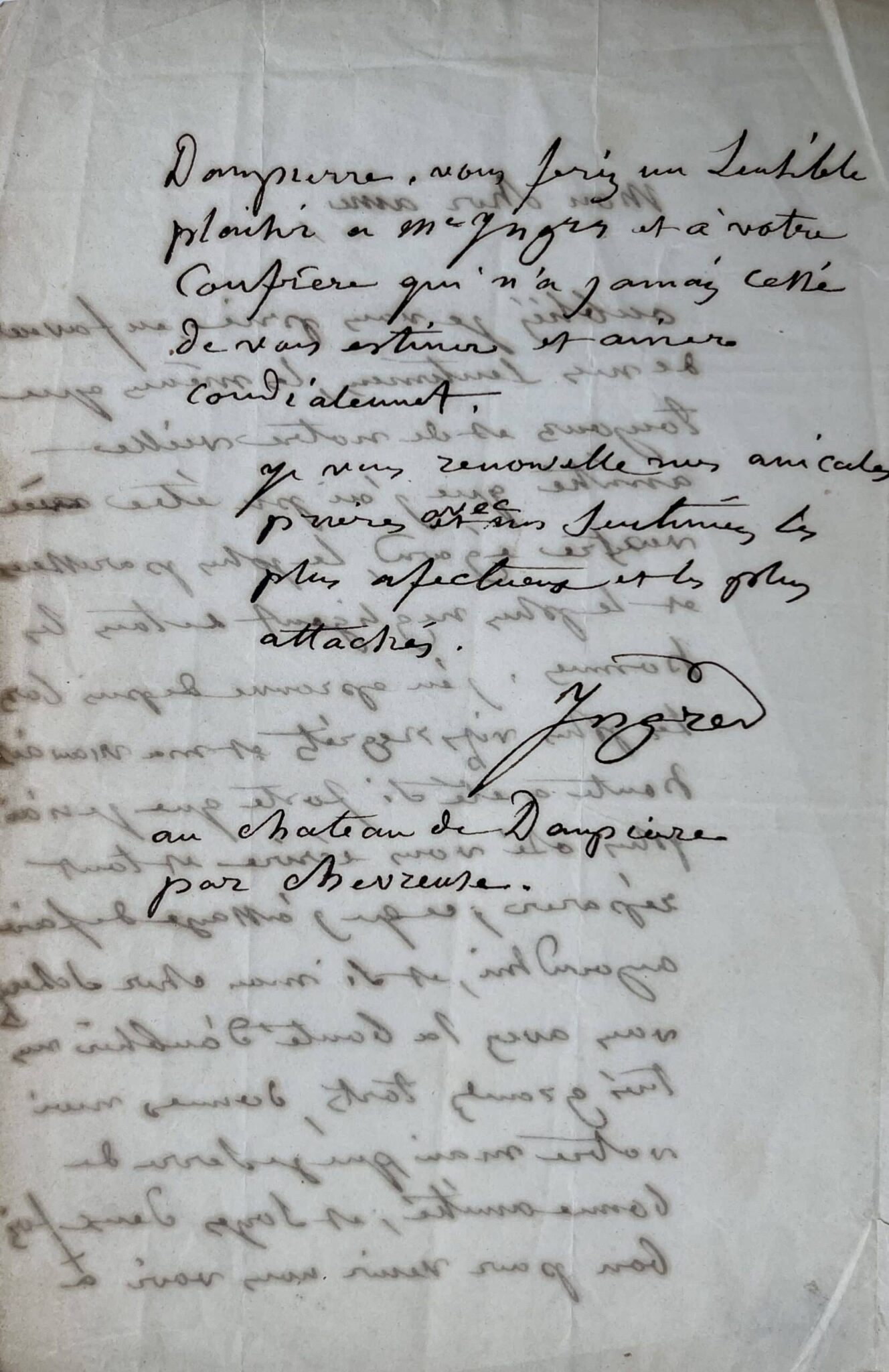 "Mon cher ami, oubliez, je vous prie, en faveur de mes sentiments, les mêmes que toujours, et de notre vie amitié que j’ai pu être à votre égard, le plus paresseux est le plus négligent de tous les hommes. J’en éprouve depuis lors les plus vifs regrets, et ma mauvaise honte a été si forte que je n’ai plus osé vous écrire et tout réparer, ce que j’essaye de faire aujourd’hui, et si mon cher Schaefer vous avez la bonté d’oublier mes très grands torts, donnez-moi votre main, que je serre de bonne amitié, et soyez deux fois bon pour venir nous voir à Dampierre, vous feriez un sensible plaisir à Me Ingres et à votre confrère qui n’a jamais cessé de vous estimer et aimer cordialement. Je vous renouvelle mes amicales prières avec mes sentiments les plus affectueux et les plus attachés".
