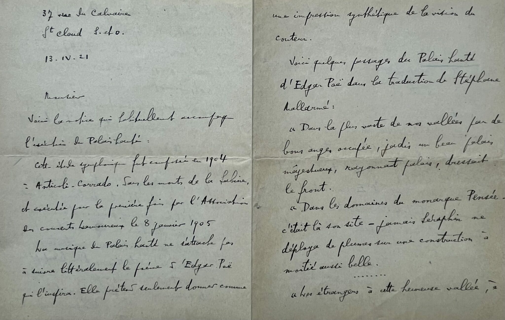 Très intéressante lettre de Florent Schmitt sur la genèse de l'une de ses toutes premières oeuvres, Le Palais Hanté, étude symphonique d'après Edgar Allan Poe. Il éclaire la lecture que l'on doit en voir.