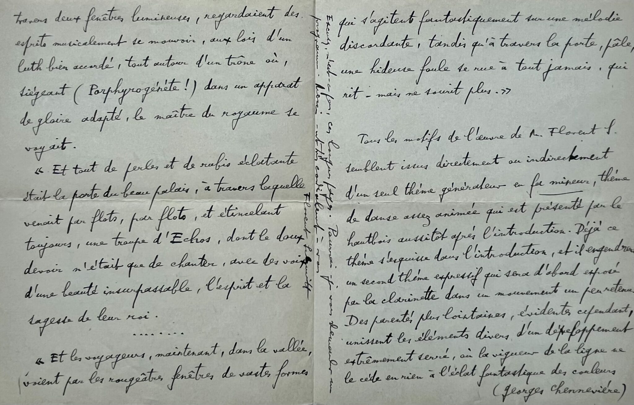 Schmitt cite ensuite Georges Chennevière : "Tous les motifs de l'œuvre de M. Florent S. semblent issus directement ou indirectement d'un seul thème générateur en fa mineur, thème de danse assez animée qui est présenté par le hautbois aussitôt après l'introduction. Déjà ce thème s'esquisse dans l'introduction, et il engendrera un second thème expressif qui sera d'abord exposé par la clarinette dans un mouvement un peu retenu. Des parentés plus lointaines, évidentes cependant, unissent les éléments divers d'un développement extrêmement serré, où la vigueur de la ligne ne le cède en rien à l'écart fantastique des couleurs". Excusez, n'est-ce pas, ces longues pages. Pourrais-je vous demander un programme. Merci".
