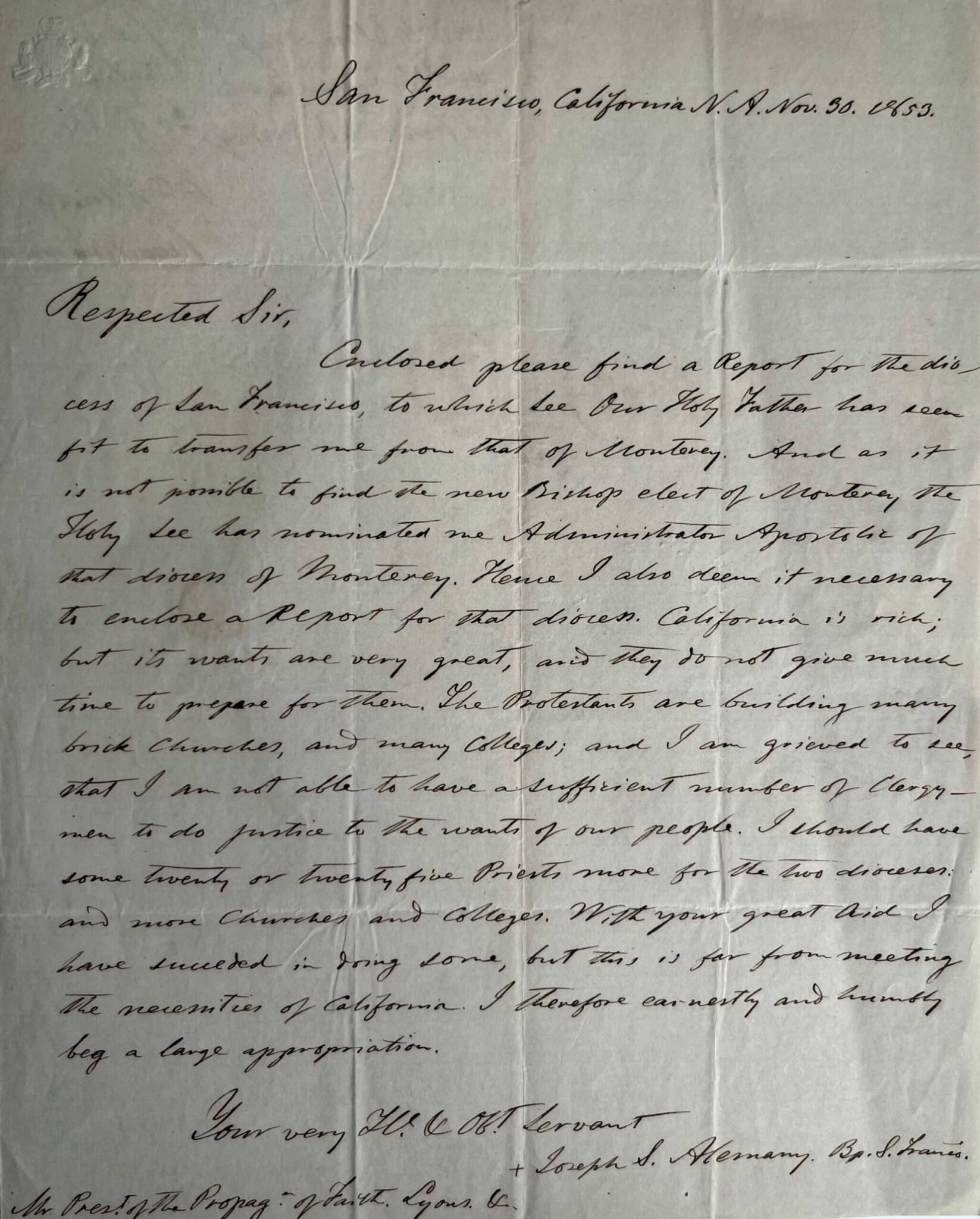 Il adresse un rapport sur le diocèse de San Francisco « to which see our Holy Father has seen fit to transfer me from that of Monterey. And as it is not possible to find the new bishop elect of Monterey the Holy see has nominated me Administrator Apostolic of that diocess of Monterey […]. California is rich; but its wants are very great, and they do not give much time to prepare of them. The protestants are building many brick churches and many colleges; and I am grieved ti see, that I am not able to have a suffisant number of clergymen to do justice to the wants of our people. I should have twenty or twenty-five priests more for the two dioceses, and more churches and colleges. With your great aid, I have succeded in doing some, but this is far from meeting the necessities of California […] ».