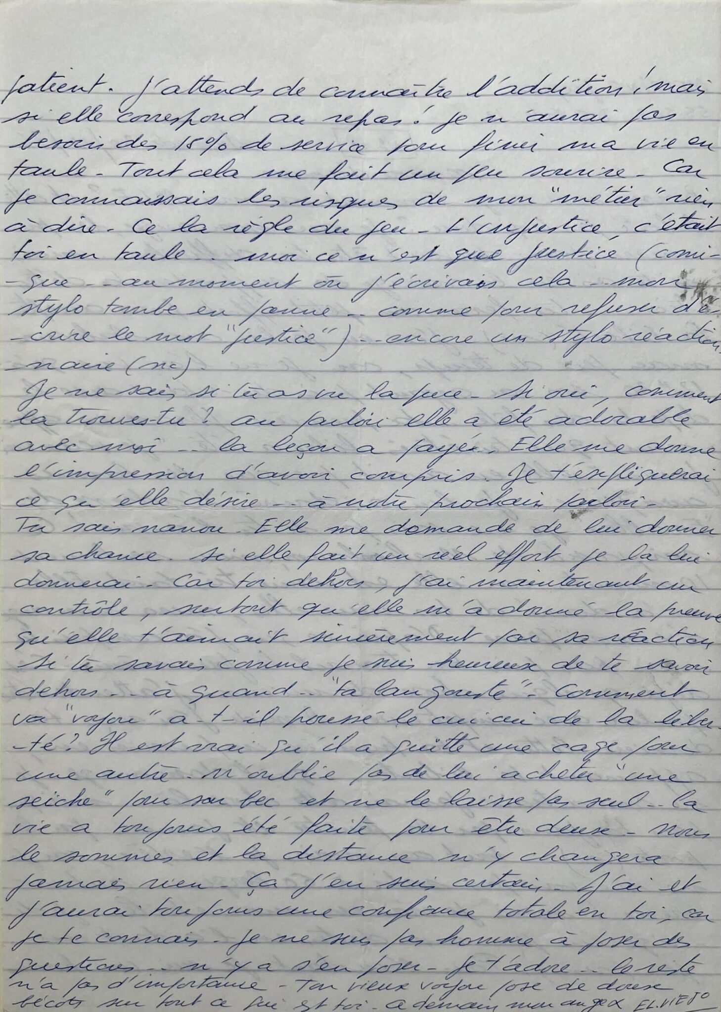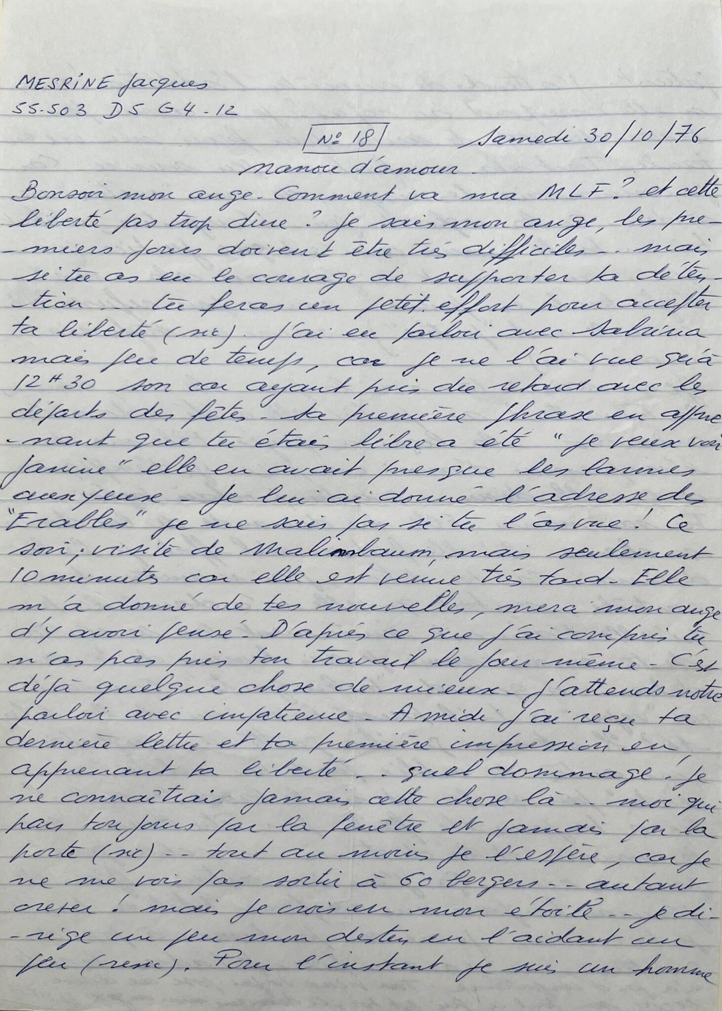 "Nanou d'amour. Bonsoir mon Ange. Comment va ma MLF ? et cette liberté par trop dure ? Je sais mon ange, les premiers jours doivent être difficiles... mais si tu as eu le courage de supporter ta détention tu feras un petit effort pour accepter ta liberté (sic). J'ai eu parloir avec Sabrina, mais peu de temps, car je ne l'ai vue qu'à 12h30 [...]. Sa première phrase en apprenant que tu étais libre a été : "Je veux voir Janine", elle en avait presque les larmes aux yeux. Je lui ai donné l'adresse des "Érables", je ne sais pas si tu l'as vue! Ce soir visite de Malimbaum, mais seulement 10 minutes car elle est venue très tard [...]. D'après ce que j'ai compris, tu n'as pas pris ton travail le jour même. C'est déjà quelque chose de mieux. J'attends notre parloir avec impatience. A midi j'ai reçu ta dernière lettre et ta première impression en apprenant ta liberté... Quel dommage ! Je ne connaîtrai jamais cette chose là... moi qui pars toujours par la fenêtre et jamais par la porte (sic)... tout au moins je l'espère, car je ne me vois pas sortir à 60 berges... autant crever ! mais je crois en mon étoile... je dirige un peu mon destin en l'aidant un peu (sic). Pour l'instant je suis un homme patient. J'attends de connaître l'addition ! mais si elle correspond au repas ! je n'aurai pas besoin des 15% de service pour finir ma vie en taule. Tout cela me fait un peu sourire. Car je connais les risques de mon "métier" rien à dire à la règle du jeu. L'injustice, c'était toi en taule... moi ce n'est que justice (comique... au moment où j'écrivais cela mon stylo tombe en panne... comme pour refuser d'écrire le mot "justice")... encore un stylo réactionnaire (sic). Je ne sais pas si tu as vu la puce. Si oui, comment la trouves-tu? au parloir elle a été adorable avec moi... la leçon a payé [...]". Il lui donne des consignes pour s'occuper de son perroquet "voyou". "J'ai et j'aurai toujours une confiance totale en toi, car je te connais. Je ne suis pas homme à poser des questions... n'y à s'en poser. Je t'adore... le reste n'a pas d'importance. Ton vieux voyou pose de doux bécots sur tout ce qui est toi. A demain, mon ange". Signée "El Viejo".